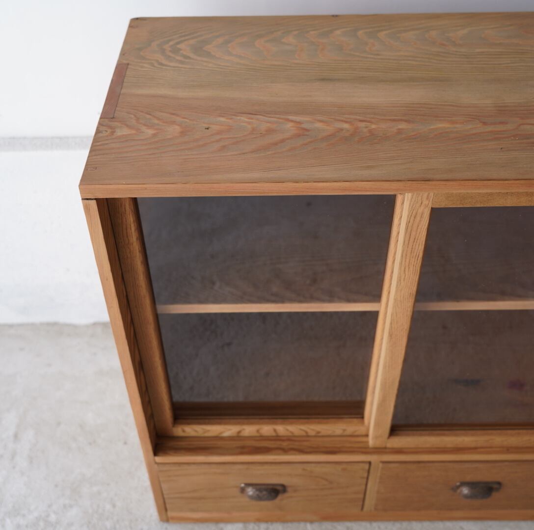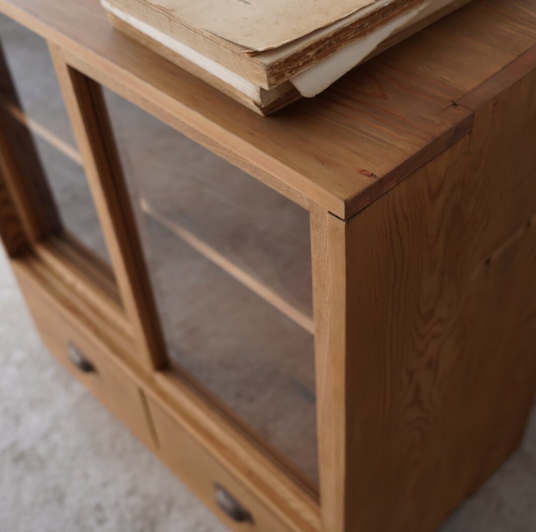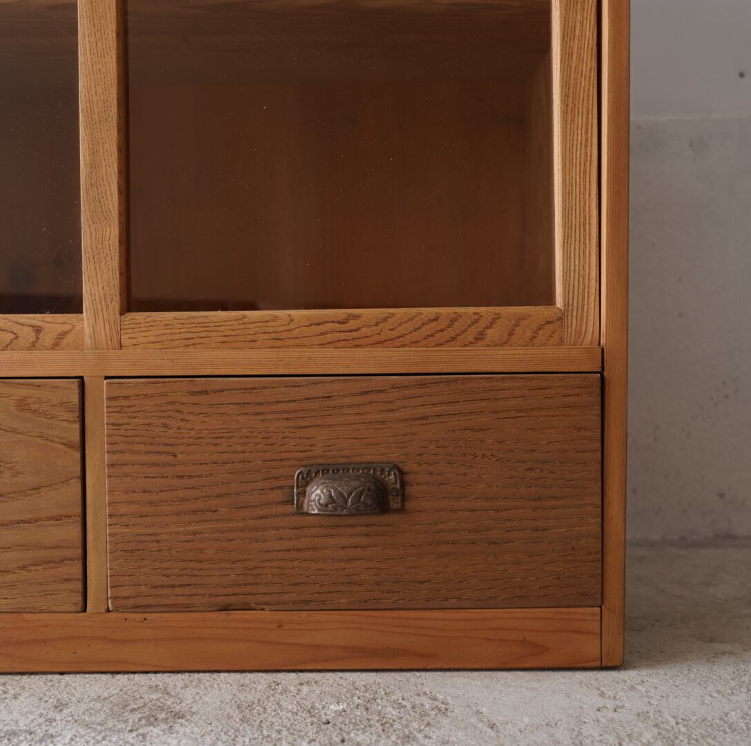 無垢材の温かみのある木味と装飾取手の引き出しが魅力的なガラス戸棚。