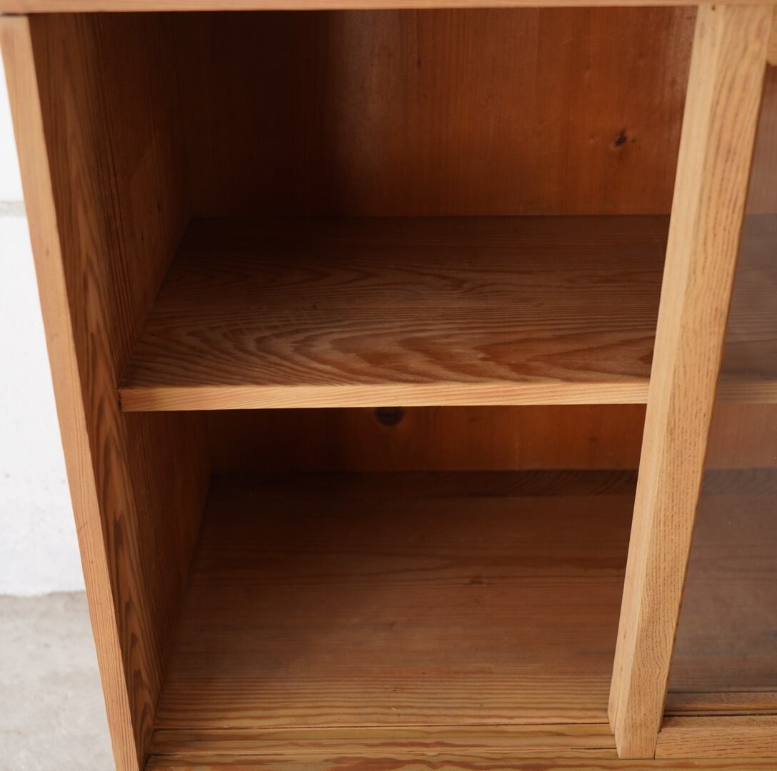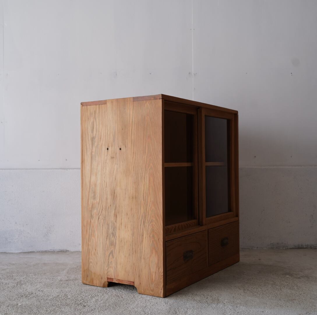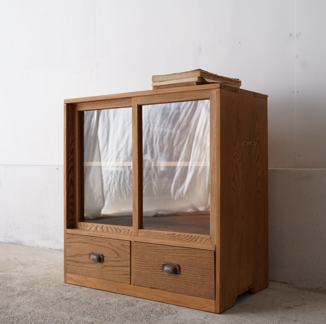 無垢材の温かみのある木味と装飾取手の引き出しが魅力的なガラス戸棚。