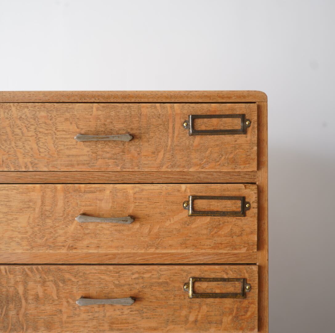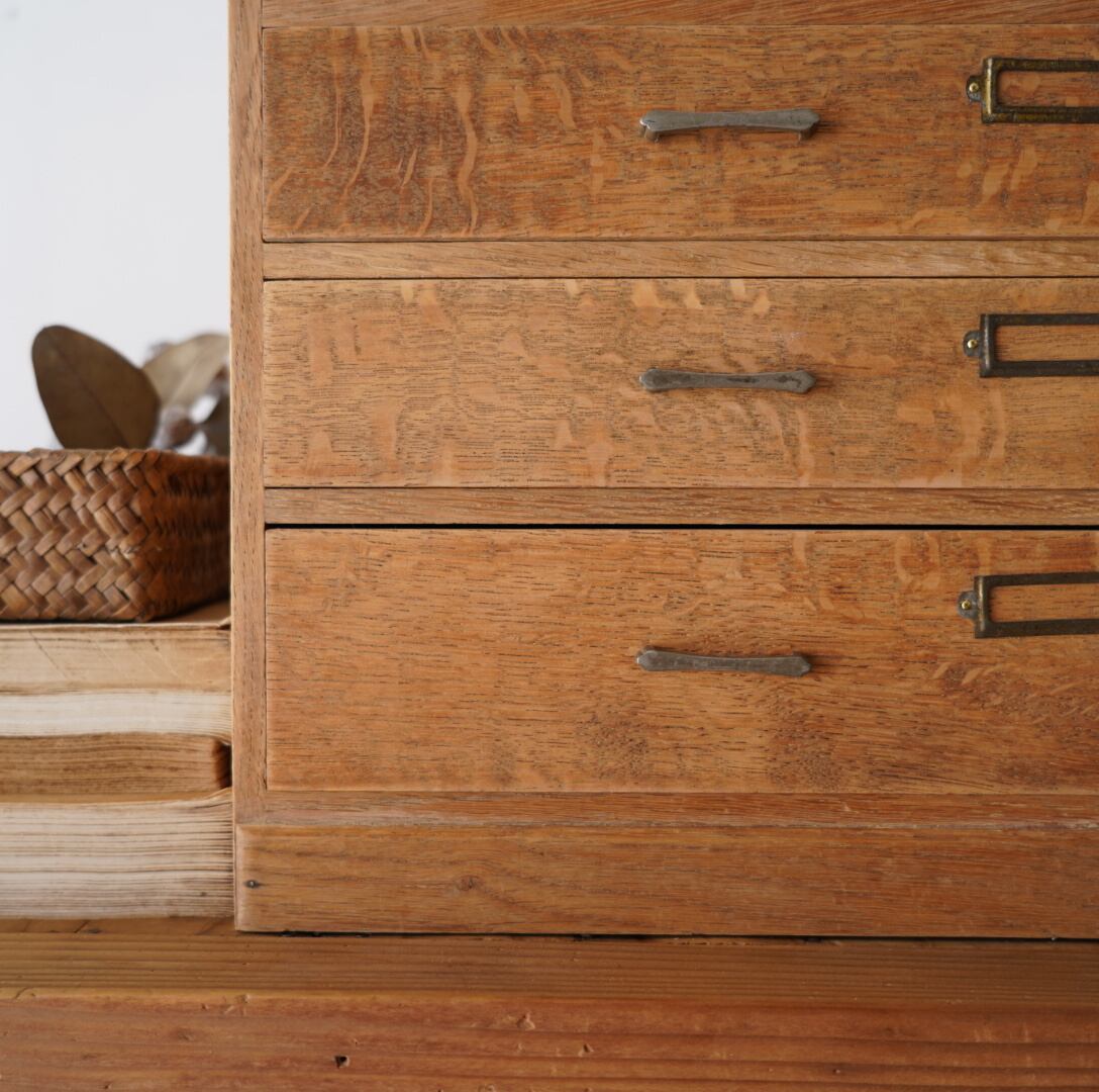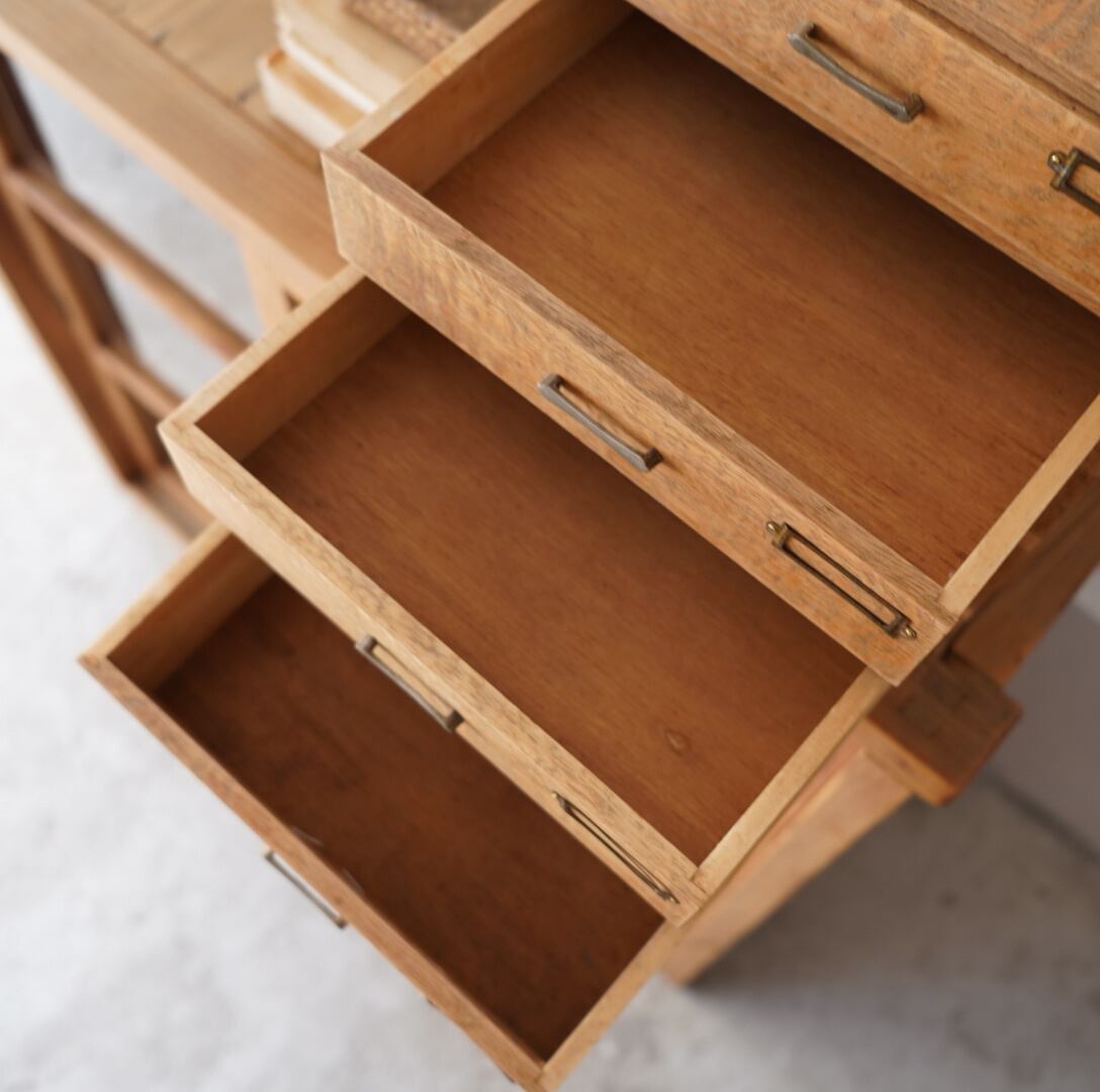 ナチュラルな木味、並んだ金属の取手とネームプレートが可愛らしい5杯の引き出し。