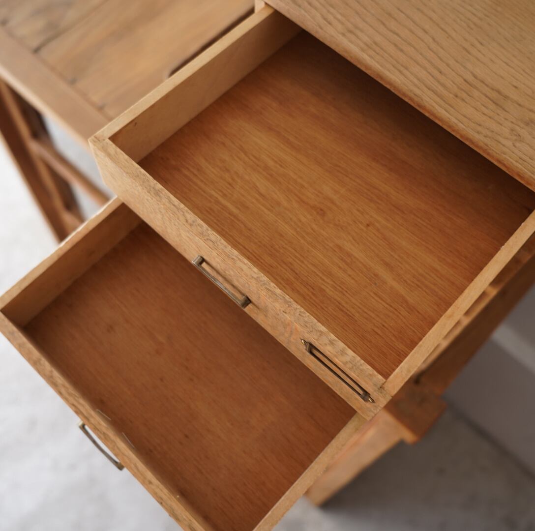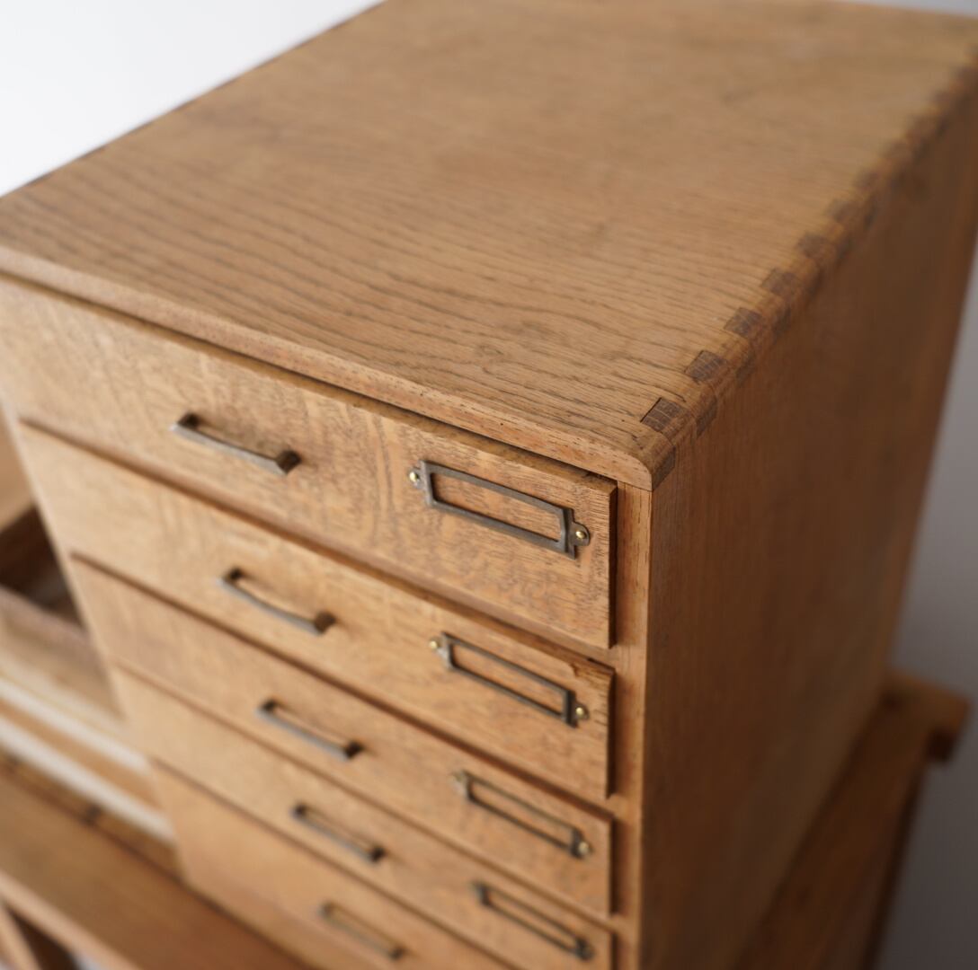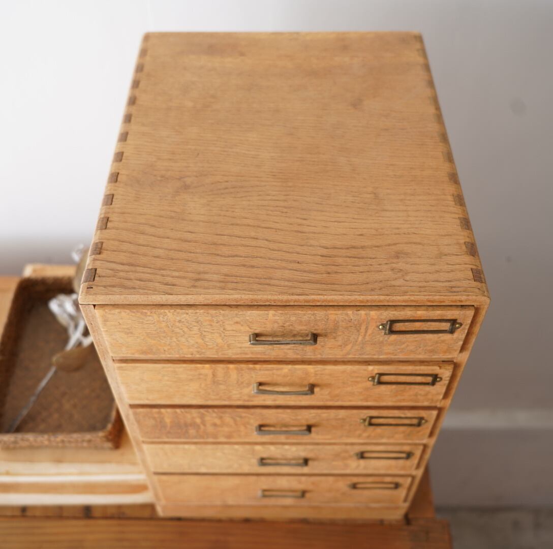 ナチュラルな木味、並んだ金属の取手とネームプレートが可愛らしい5杯の引き出し。