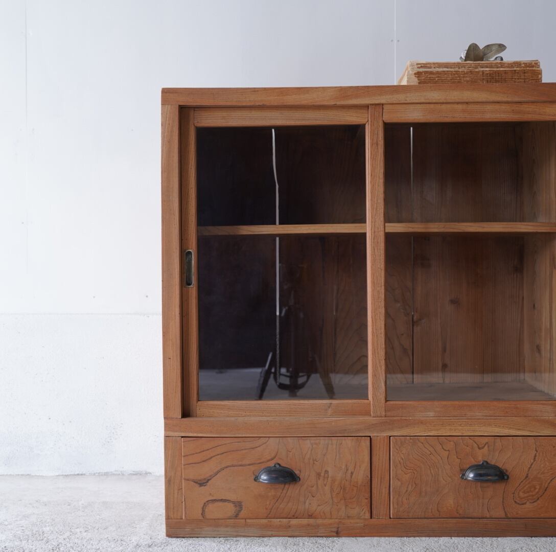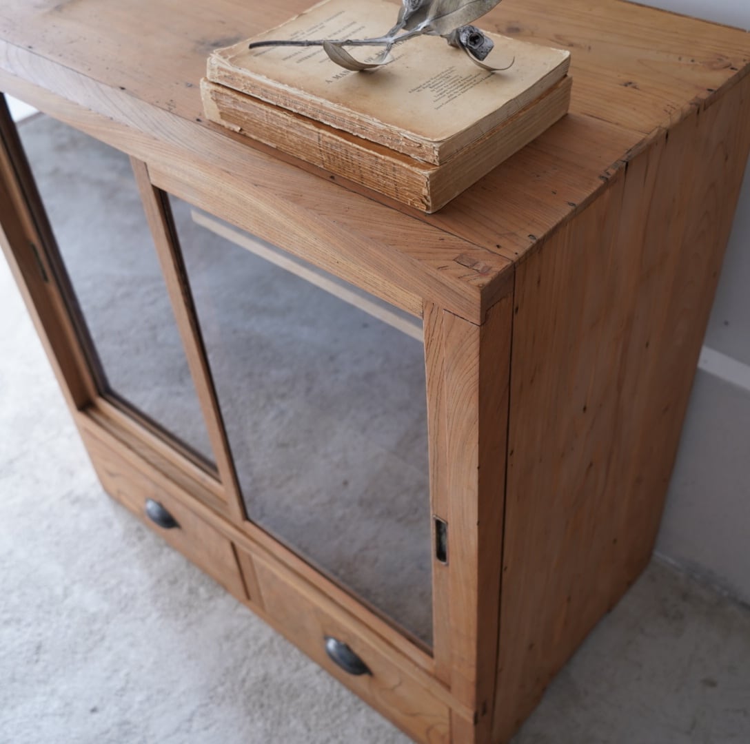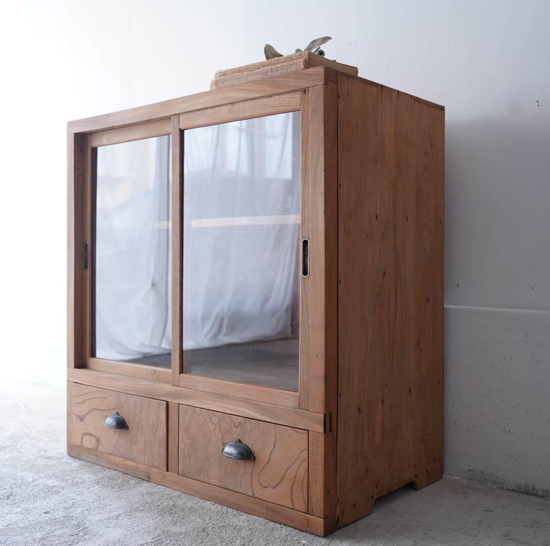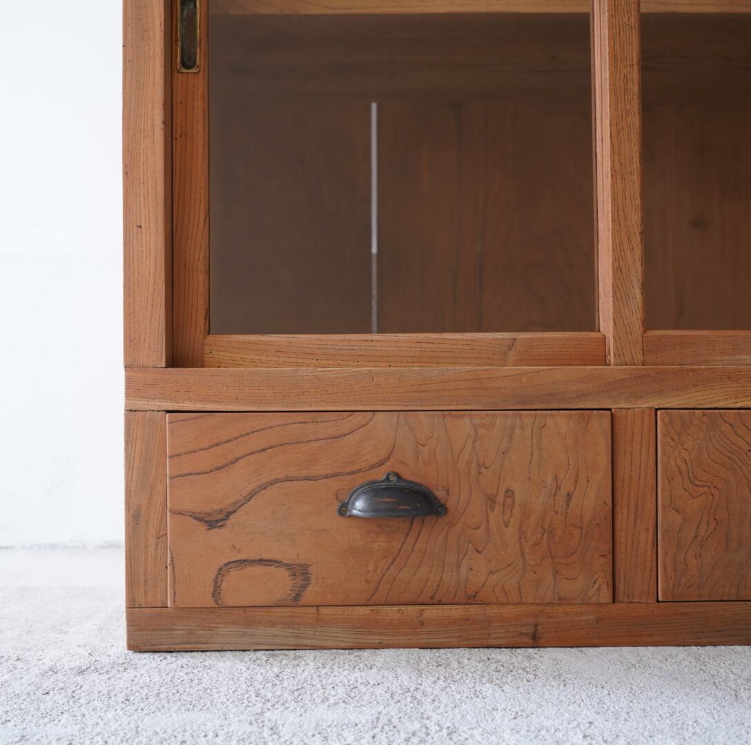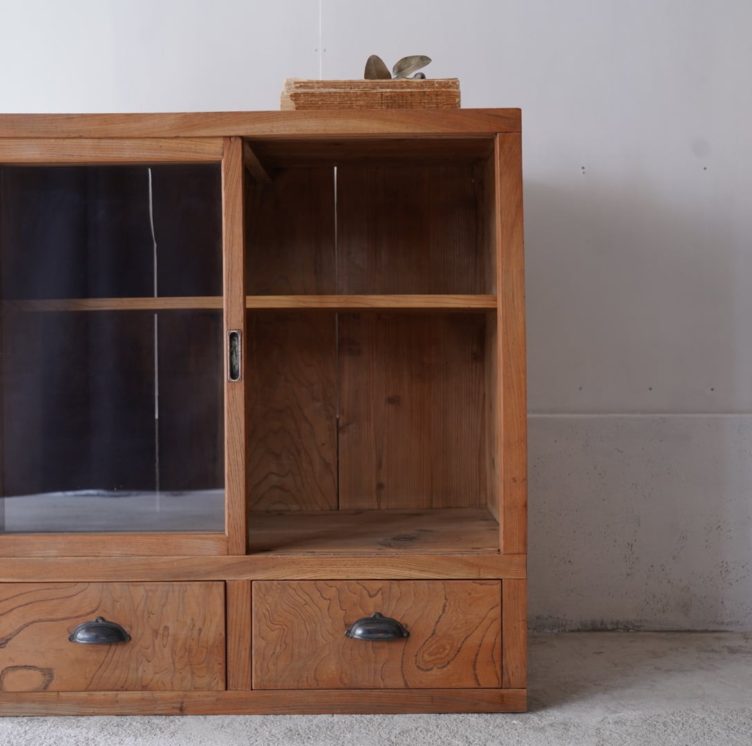 無垢材の温かみのある木味と引き出しについた黒い金属の取手が魅力的なガラス戸棚。