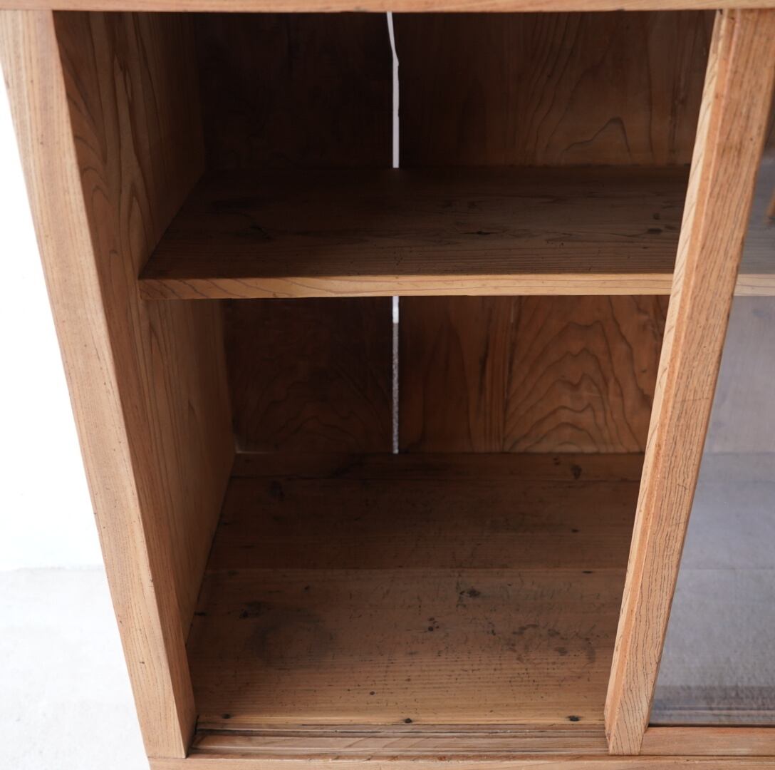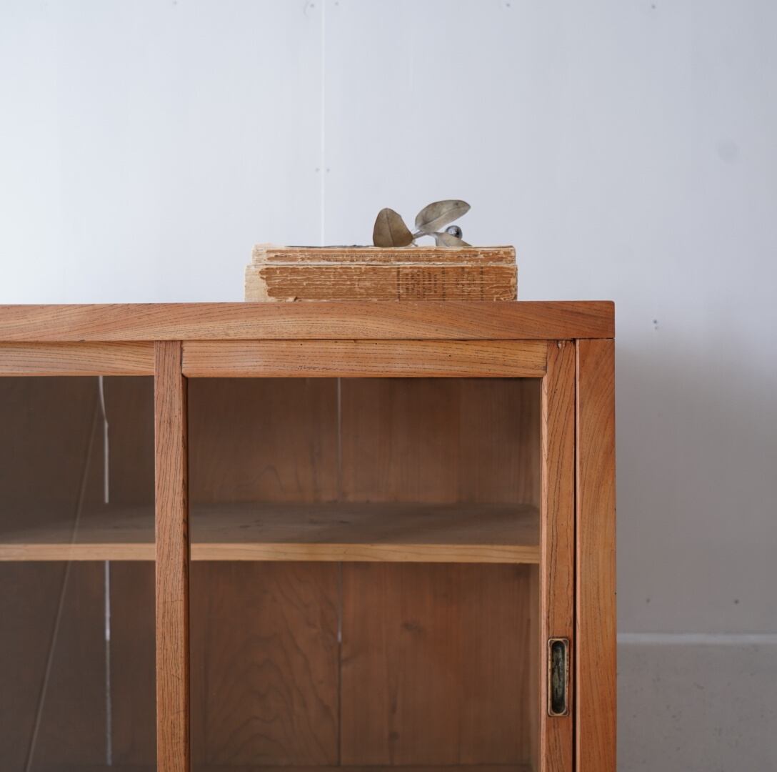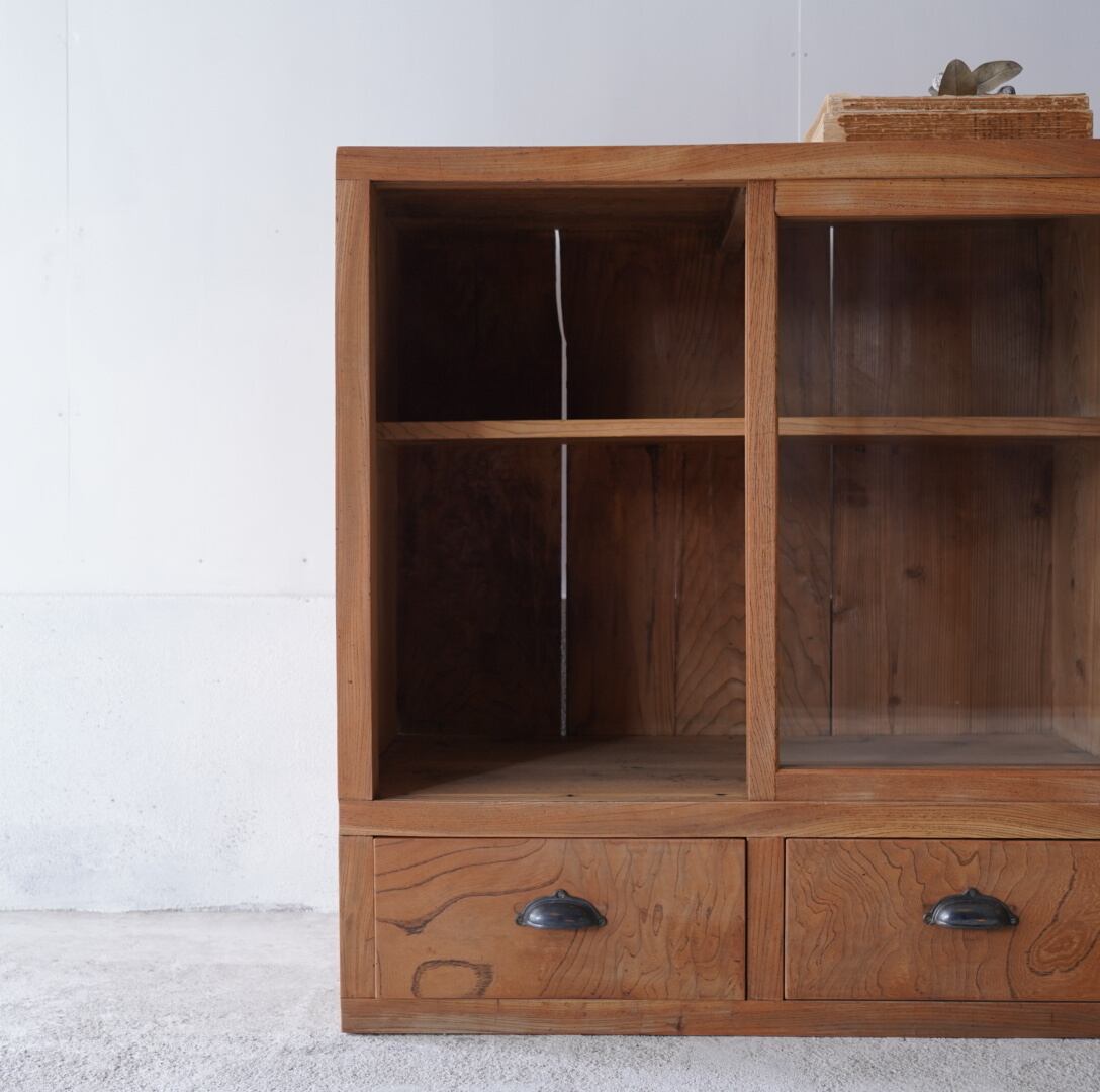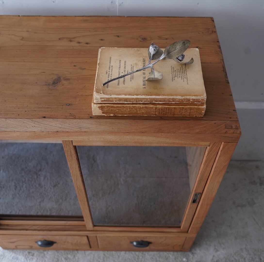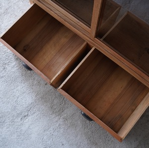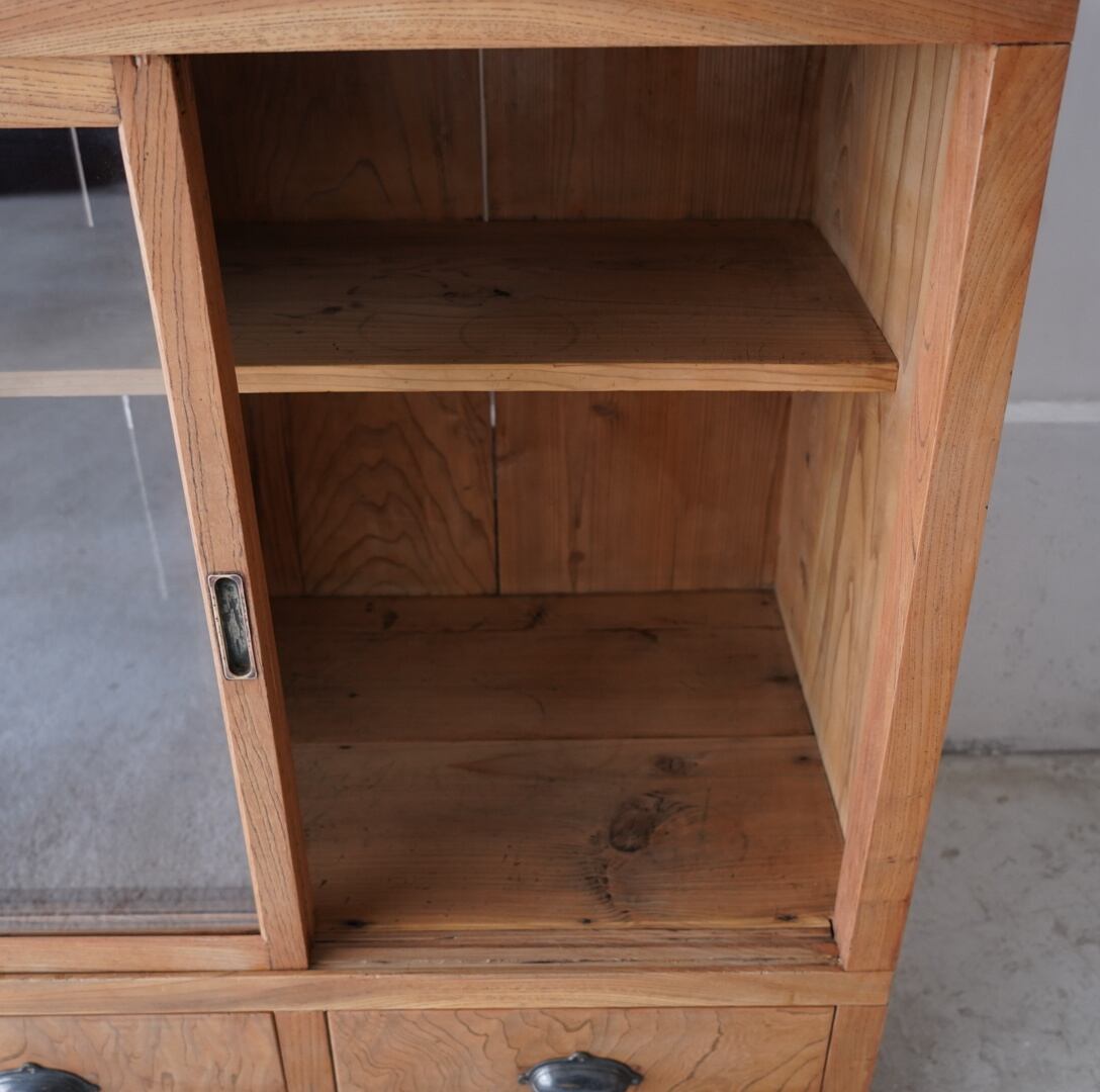 無垢材の温かみのある木味と引き出しについた黒い金属の取手が魅力的なガラス戸棚。
