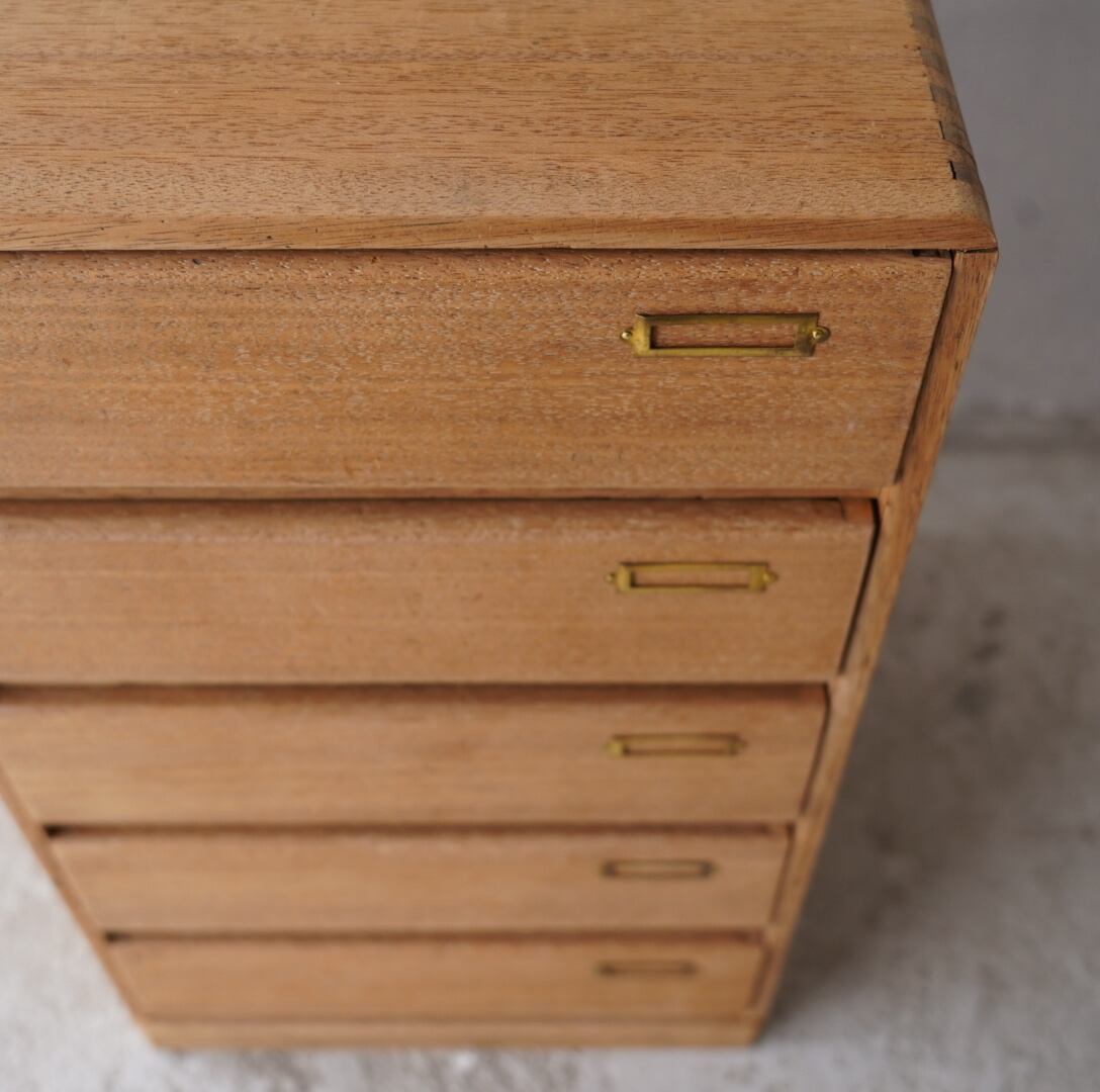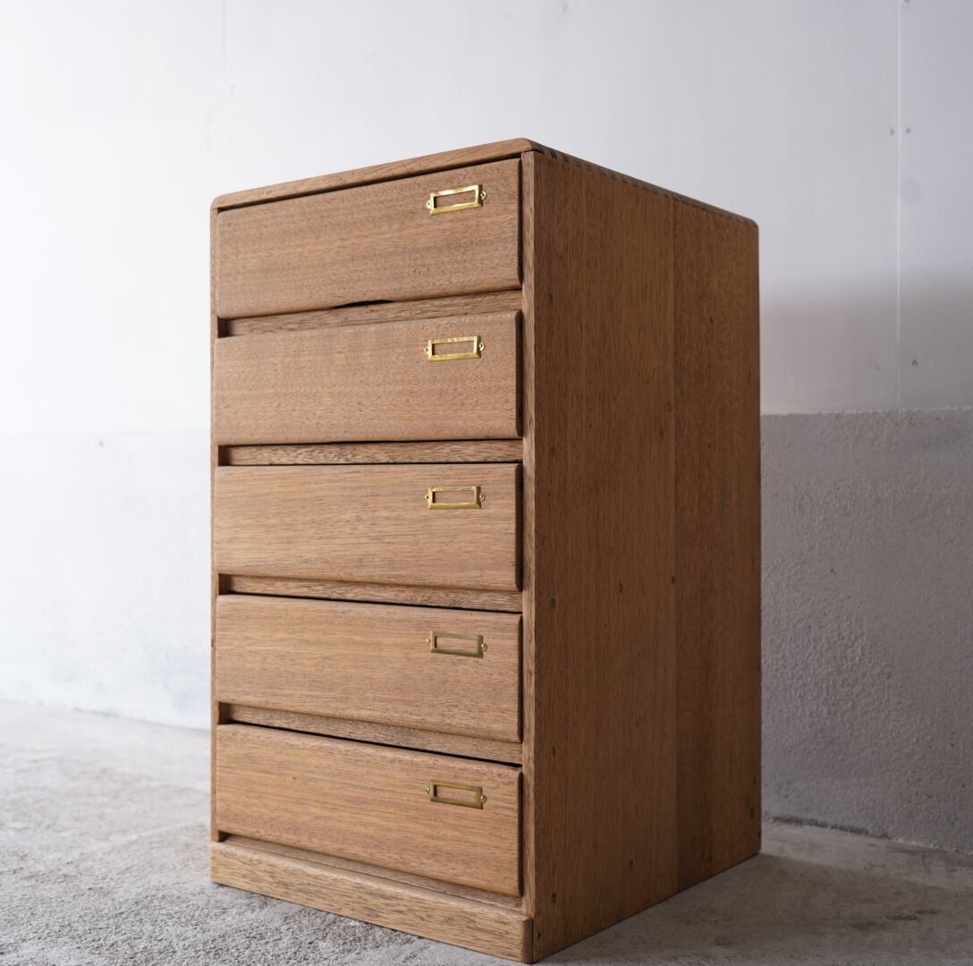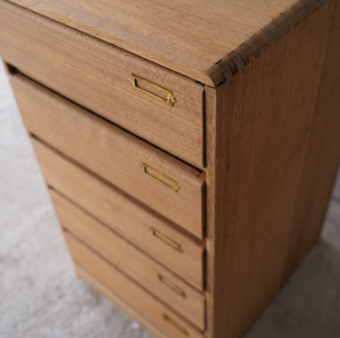 ナチュラルな木味、並んだネームプレートが可愛らしい5杯の引き出し。