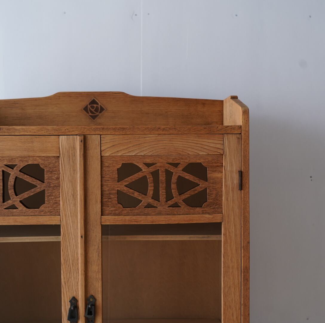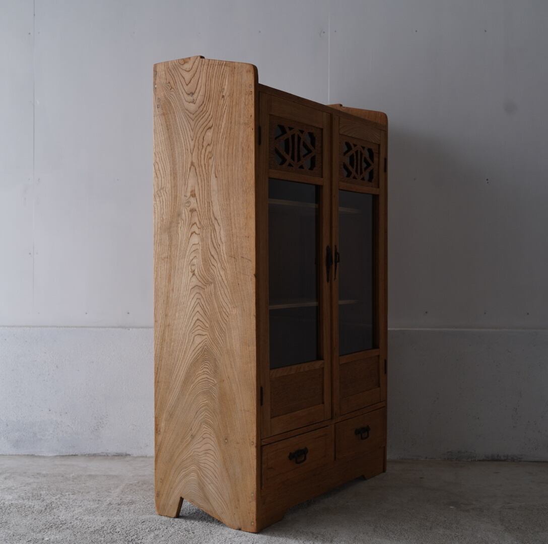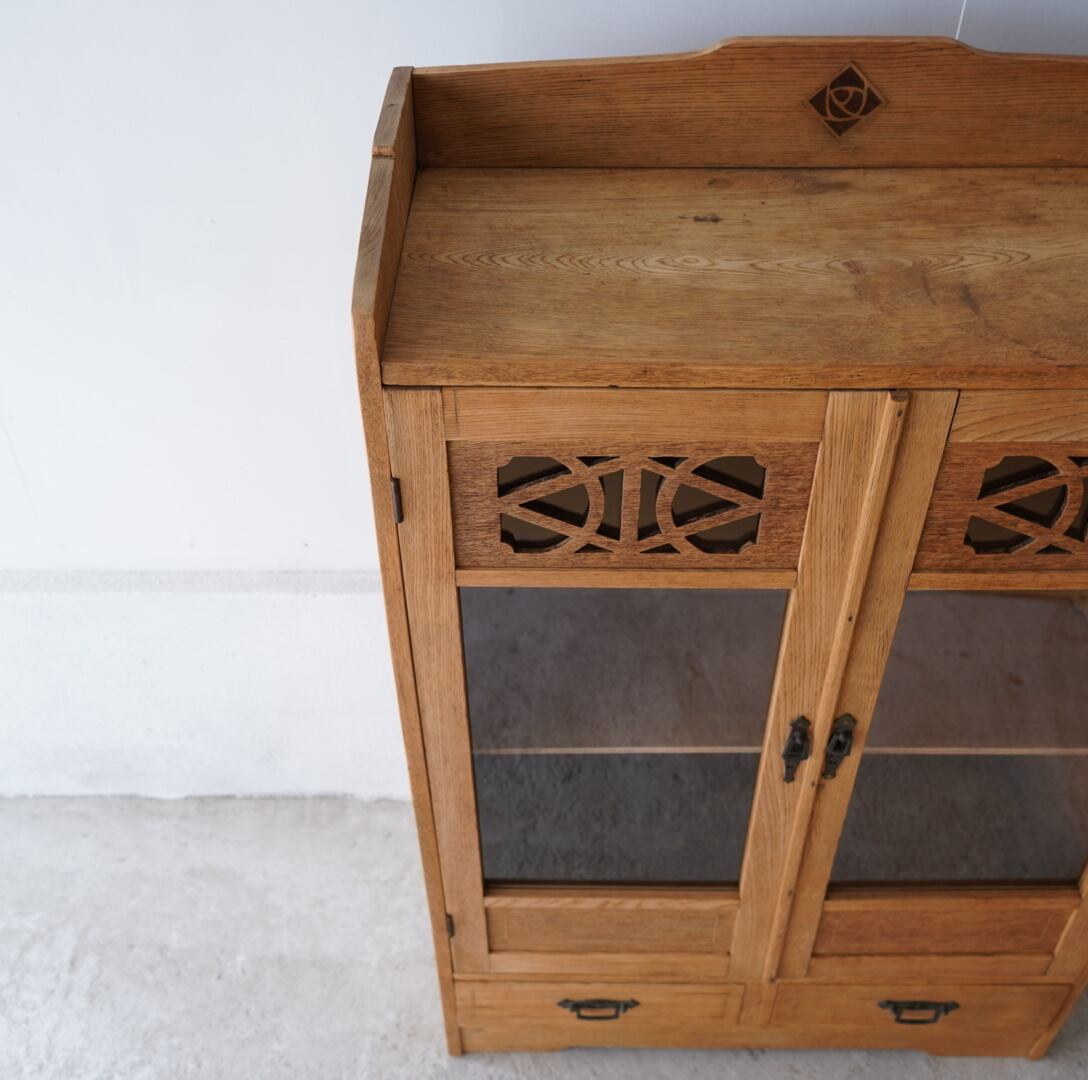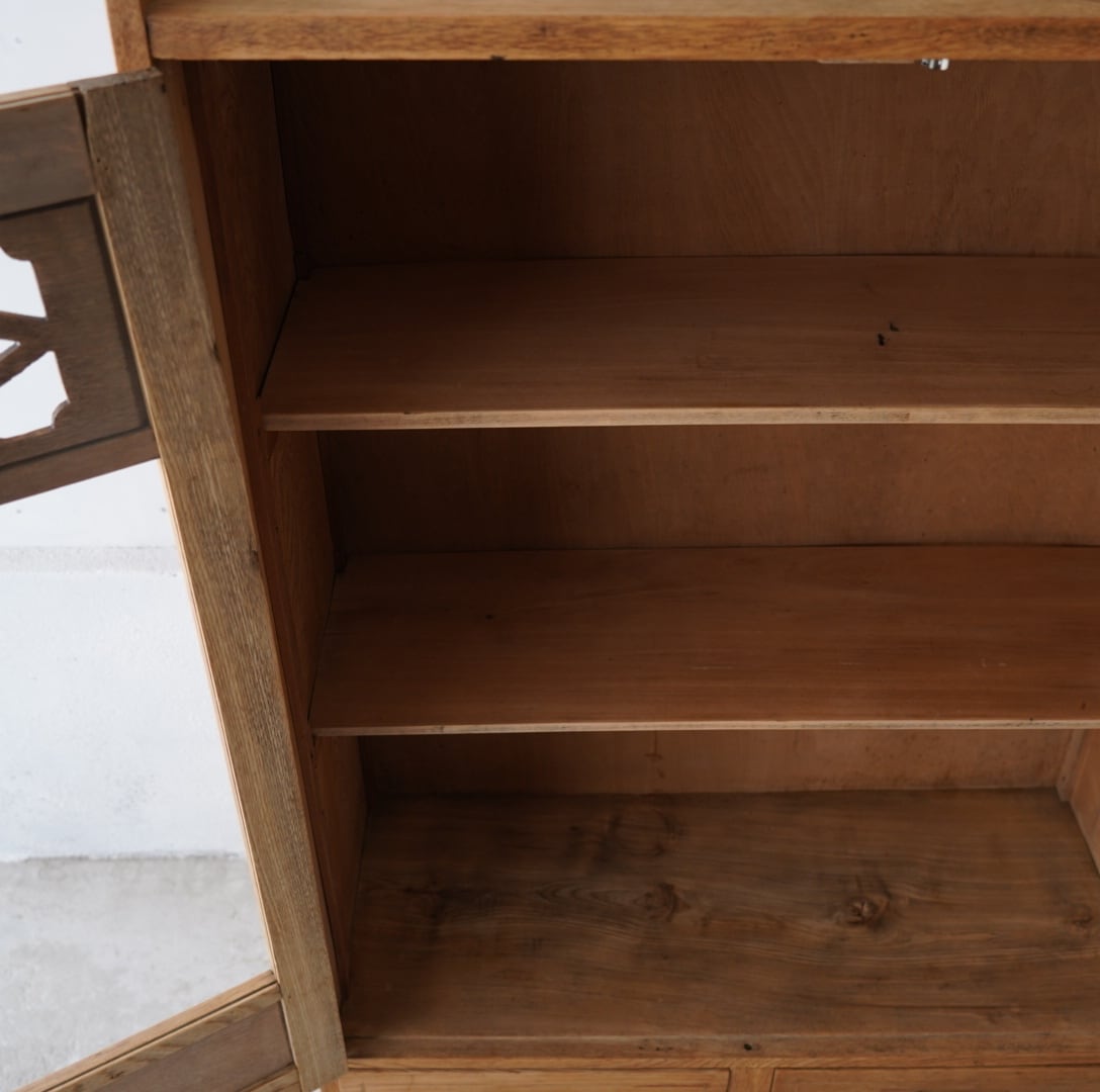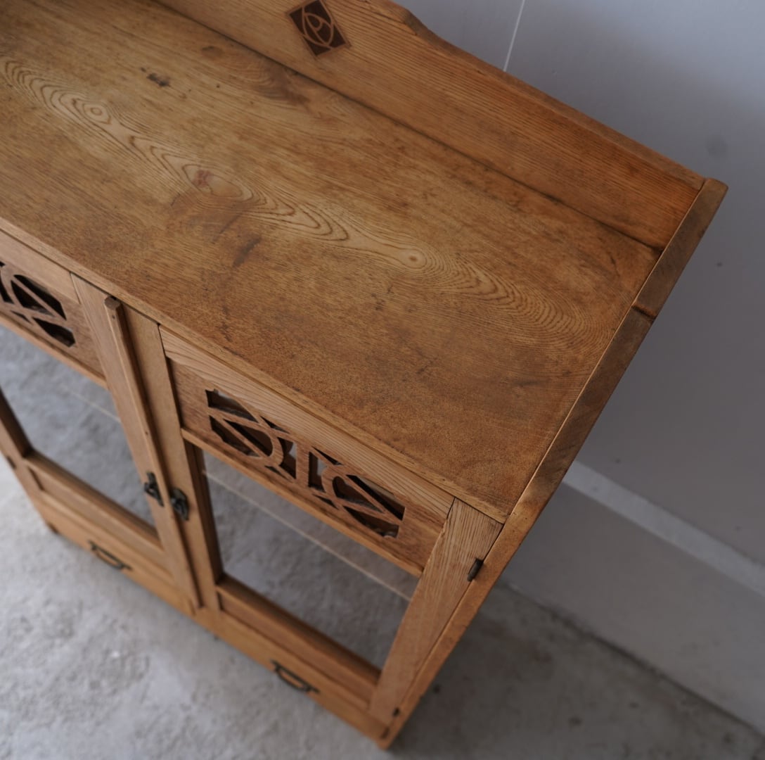 無垢材のナチュラルな木味と扉の美しい装飾が魅力的なキャビネット。