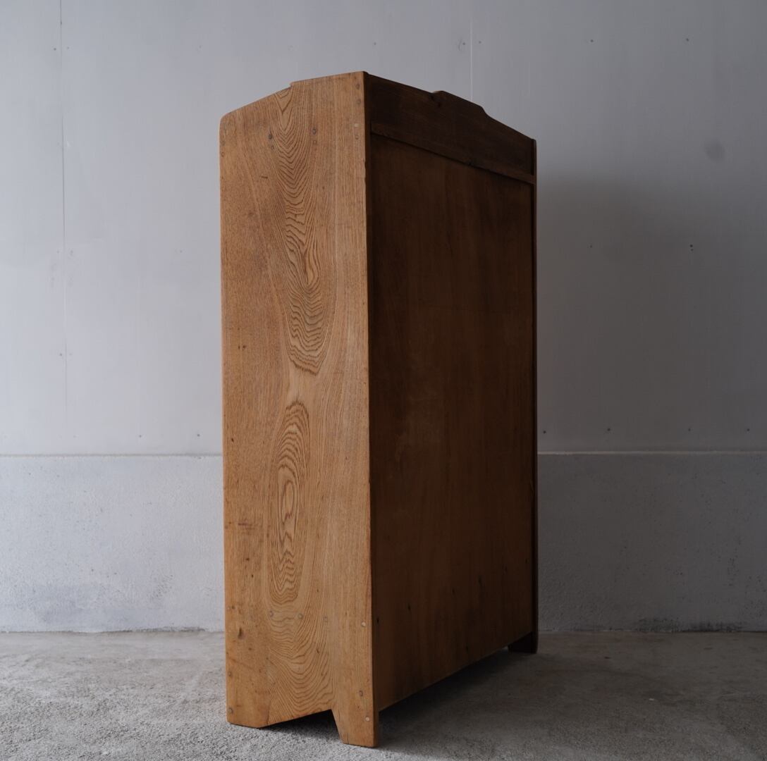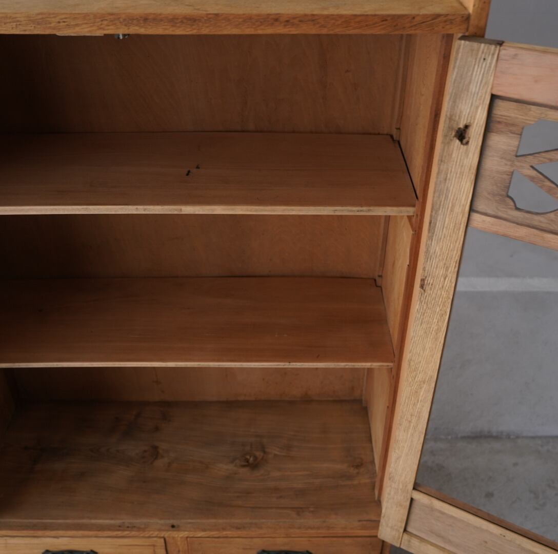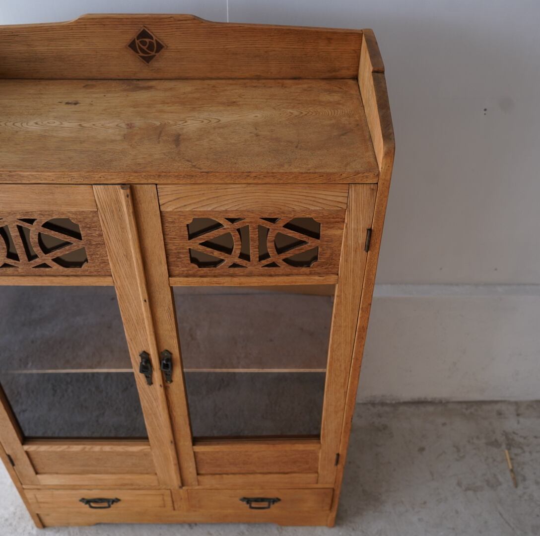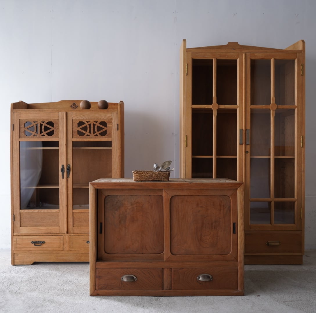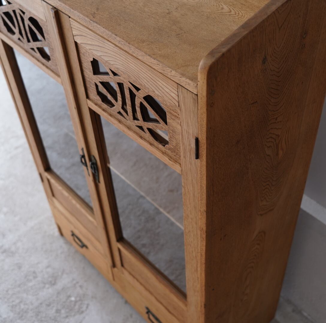 無垢材のナチュラルな木味と扉の美しい装飾が魅力的なキャビネット。