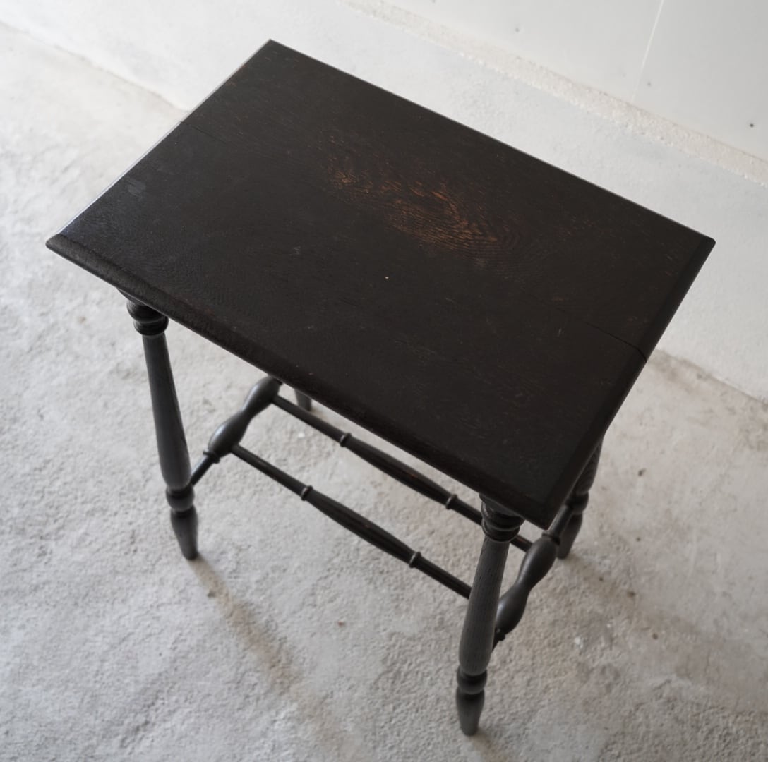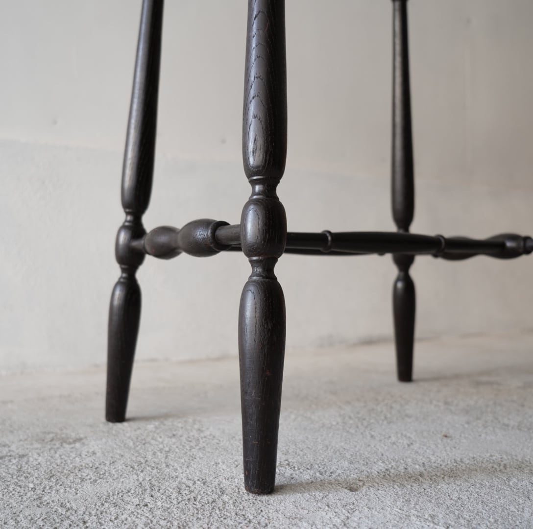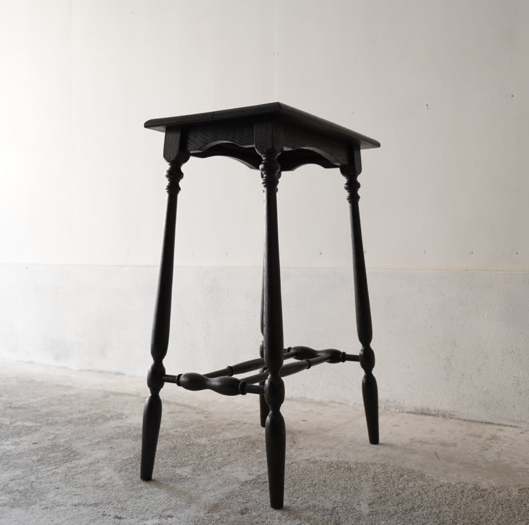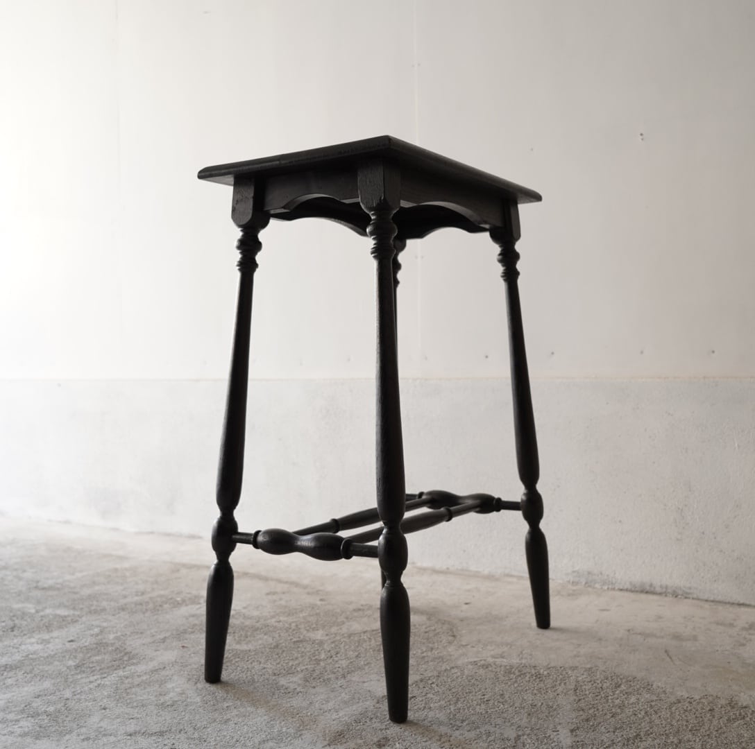 黒く艶のある木肌と美しいろくろ飾りが魅力的なサイドテーブル。