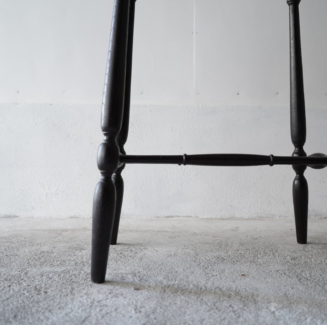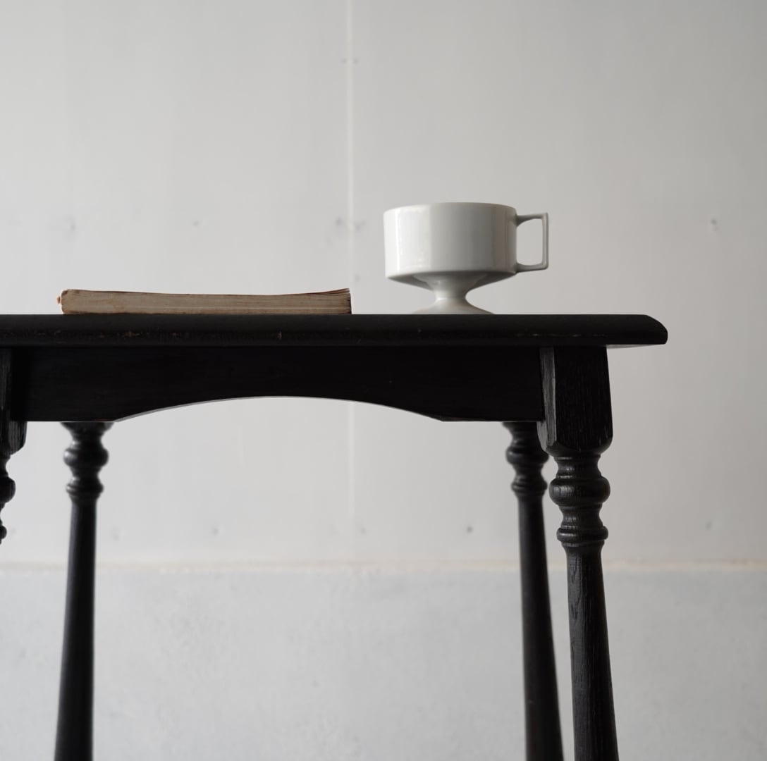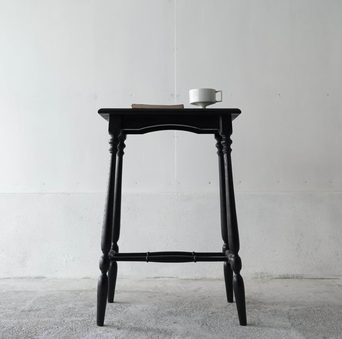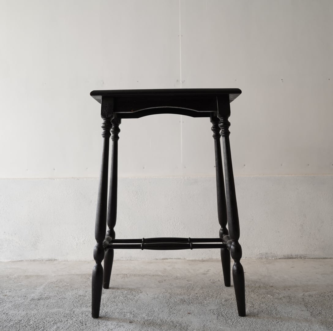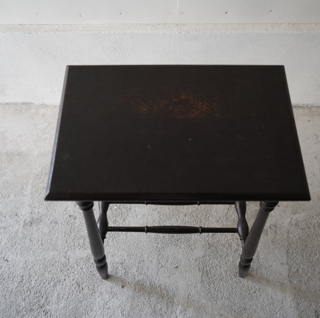 黒く艶のある木肌と美しいろくろ飾りが魅力的なサイドテーブル。