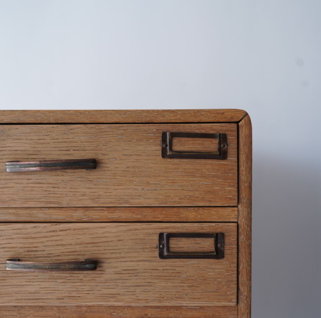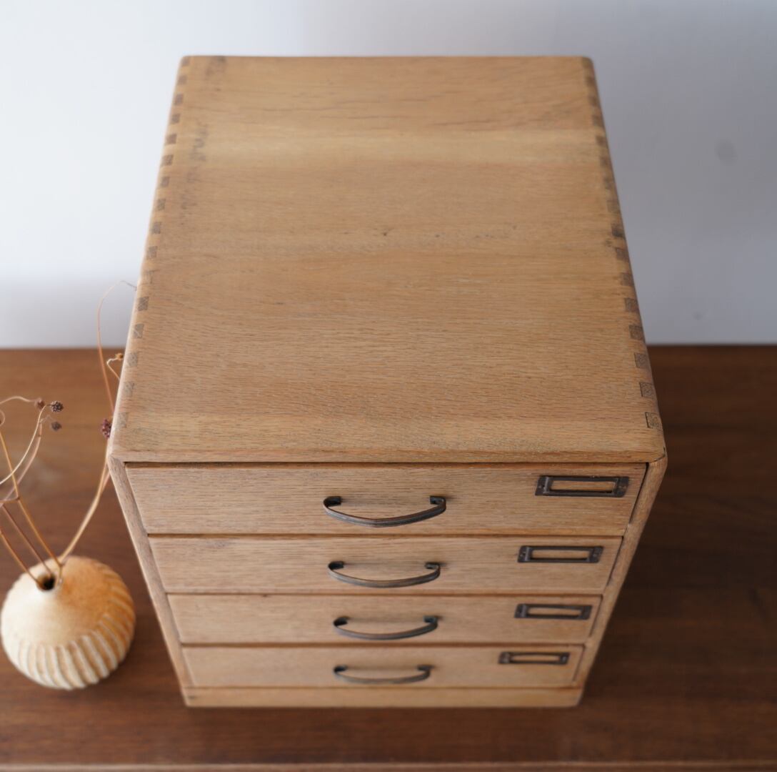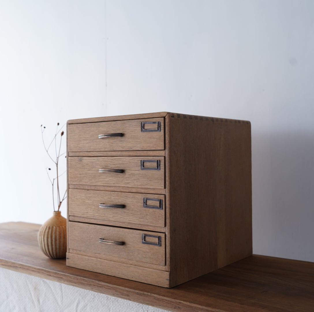 ナチュラルな木味、並んだ金属の取手とネームプレートが可愛らしい4杯の引き出し。