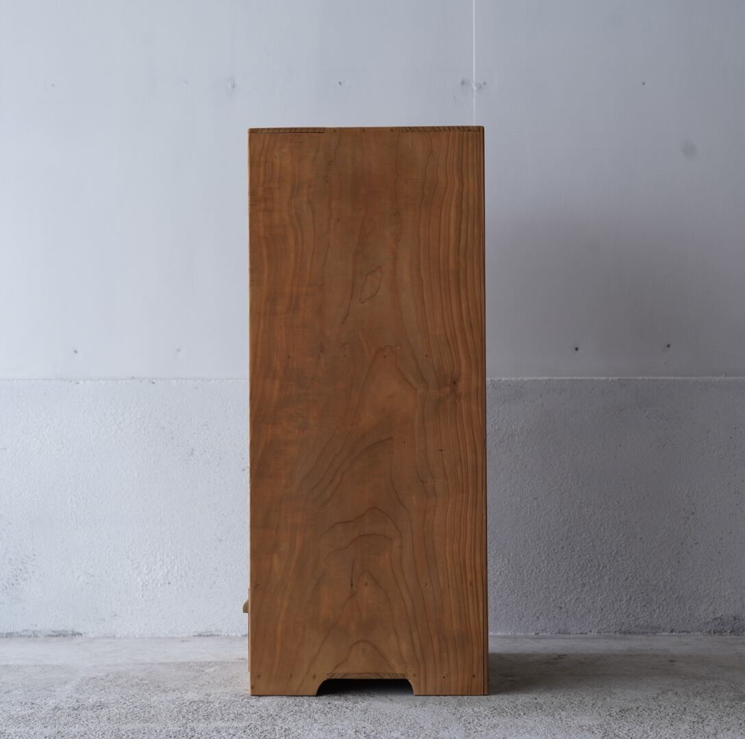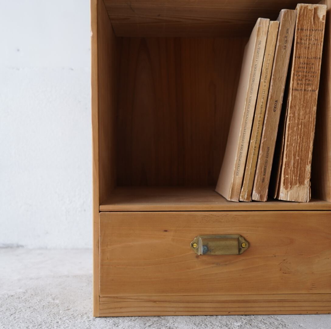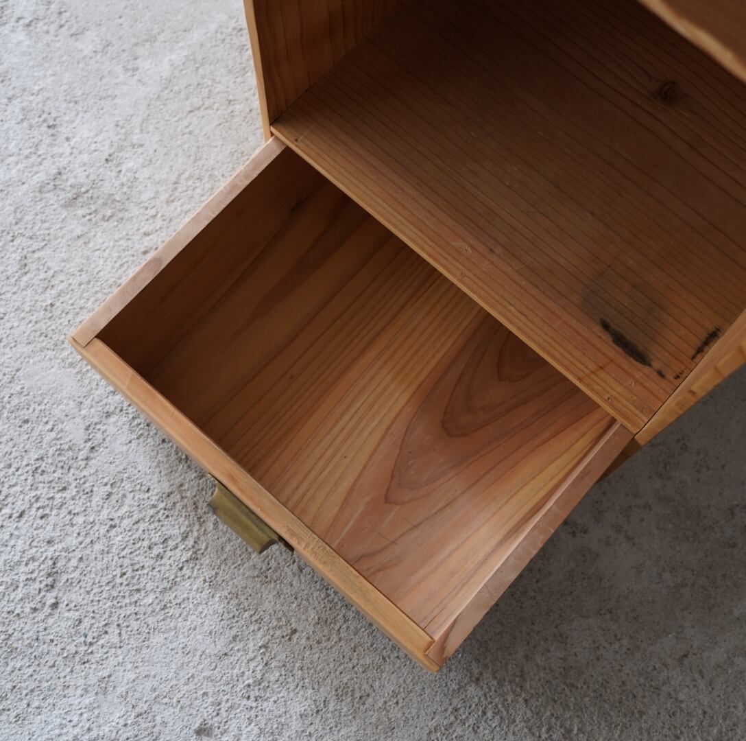 古い無垢材の温かみのある木味と真鍮取手の引き出しが魅力的な木製棚。