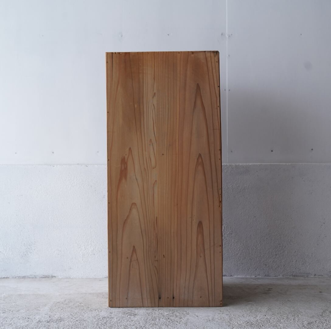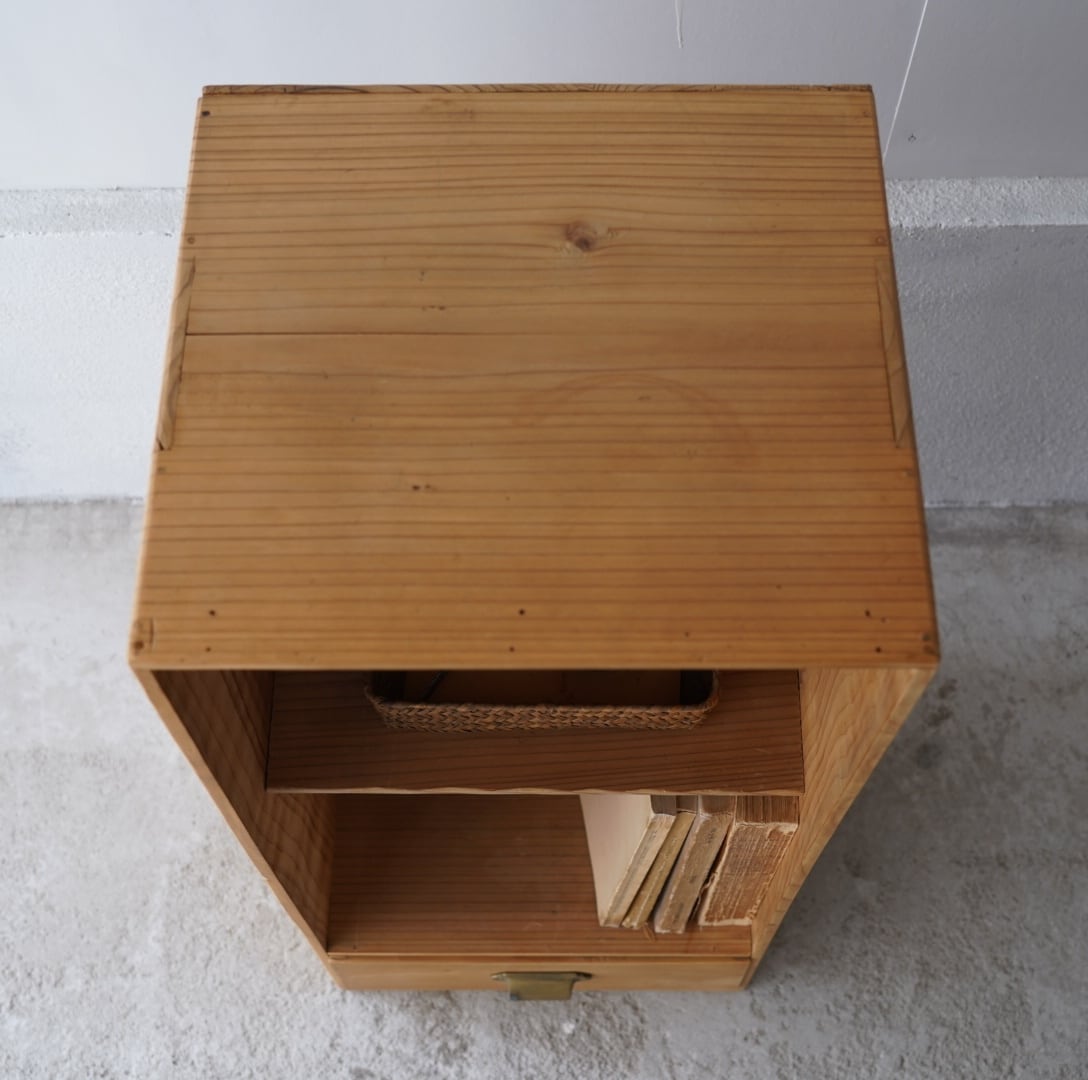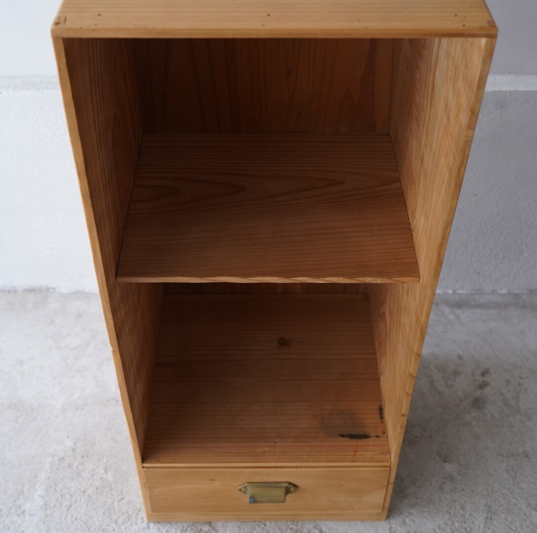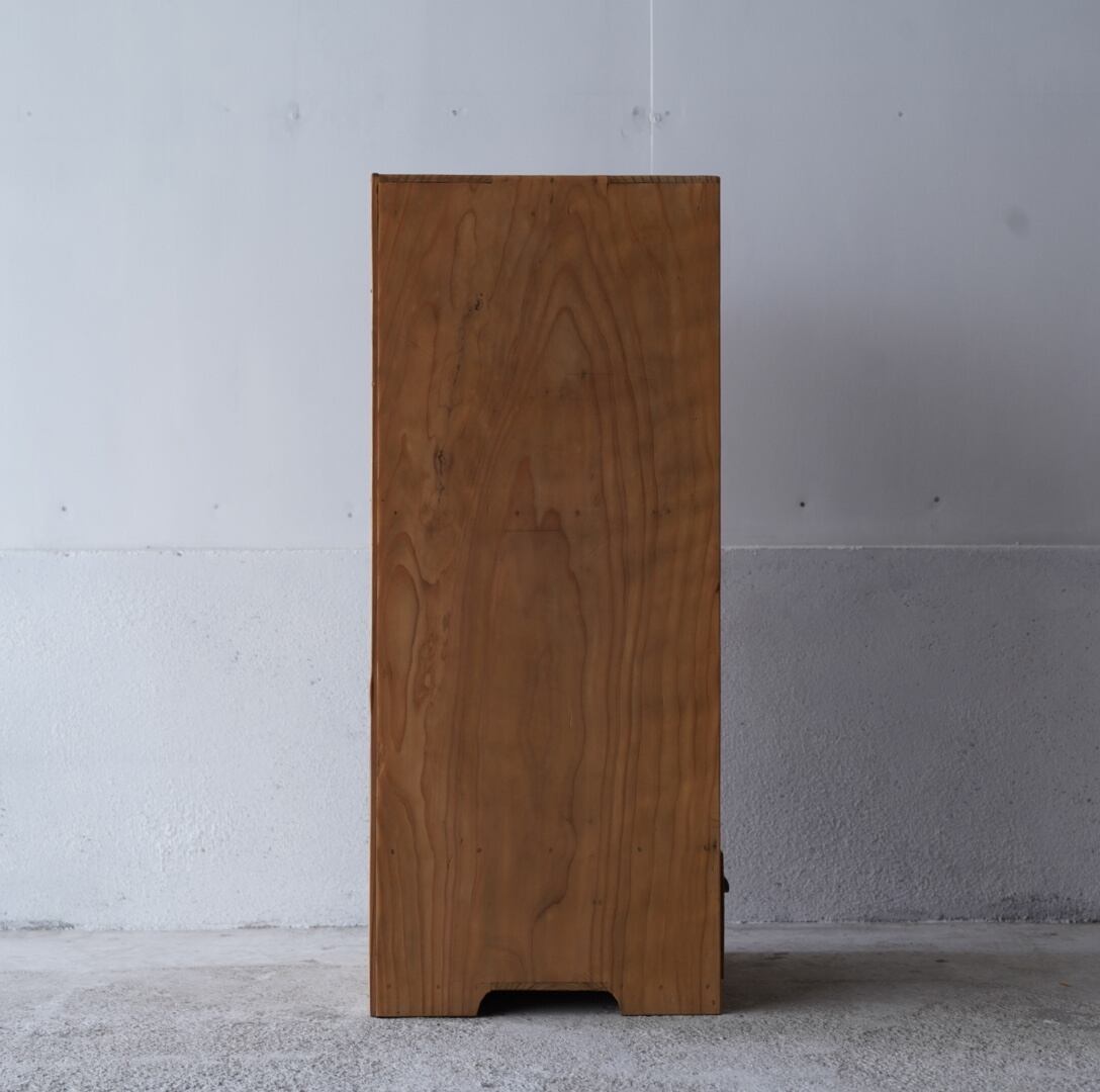 古い無垢材の温かみのある木味と真鍮取手の引き出しが魅力的な木製棚。
