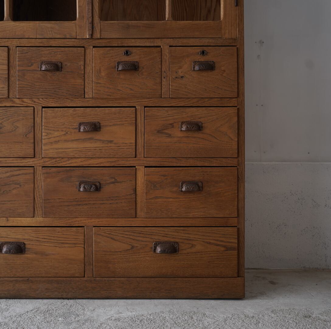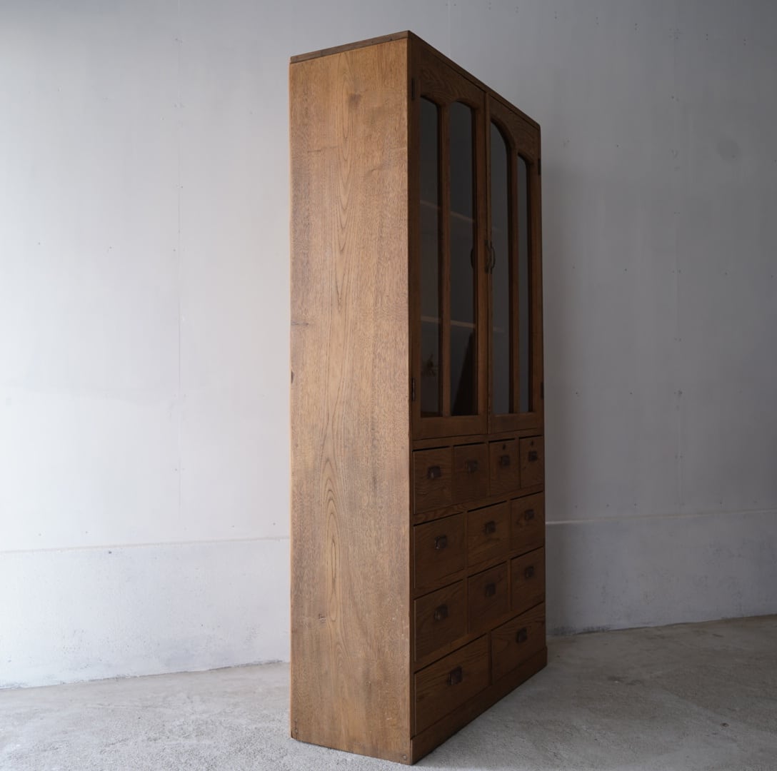 美しいガラスの開き戸、整然と並んだ12杯の引き出しが目を惹きます。