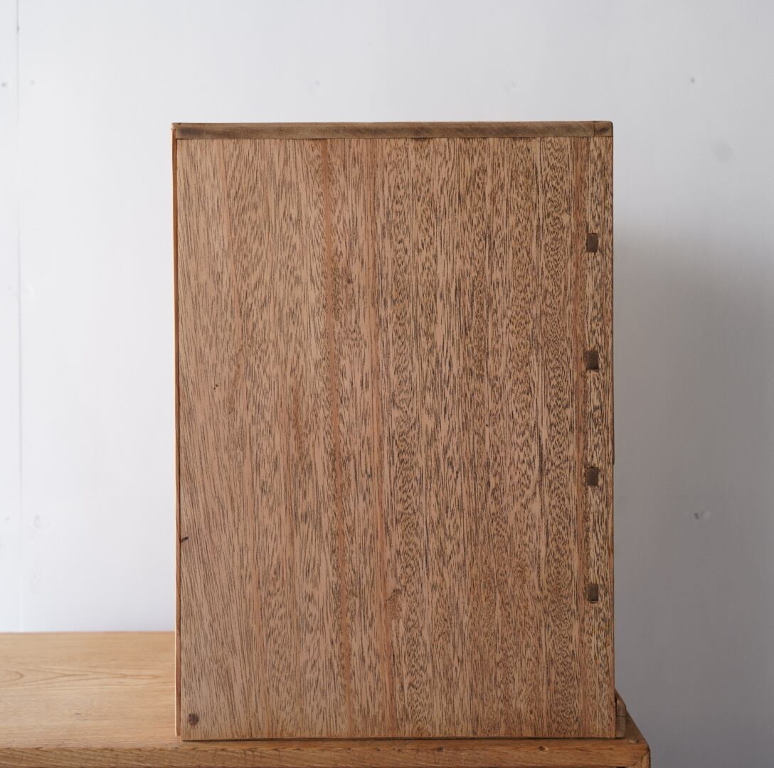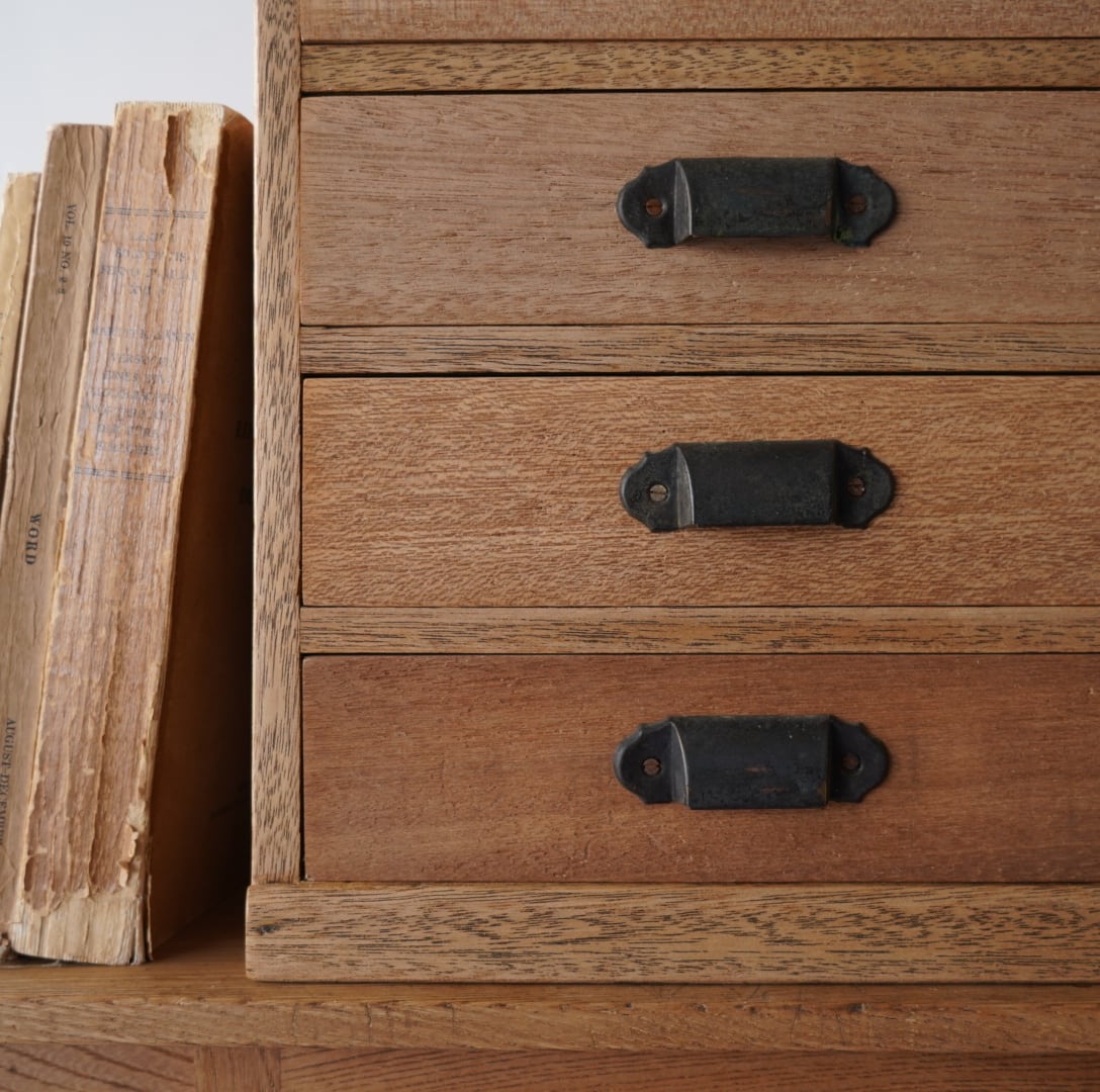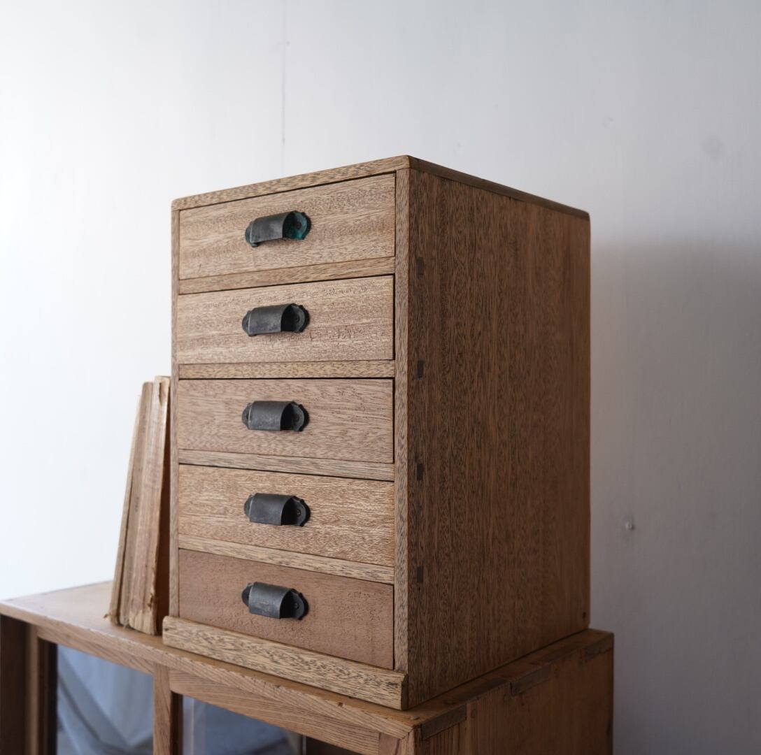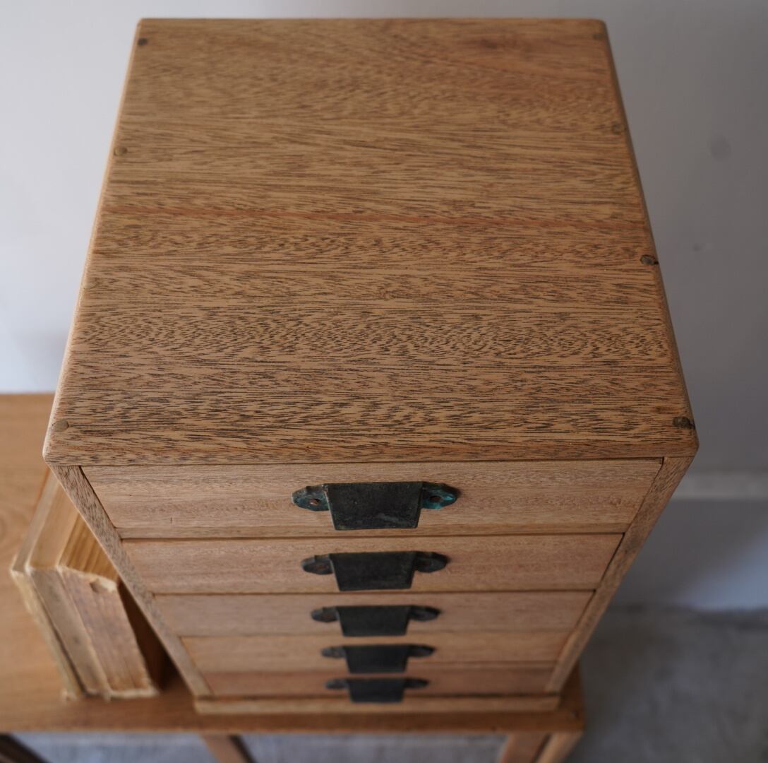 無垢材のナチュラルな木味と経年変化のある真鍮取手が魅力的な5杯の引き出し。