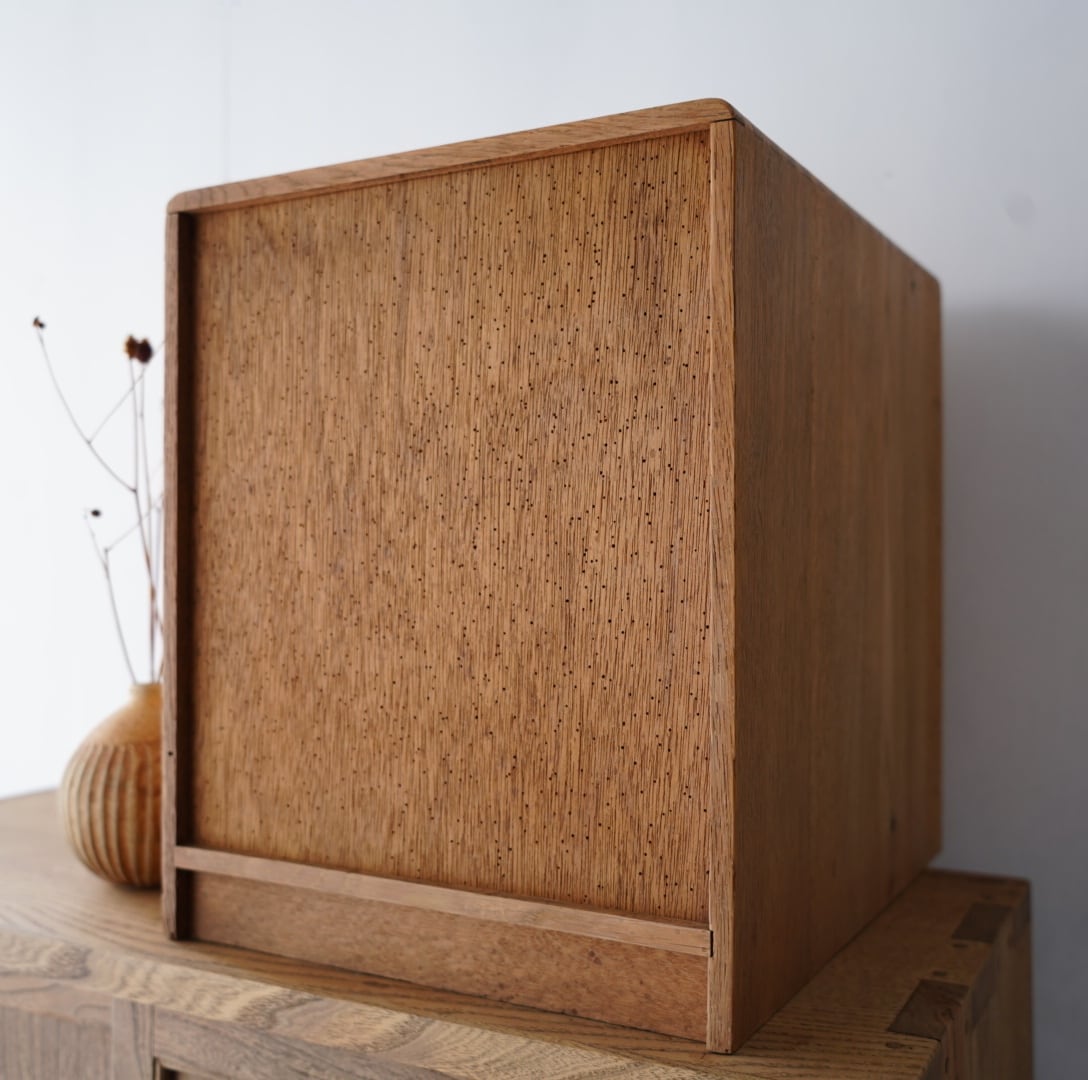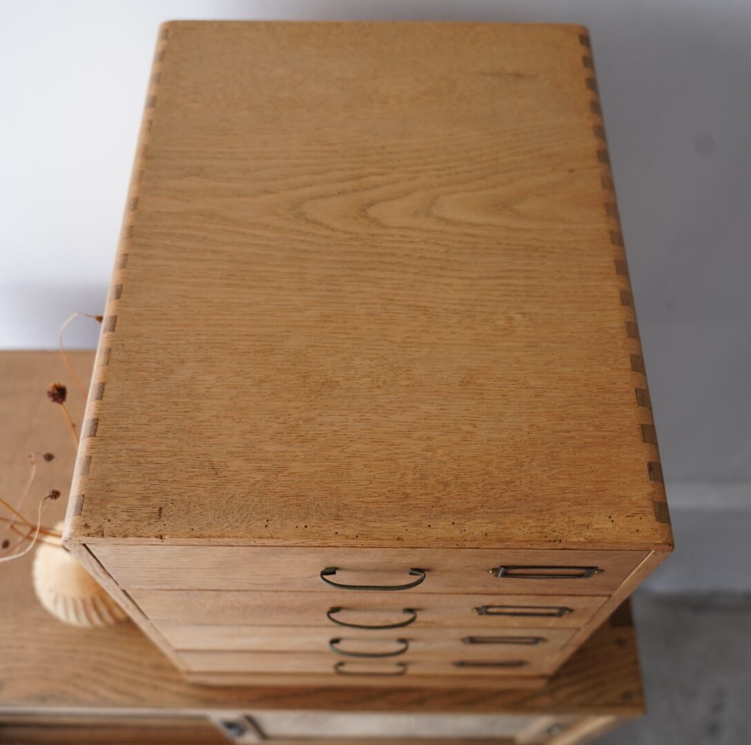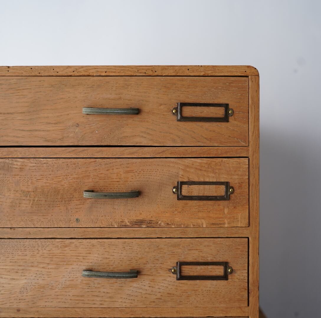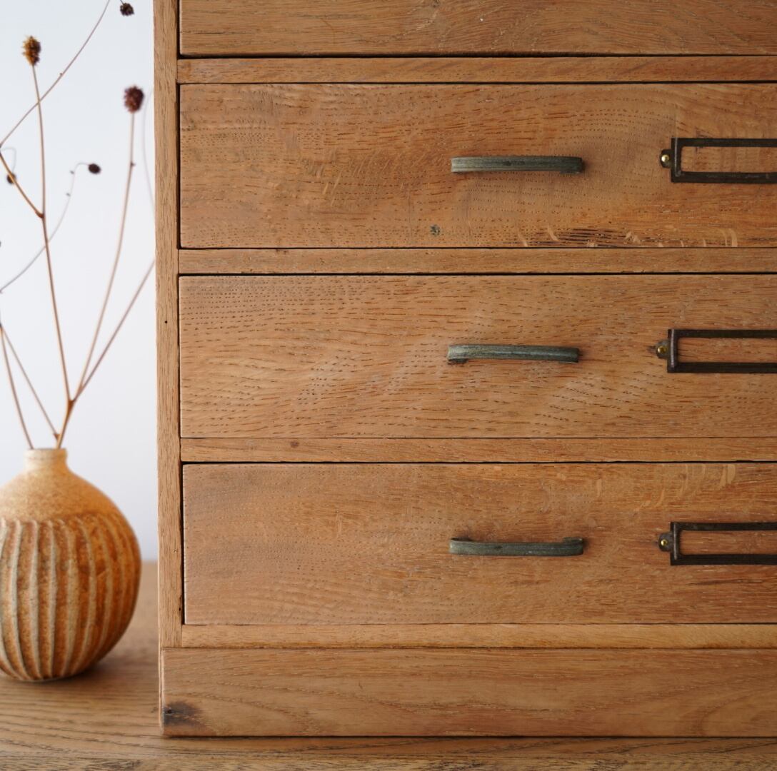 ナチュラルな木味、並んだ金属の取手とネームプレートが可愛らしい4杯の引き出し。