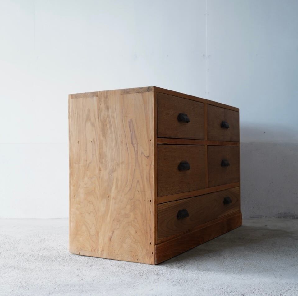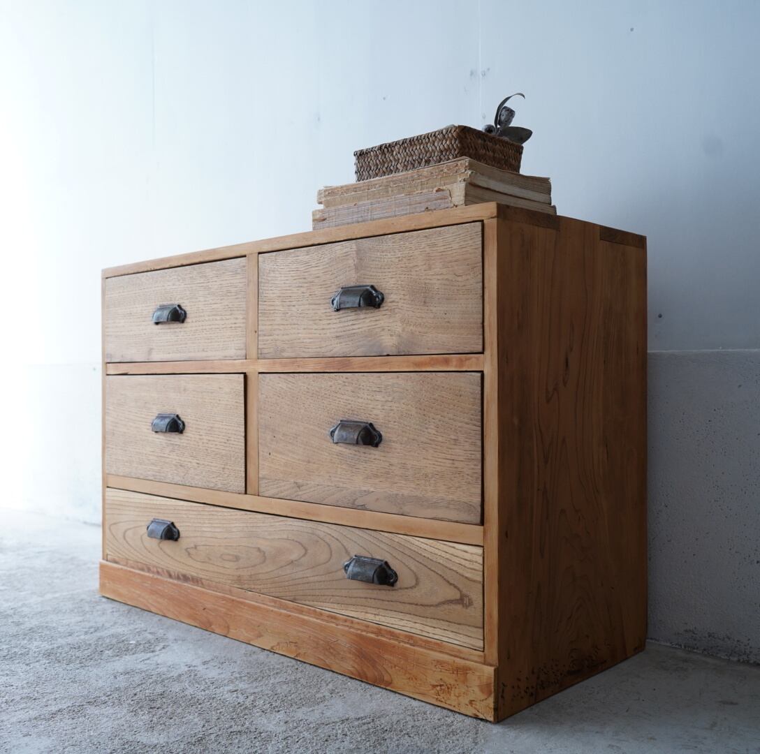 無垢材の温かみのある木味と並んだ黒い取手が魅力的な5杯の引き出しチェスト。