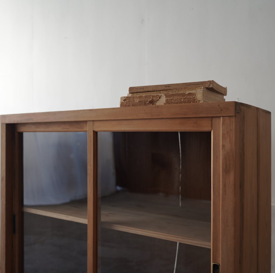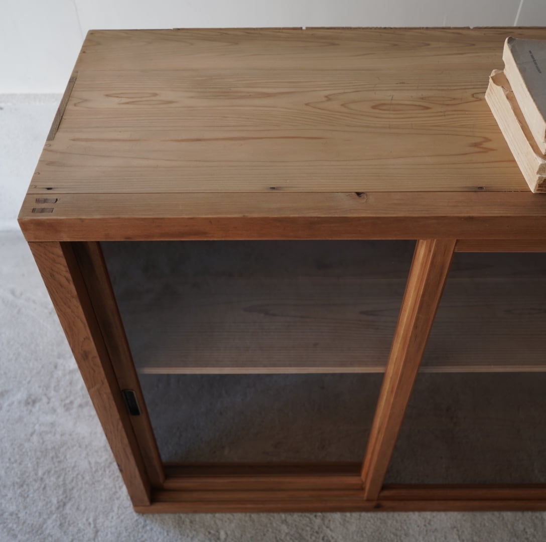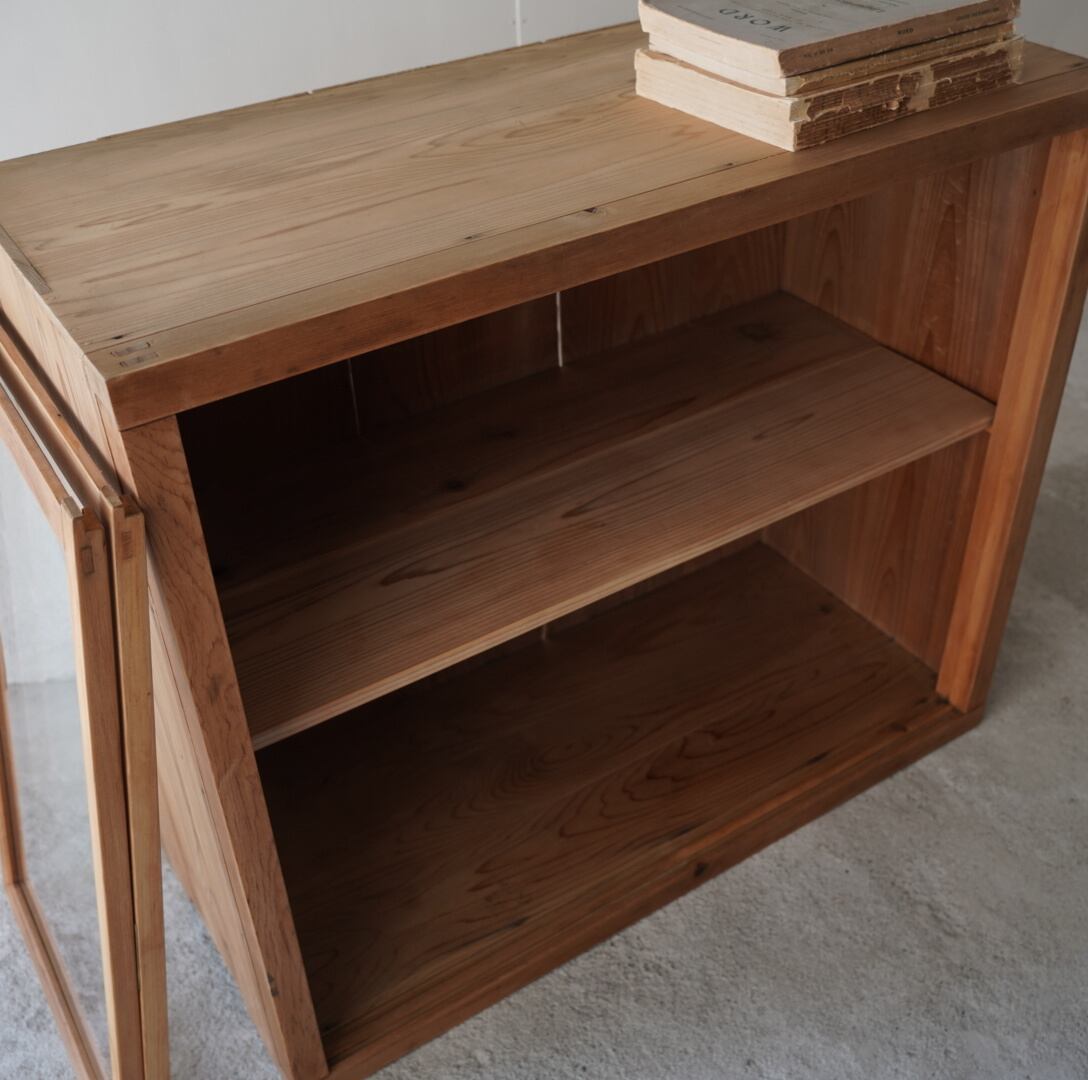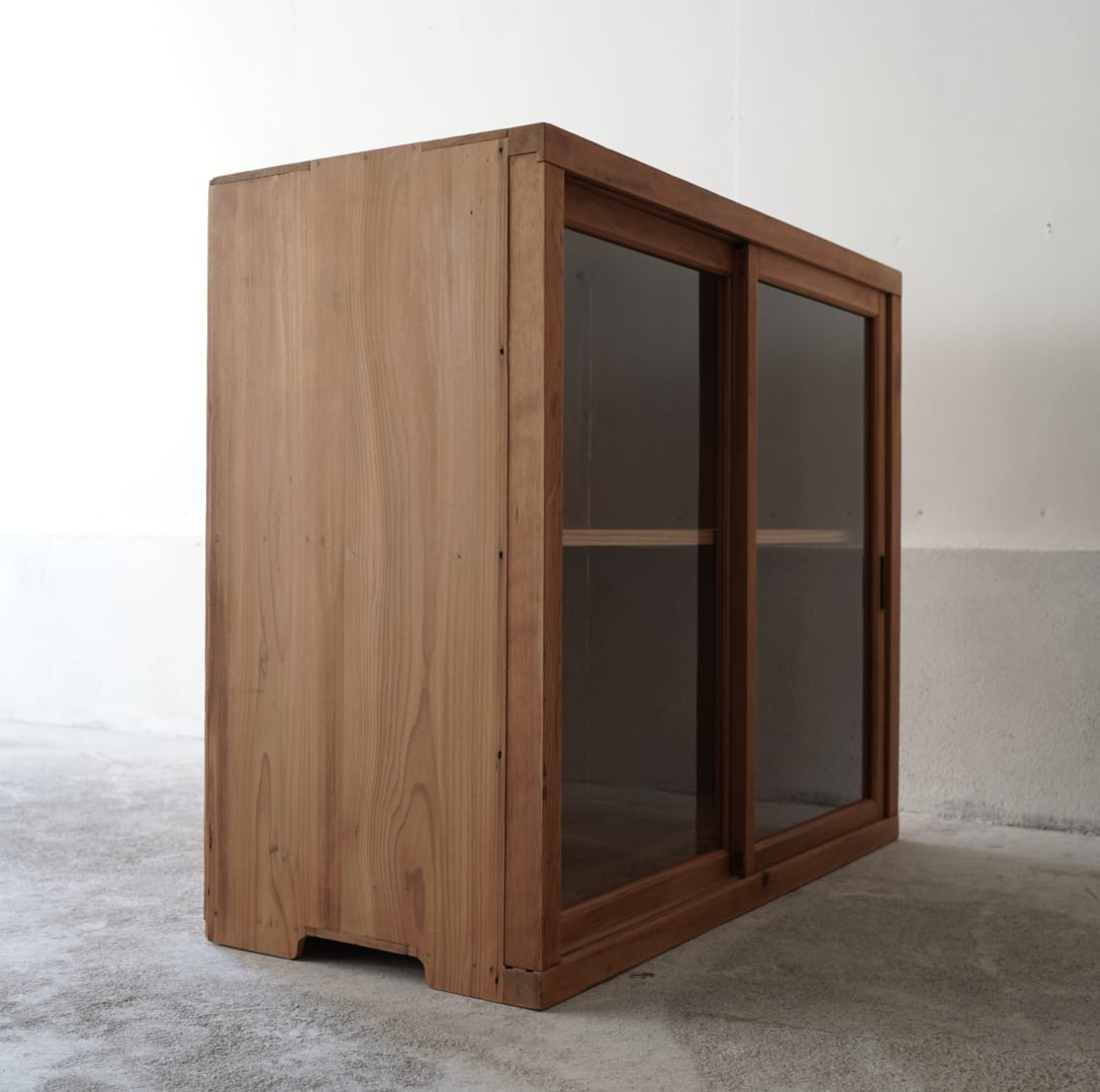 無垢材のナチュラルな木味と大きなガラス引き戸が美しいキャビネット。