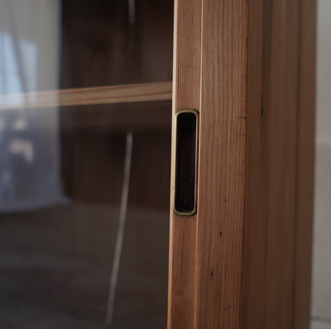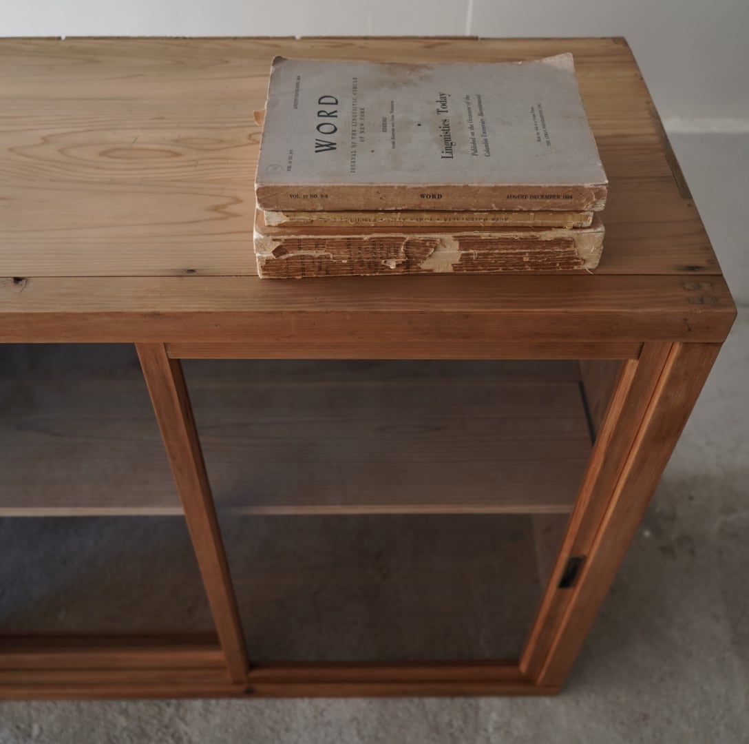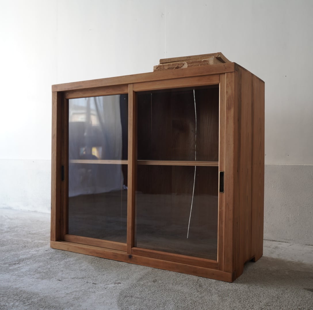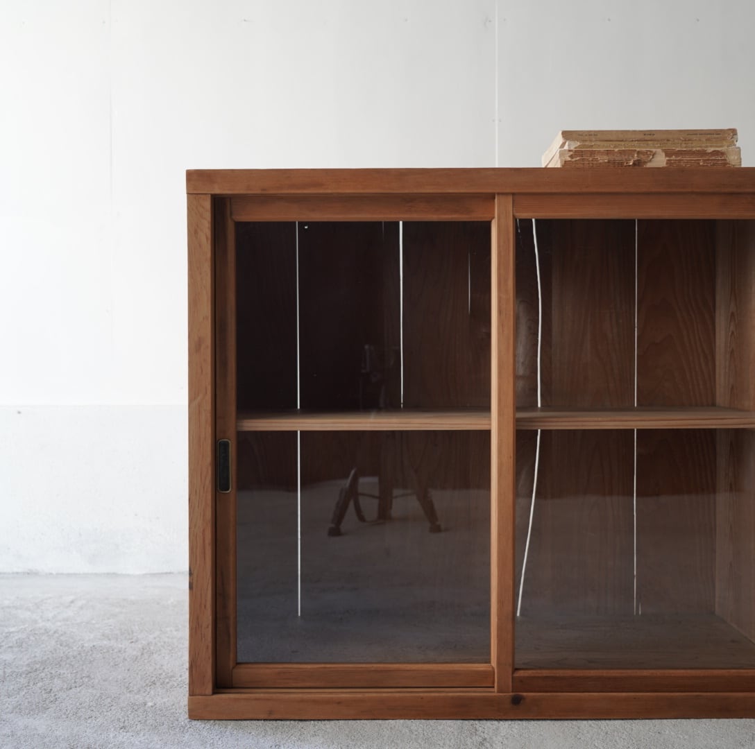 無垢材のナチュラルな木味と大きなガラス引き戸が美しいキャビネット。