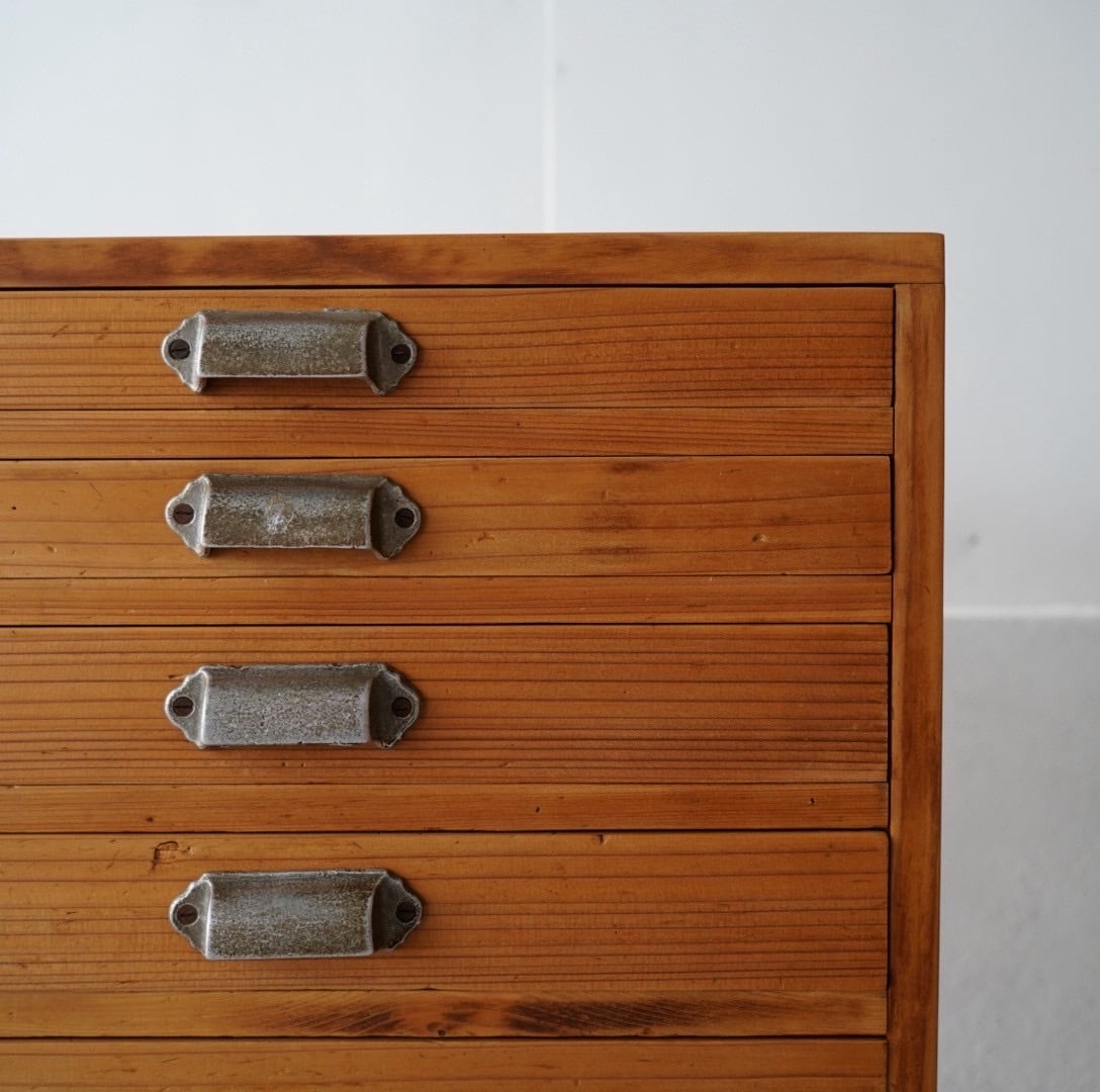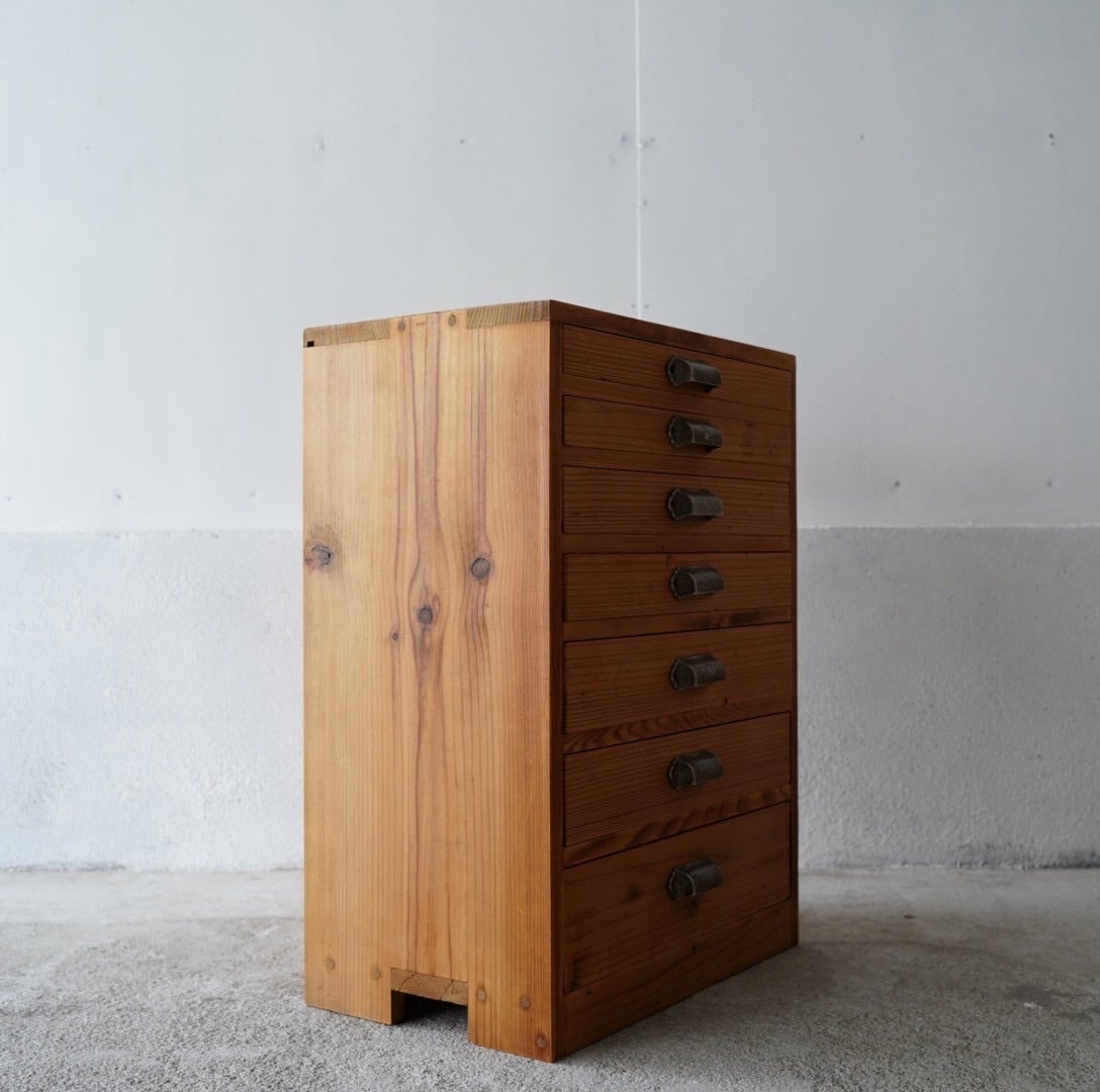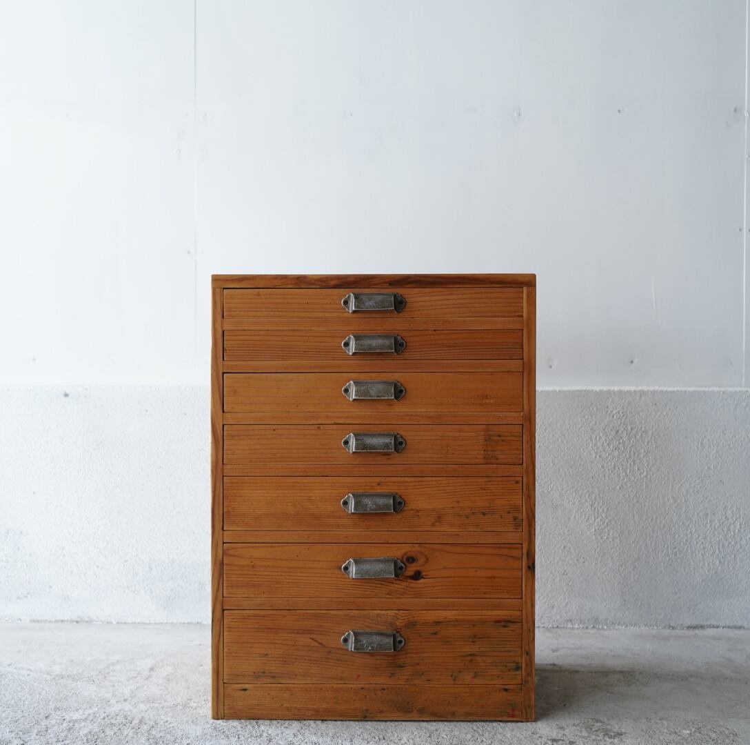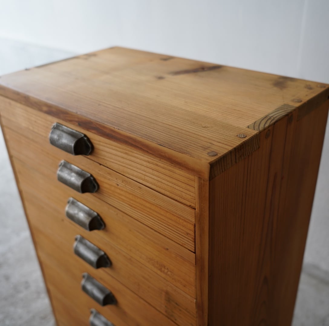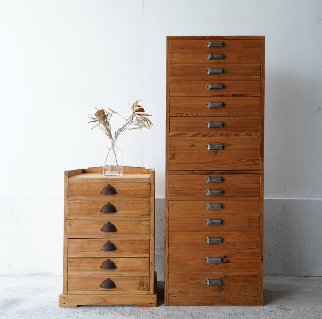 無垢材のナチュラルな木味と経年変化のあるアルミ取手が魅力的な7杯の引き出し2点。
