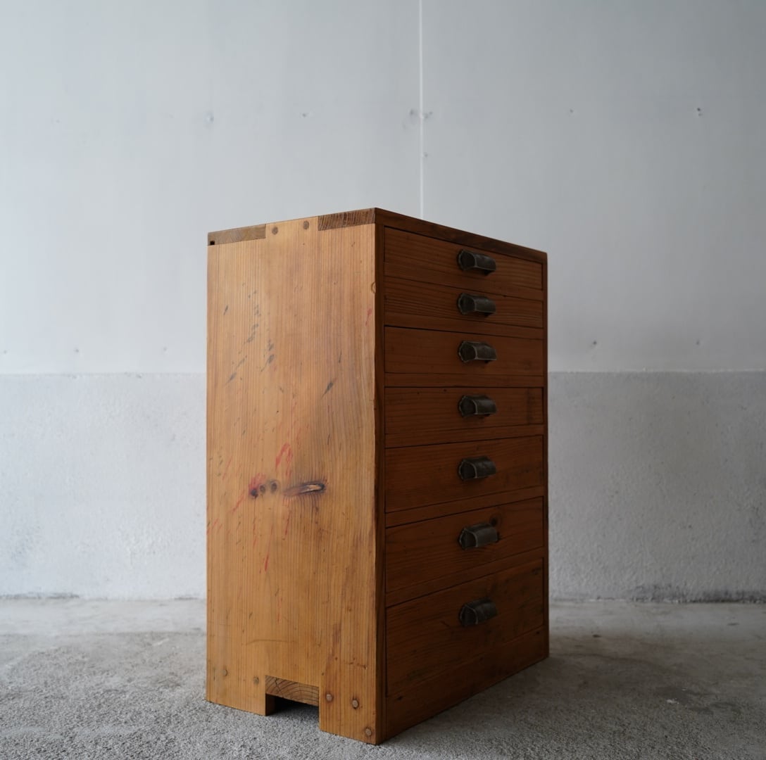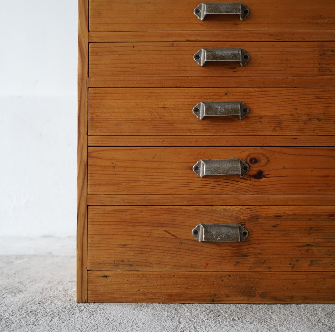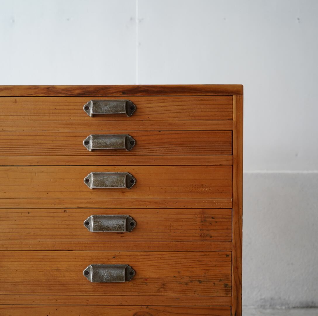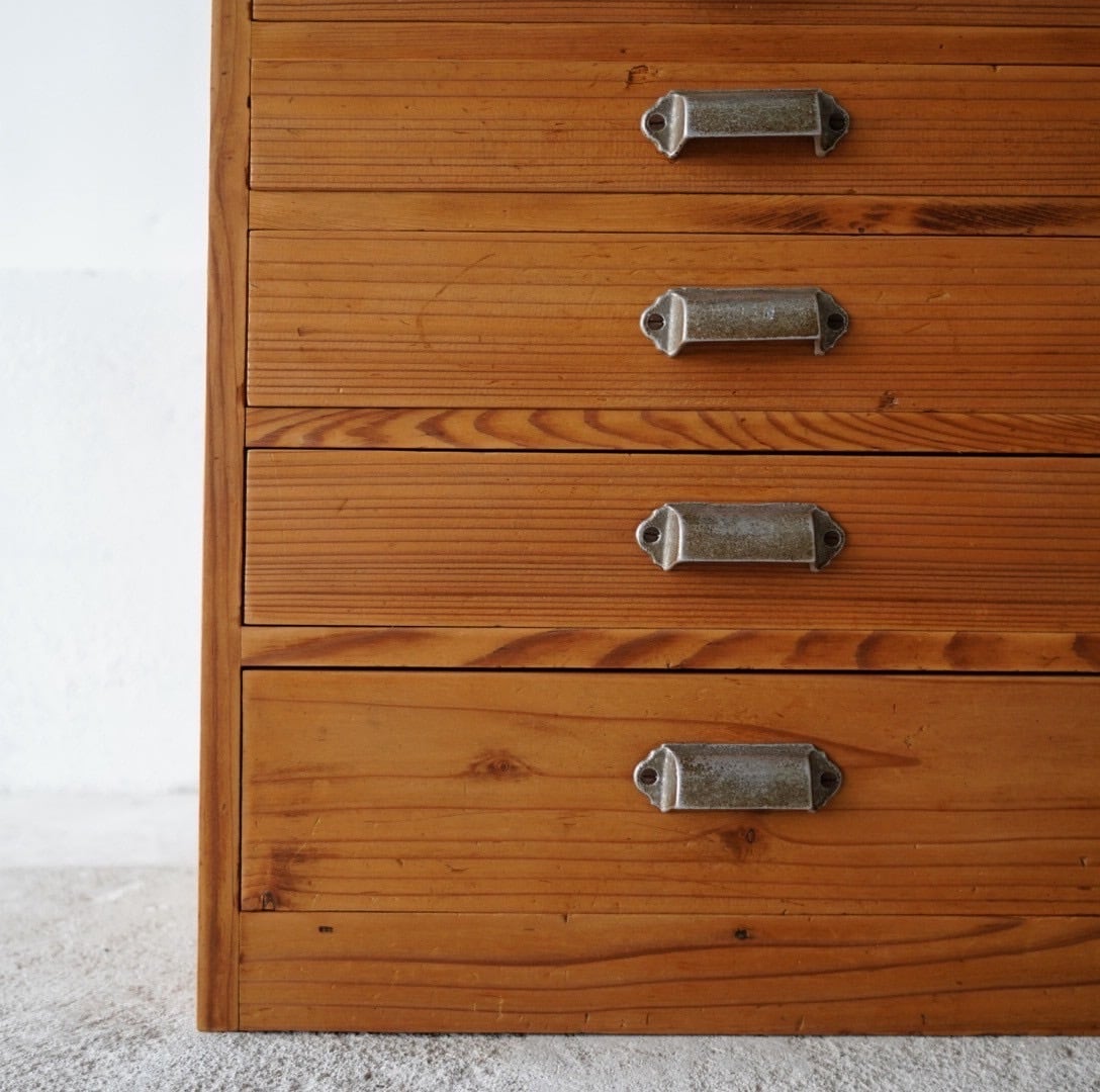 無垢材のナチュラルな木味と経年変化のあるアルミ取手が魅力的な7杯の引き出し2点。
