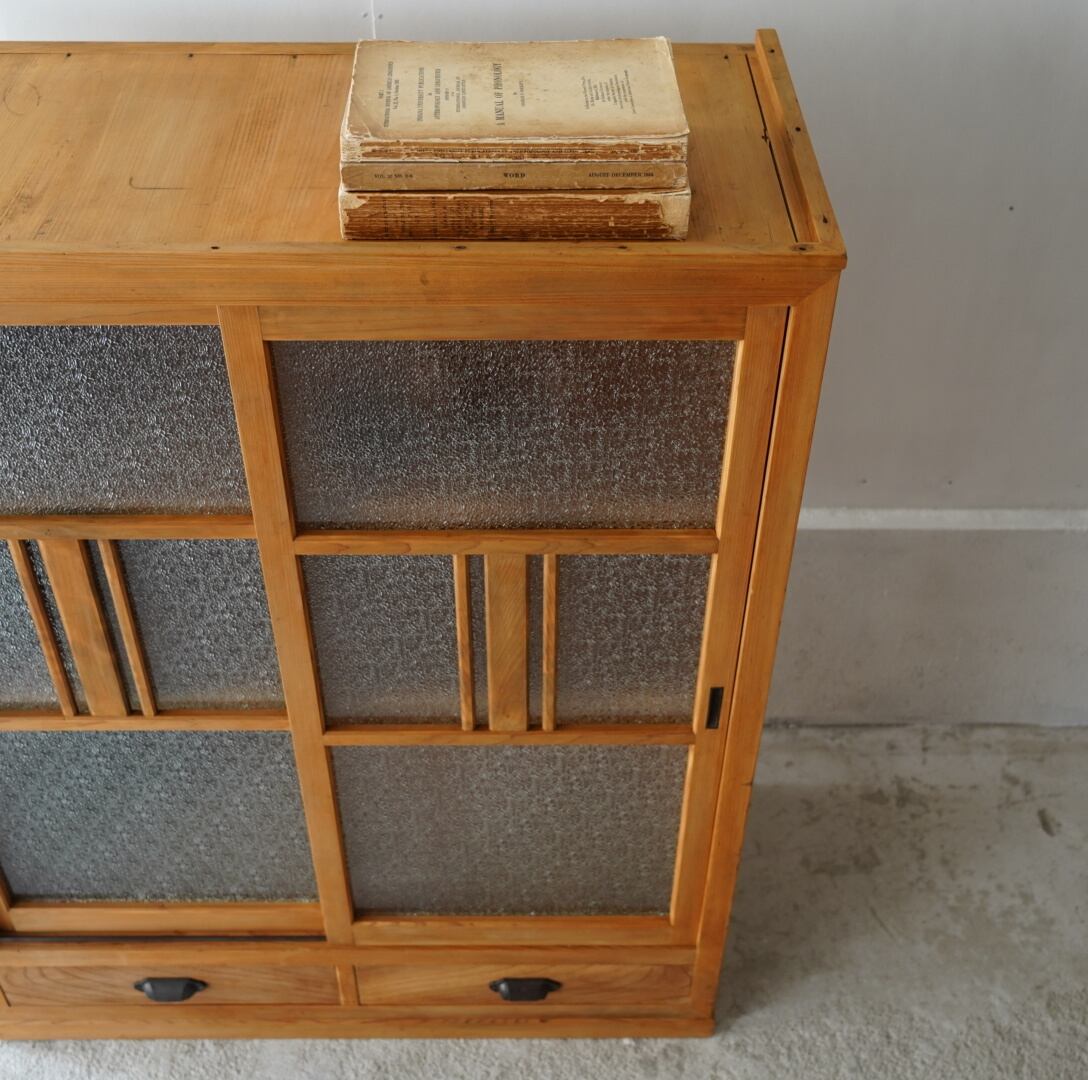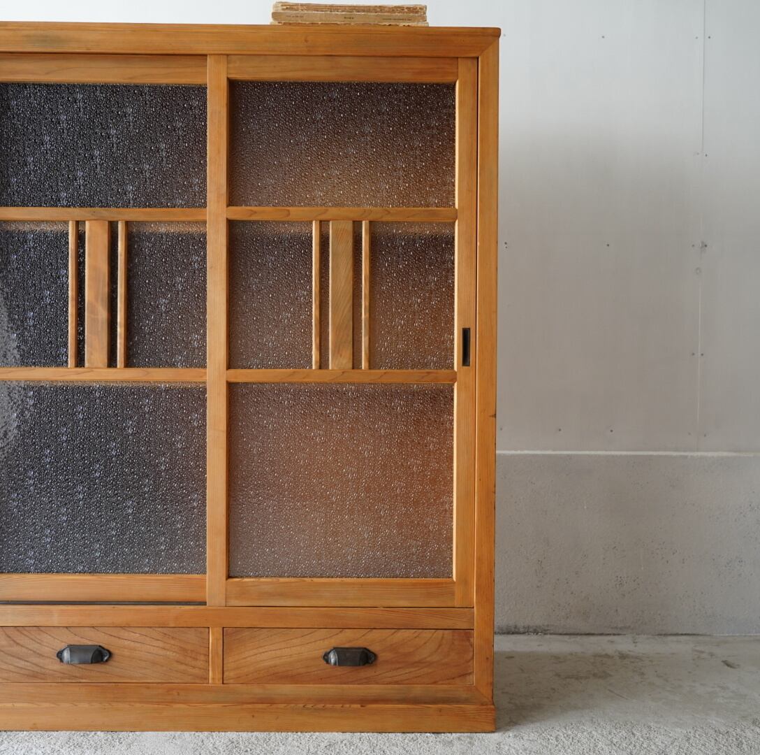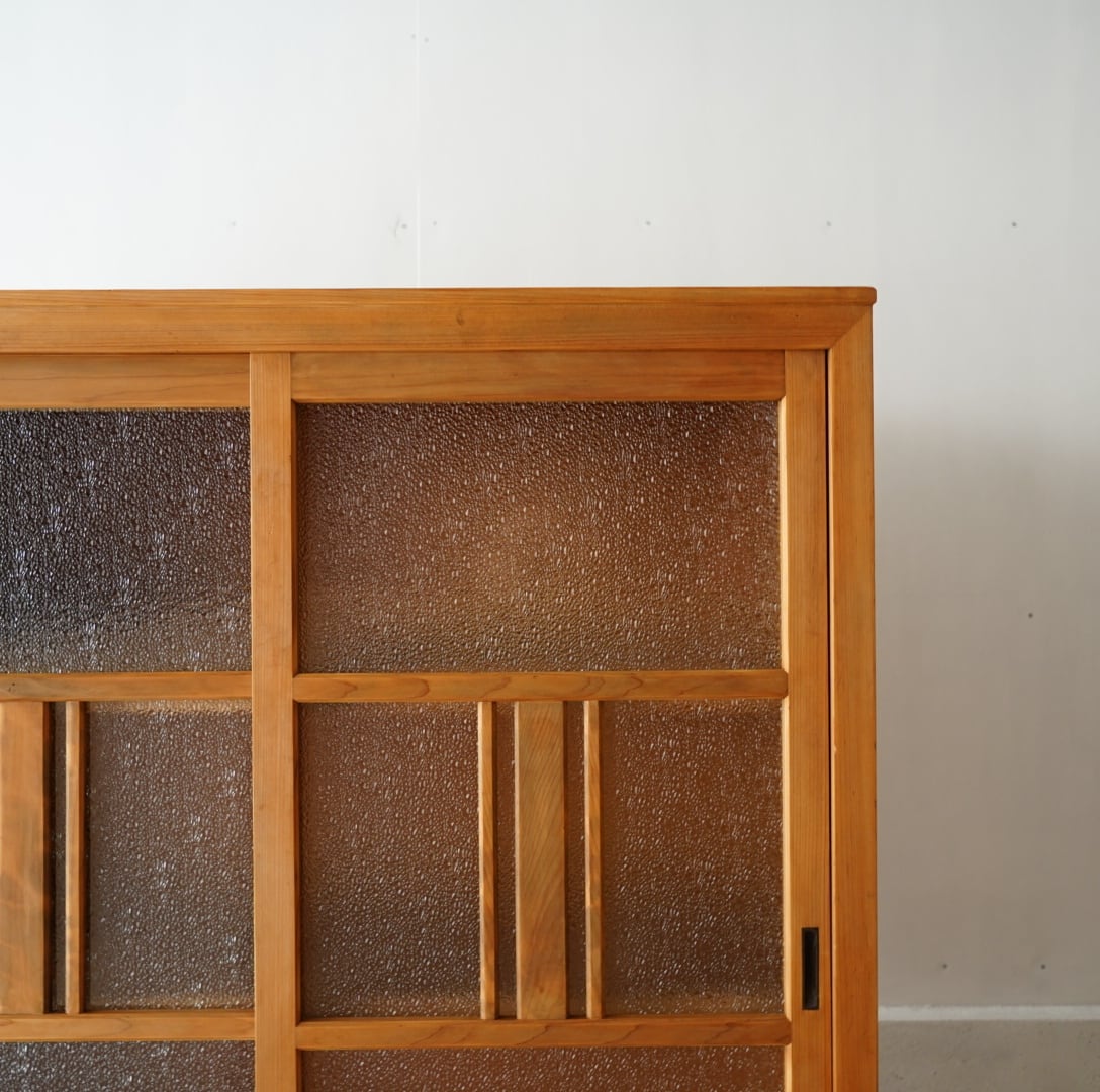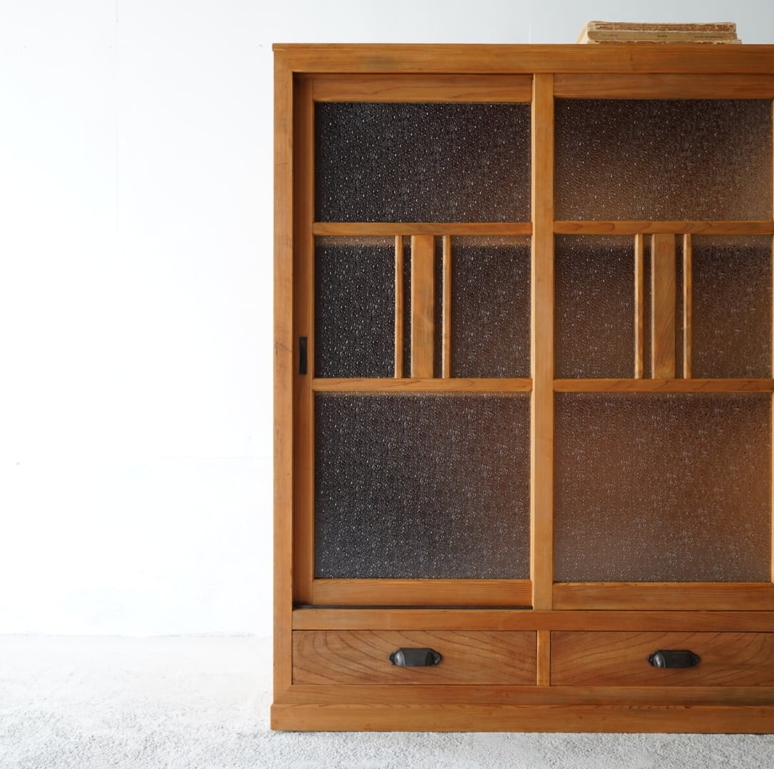 無垢材のナチュラルな木味と大きなダイヤガラスの引き戸が美しいキャビネット。