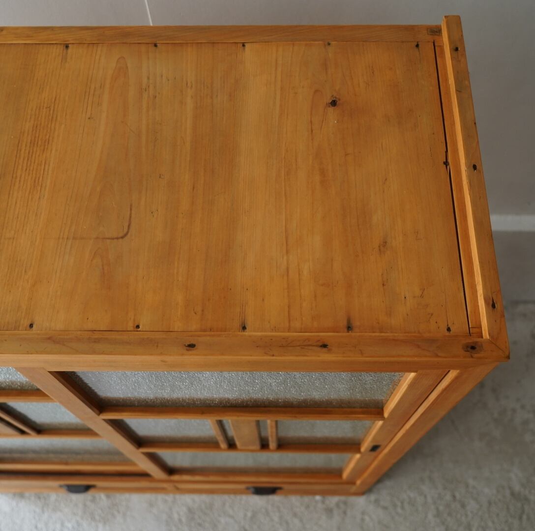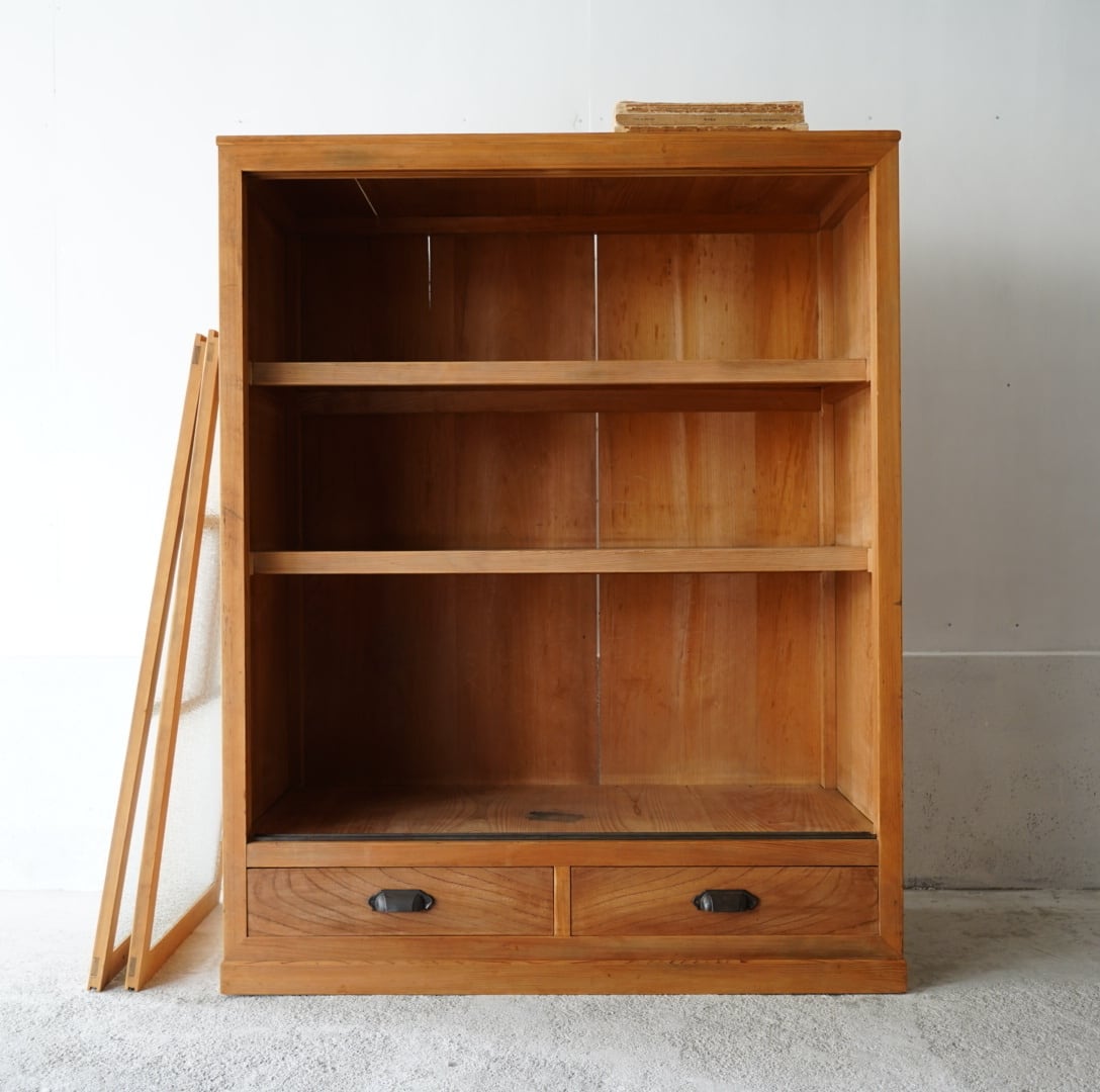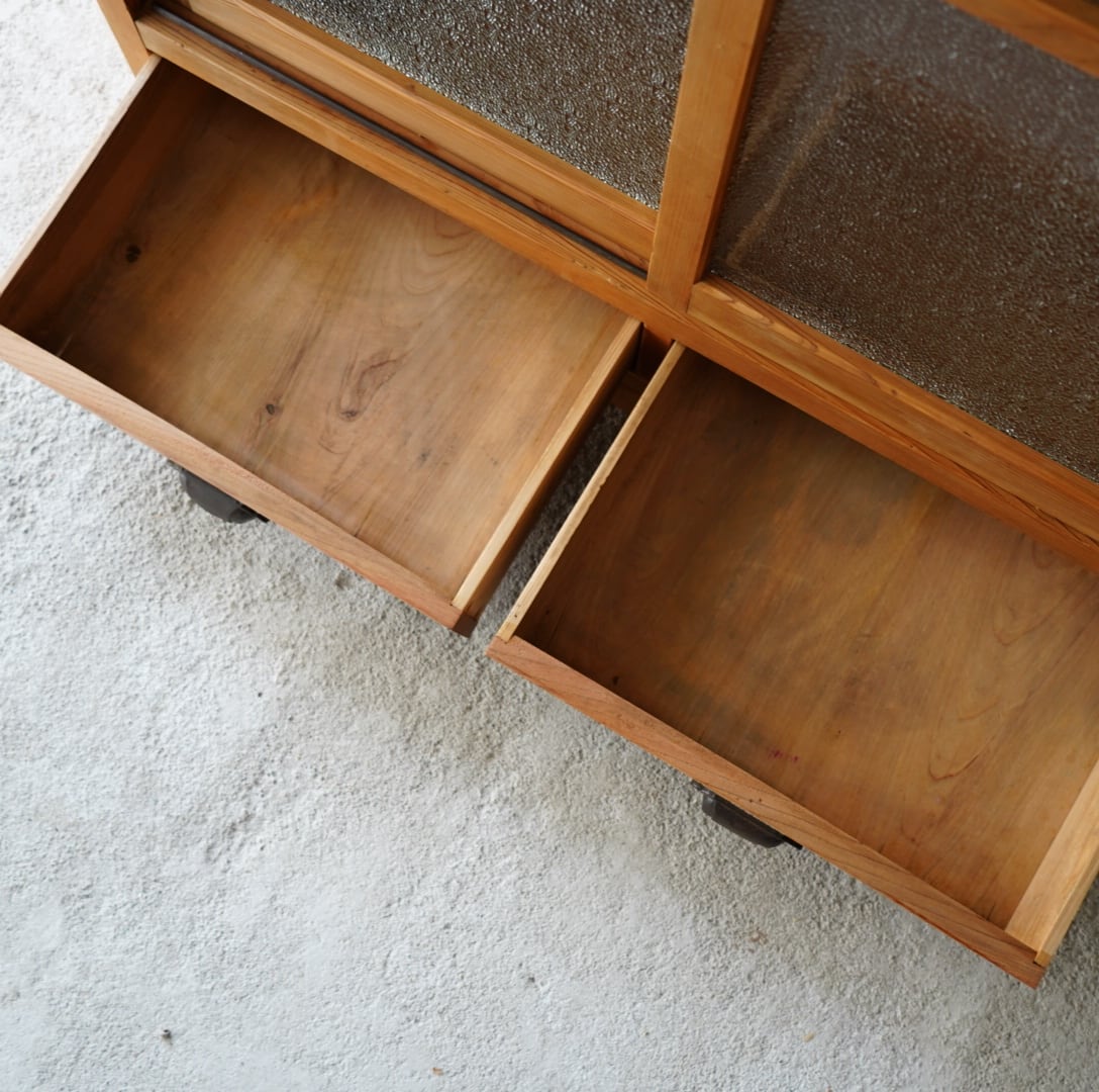 無垢材のナチュラルな木味と大きなダイヤガラスの引き戸が美しいキャビネット。