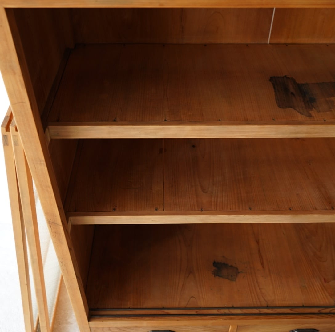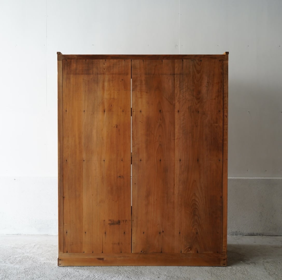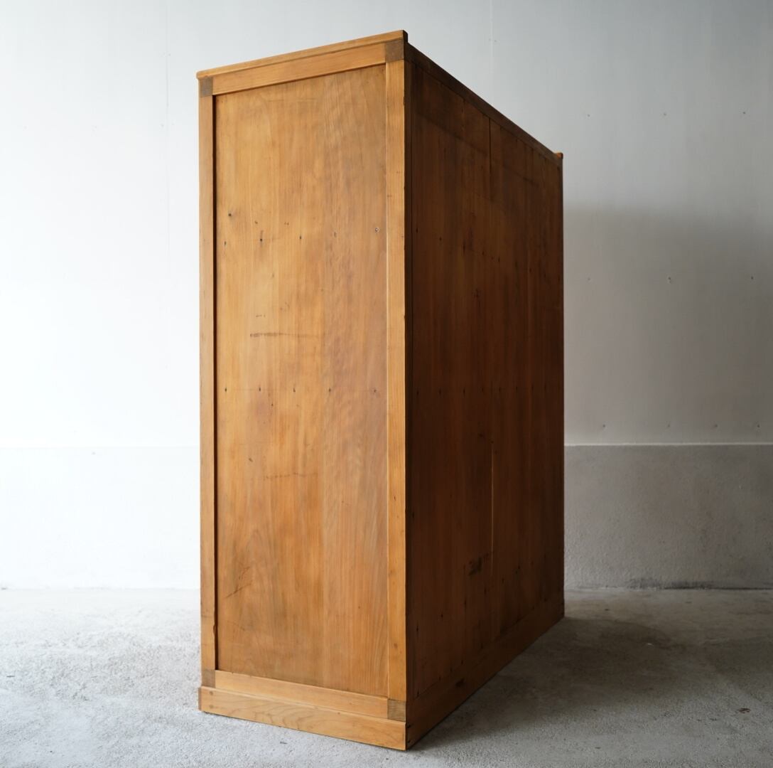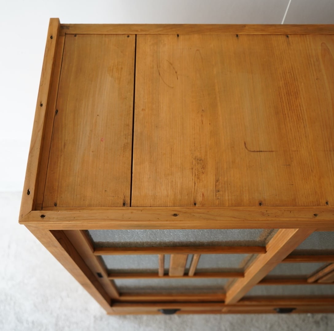 無垢材のナチュラルな木味と大きなダイヤガラスの引き戸が美しいキャビネット。