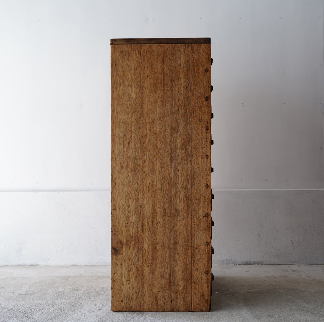 無垢材のナチュラルな木味と並んだ真鍮取手とネームプレートが美しい18杯の引き出し。