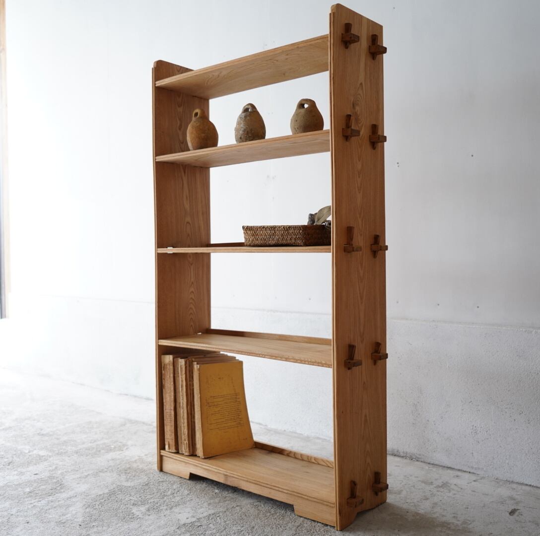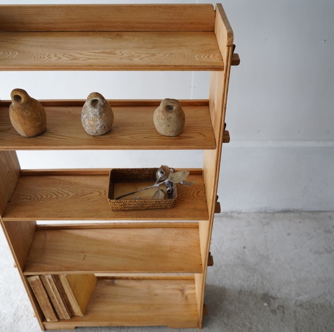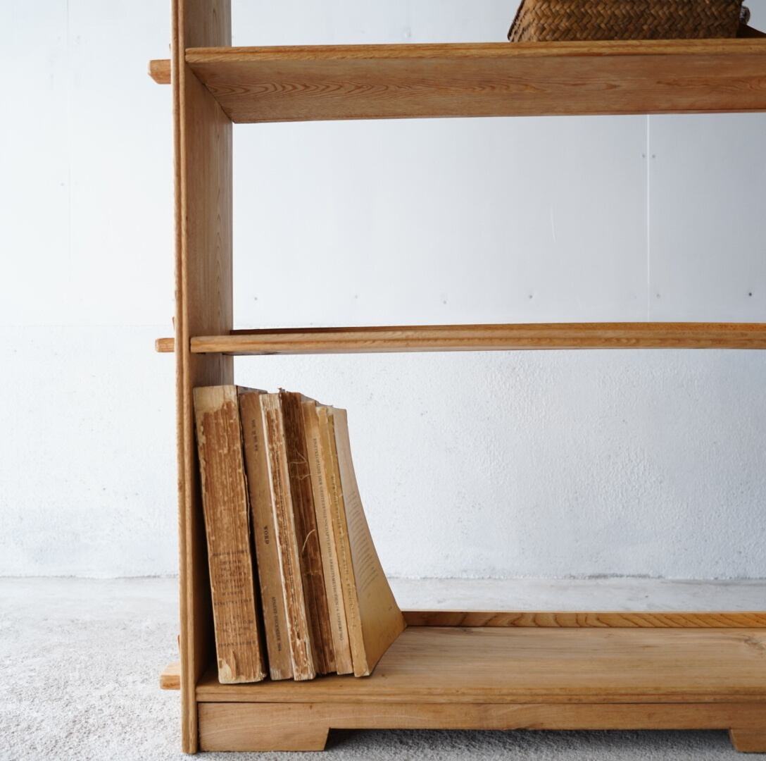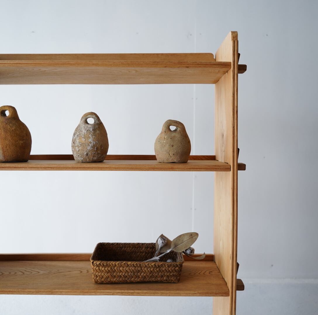 古い無垢材の素朴な風合いとすっきりとした佇まいが美しい5段のオープンラック。