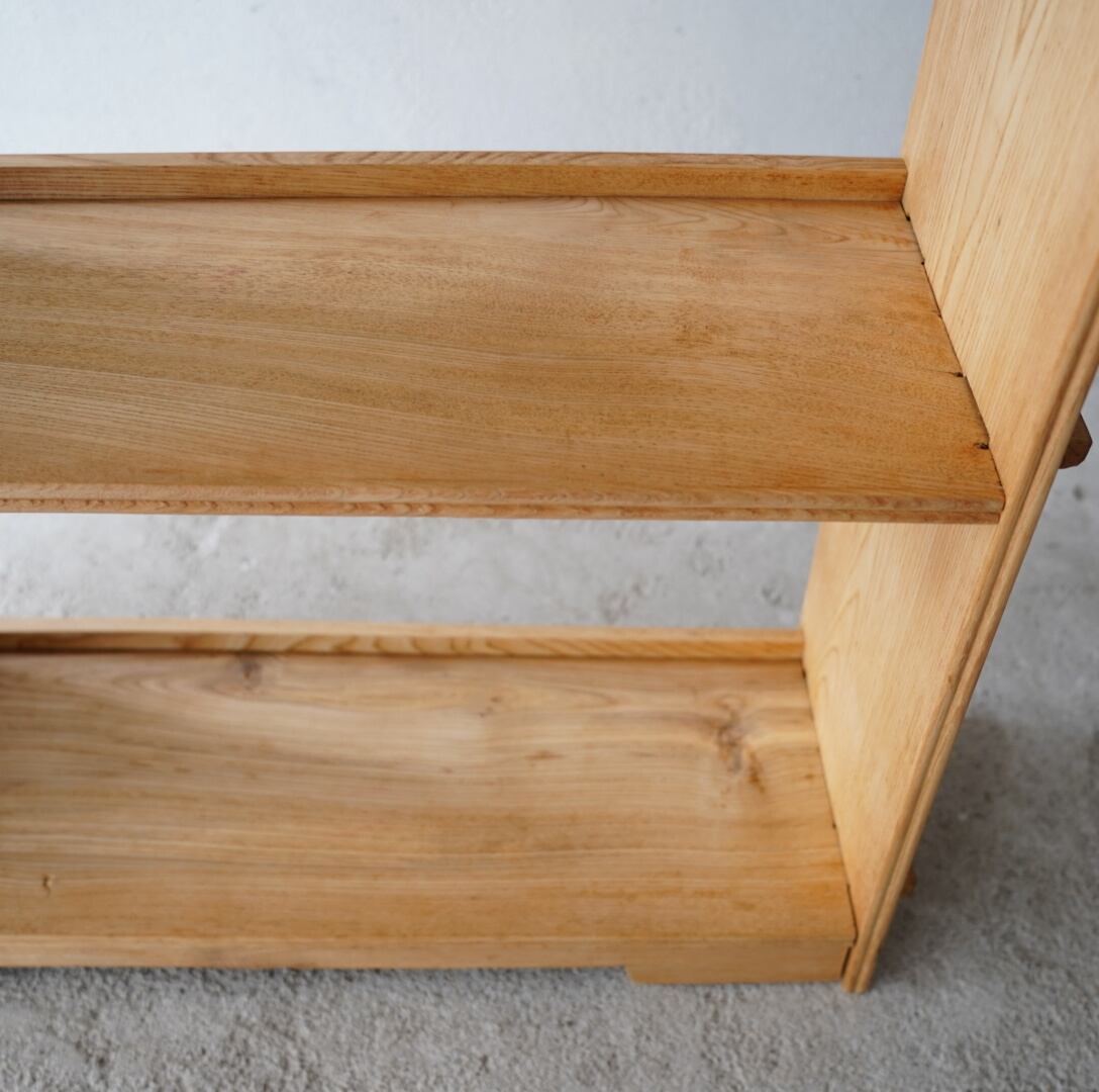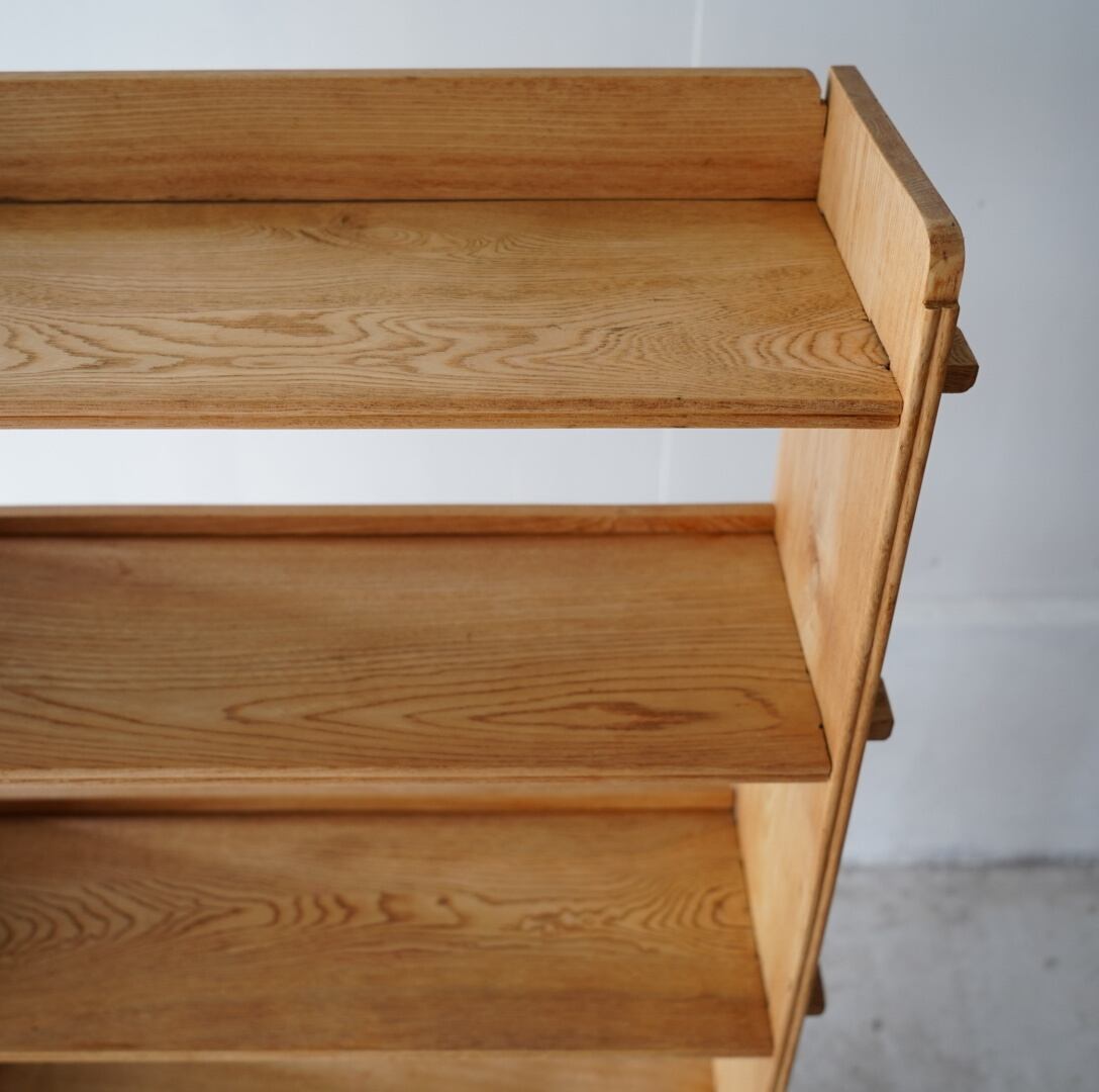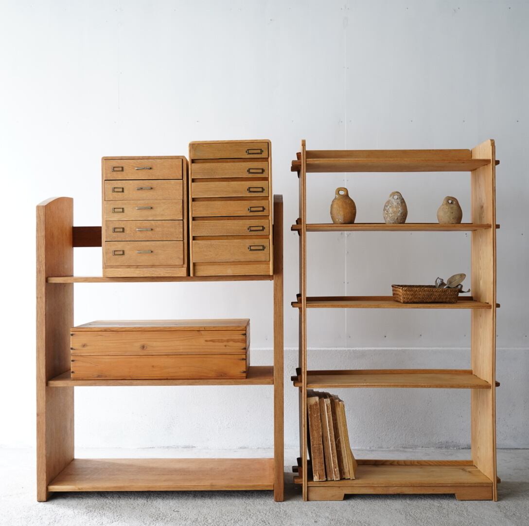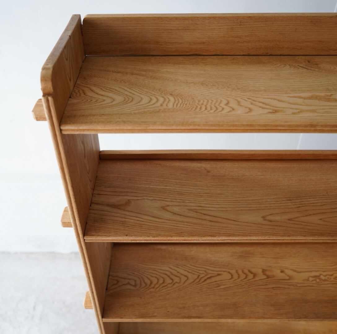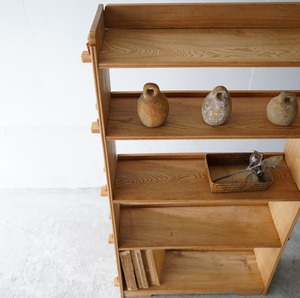古い無垢材の素朴な風合いとすっきりとした佇まいが美しい5段のオープンラック。