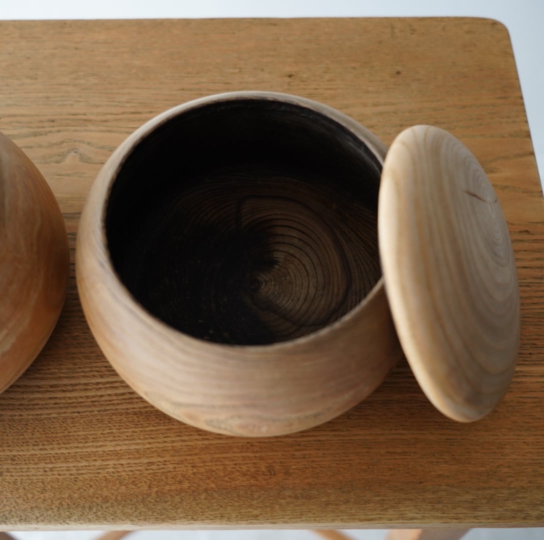 木をくり抜いてつくられた小物入れ。