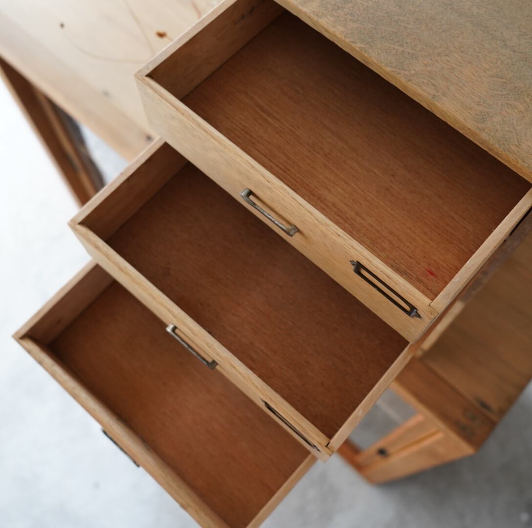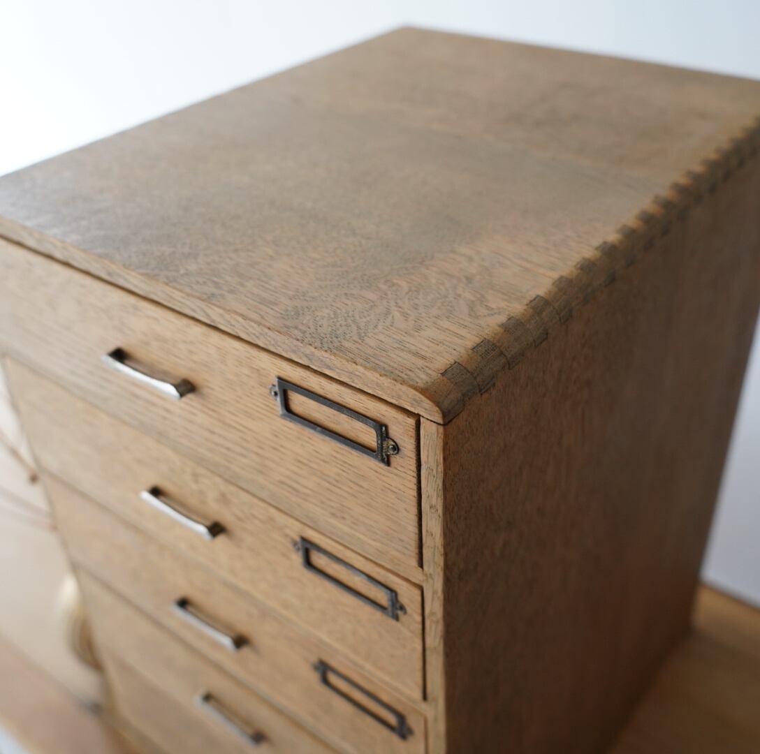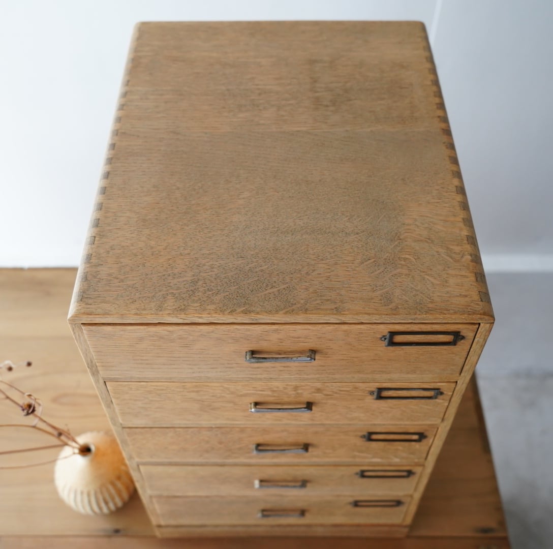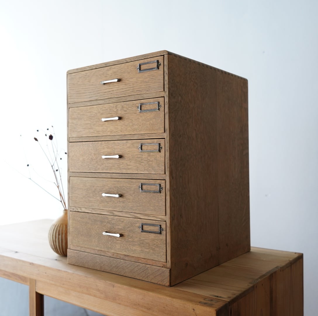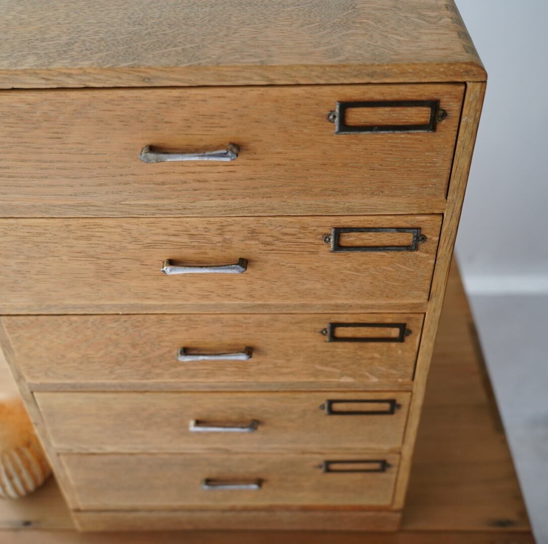 ナチュラルな木味、並んだ金属の取手とネームプレートが可愛らしい5杯の引き出し。