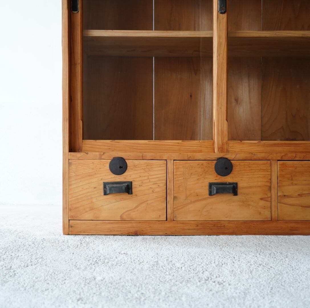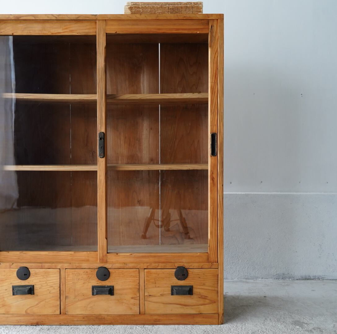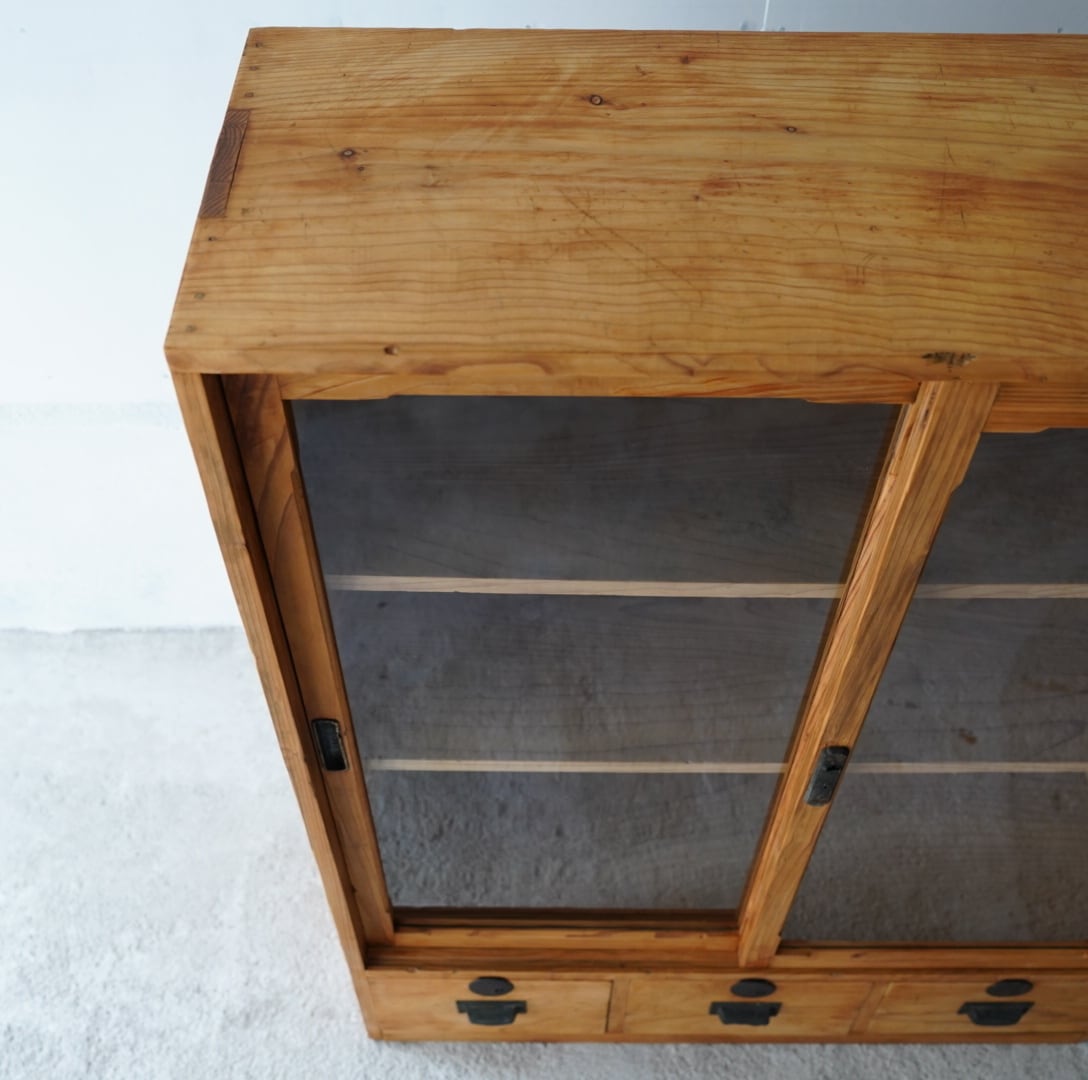 無垢材のナチュラル木味と大きなガラスの引き戸が美しいキャビネット。