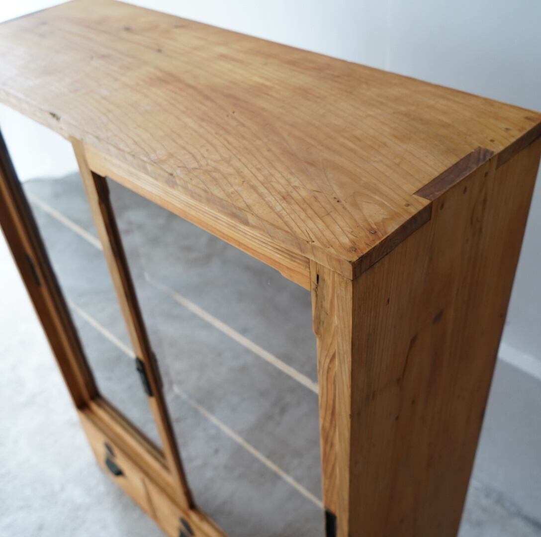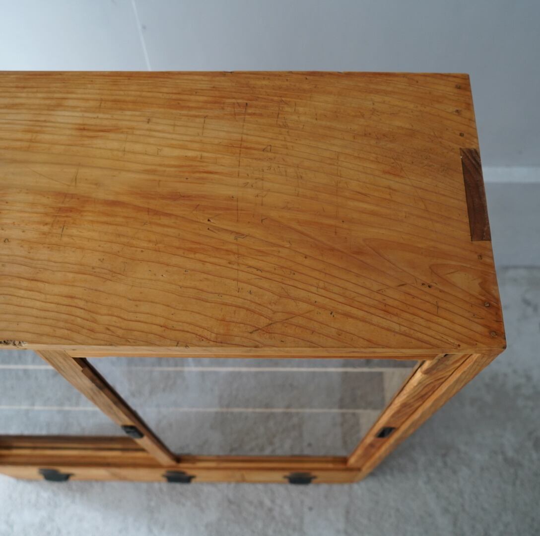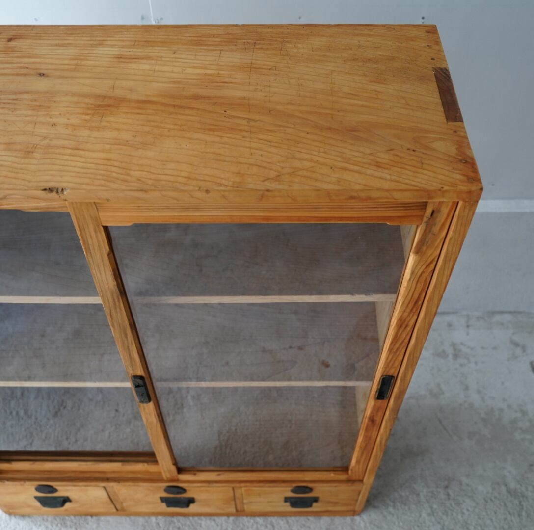 無垢材のナチュラル木味と大きなガラスの引き戸が美しいキャビネット。