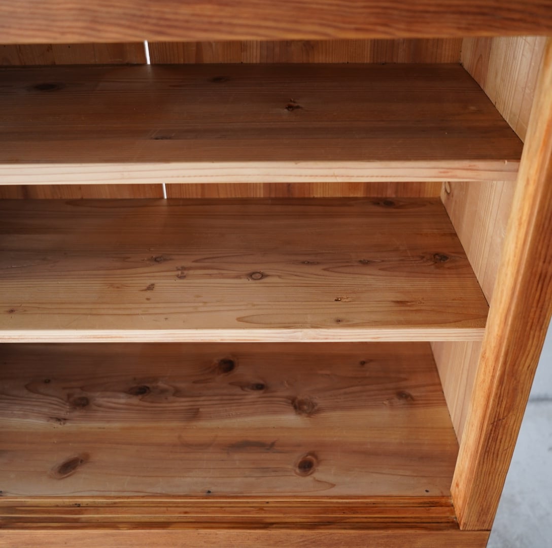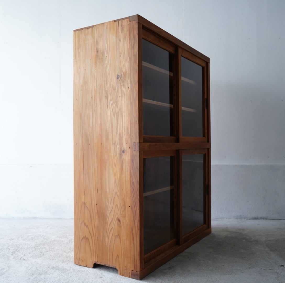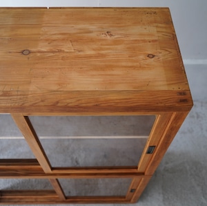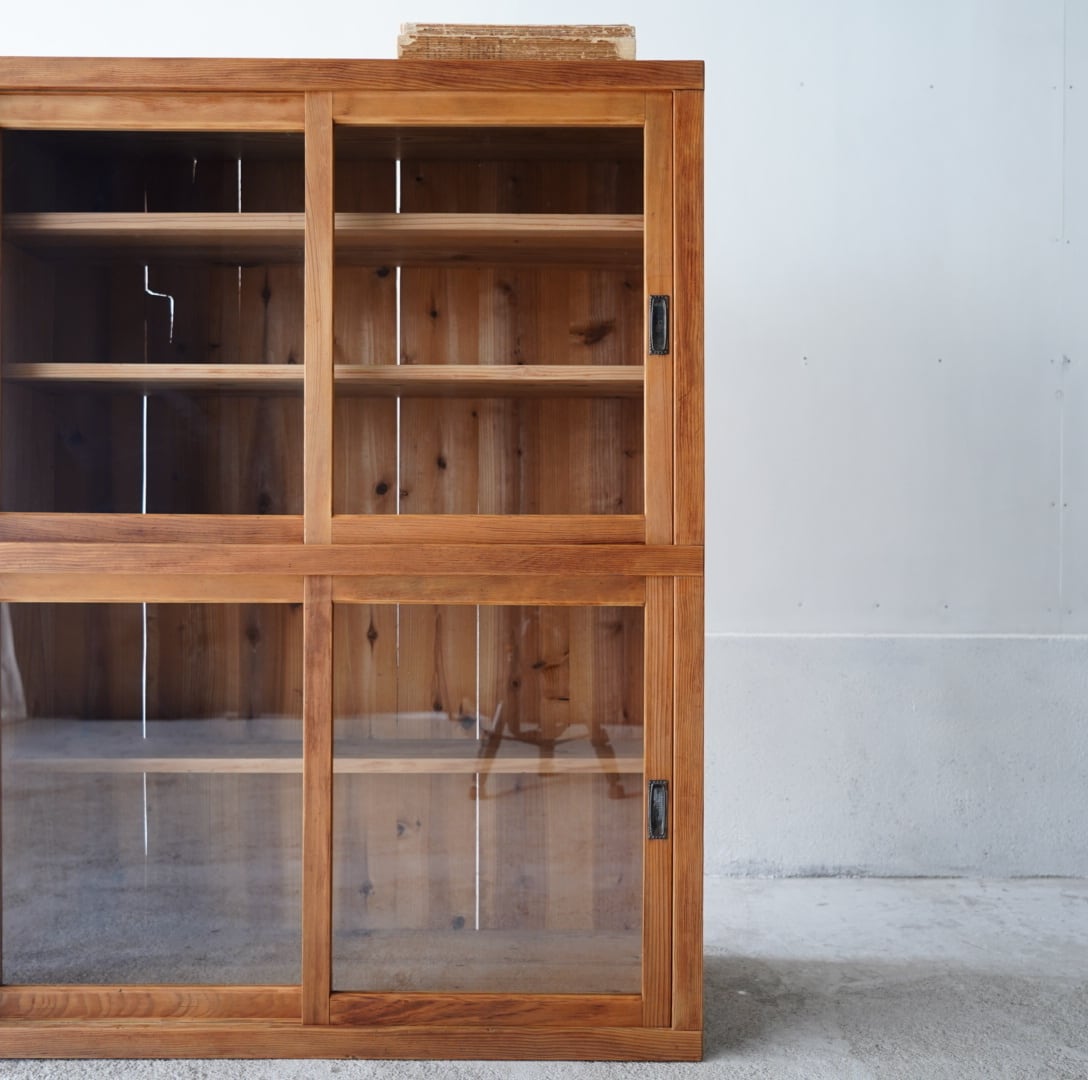 無垢材のナチュラルな木味と2段のガラス引き戸が美しいキャビネット。