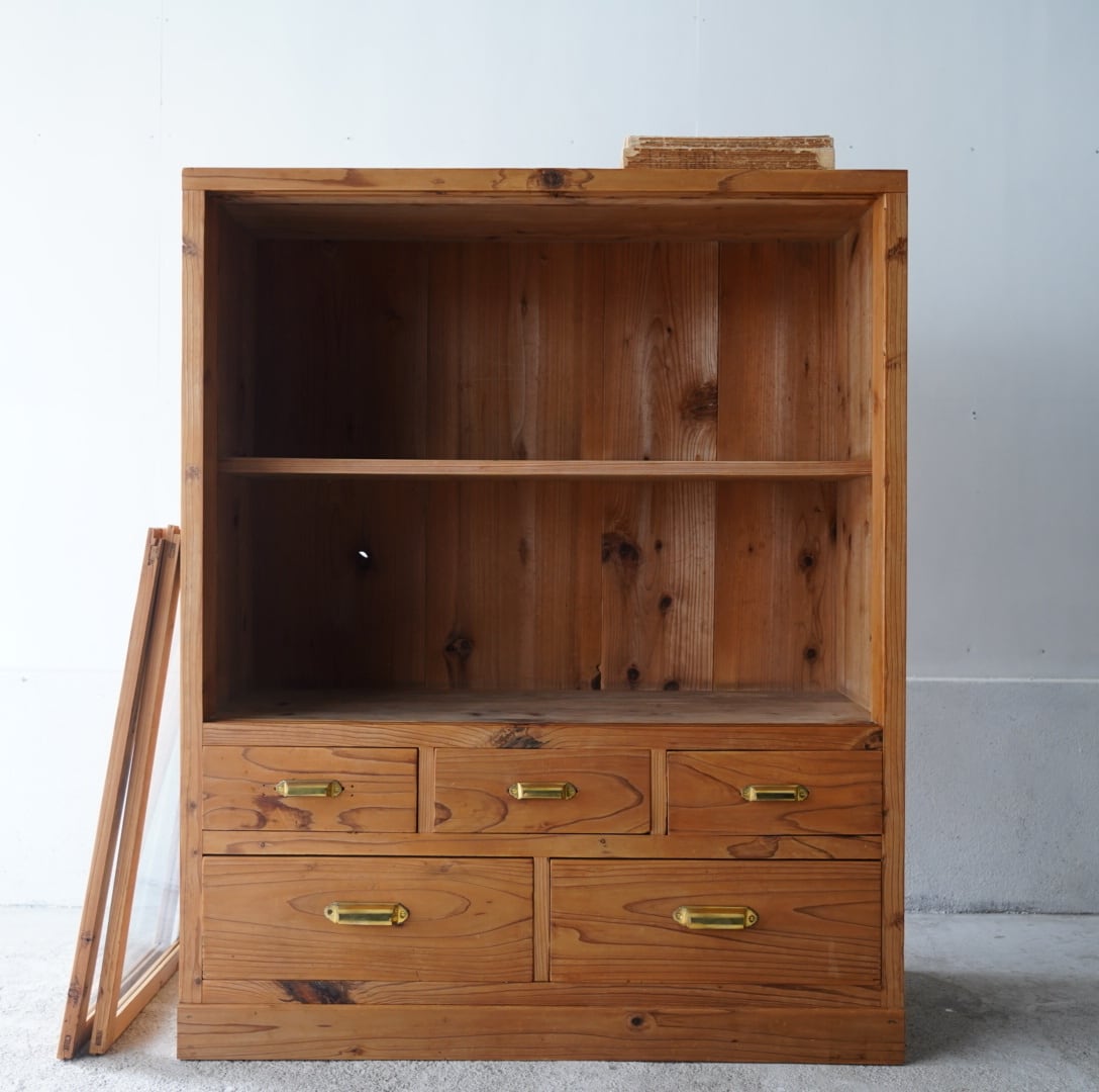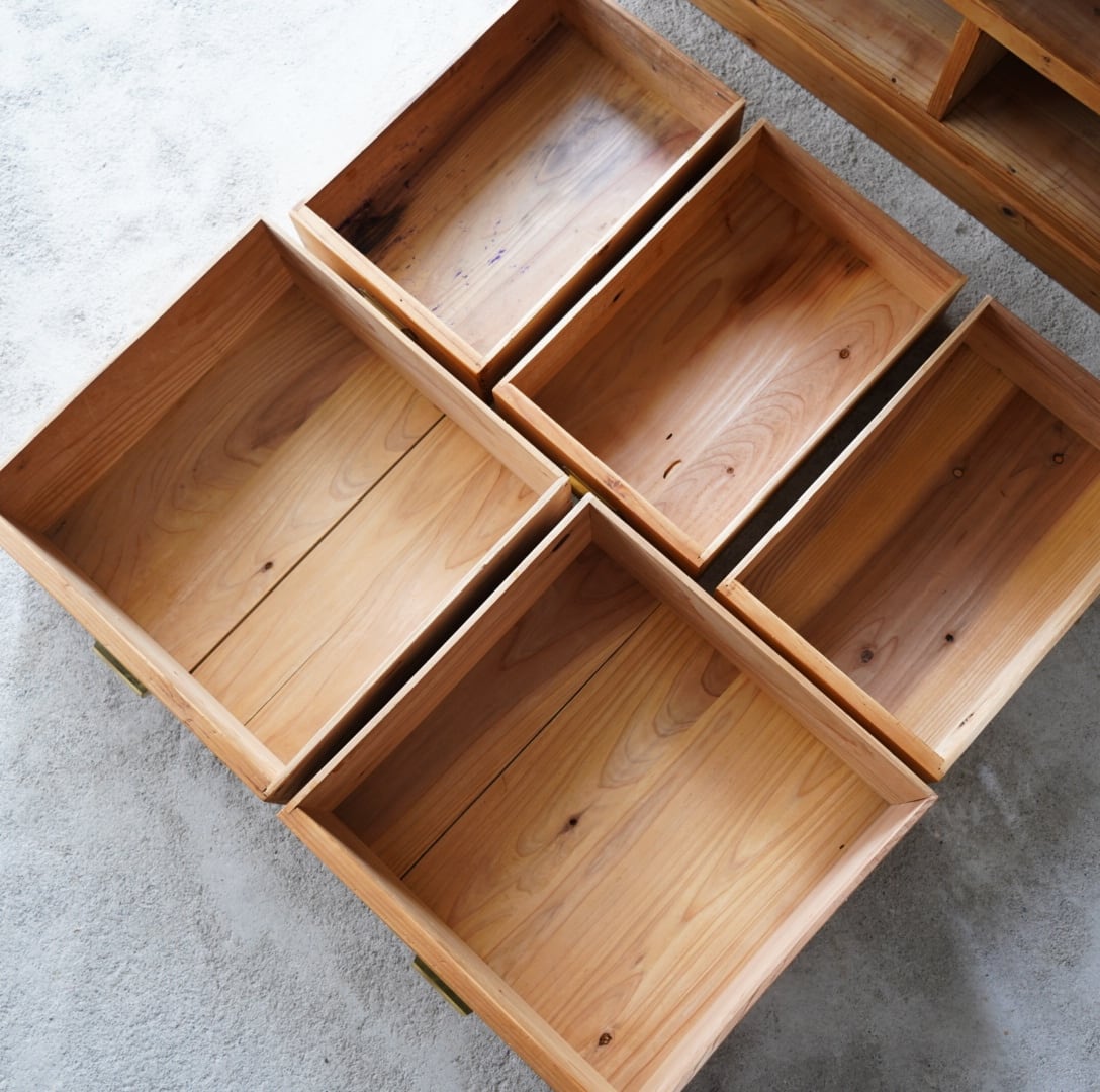 無垢材のナチュラルな木味と真鍮取手の引き出しが美しいキャビネット。