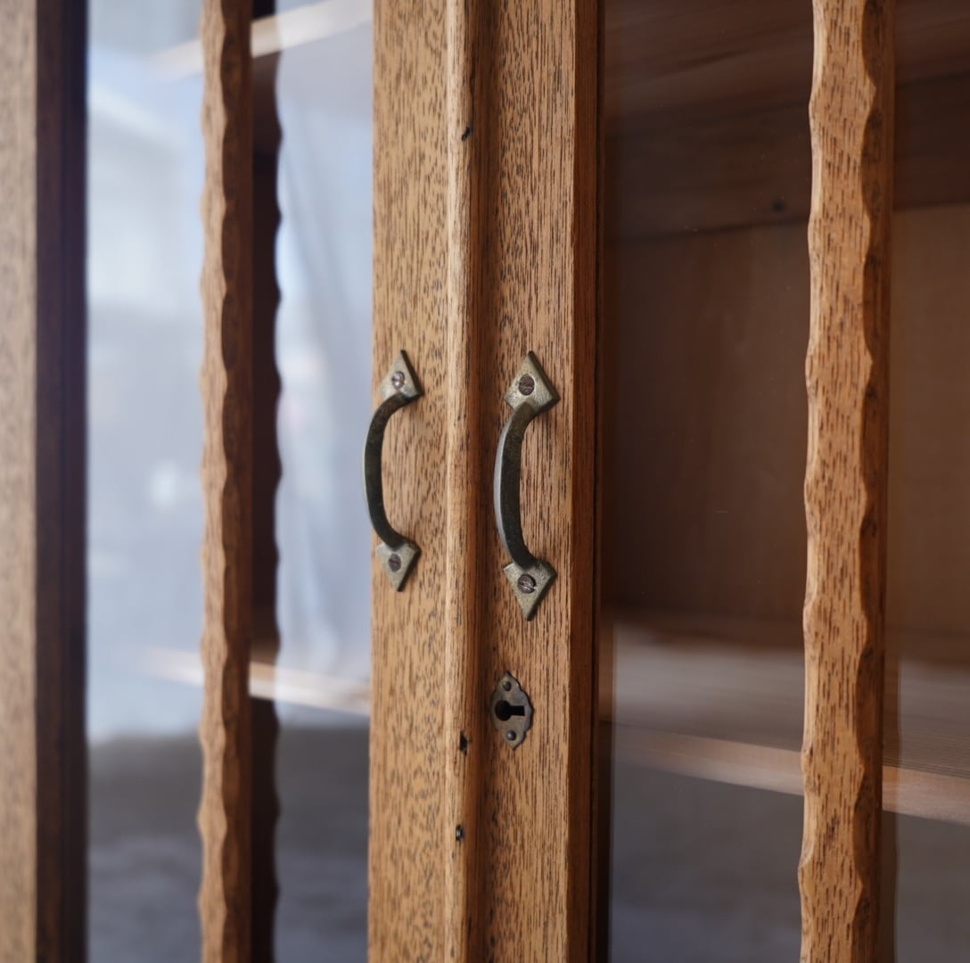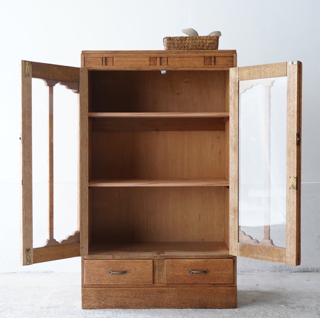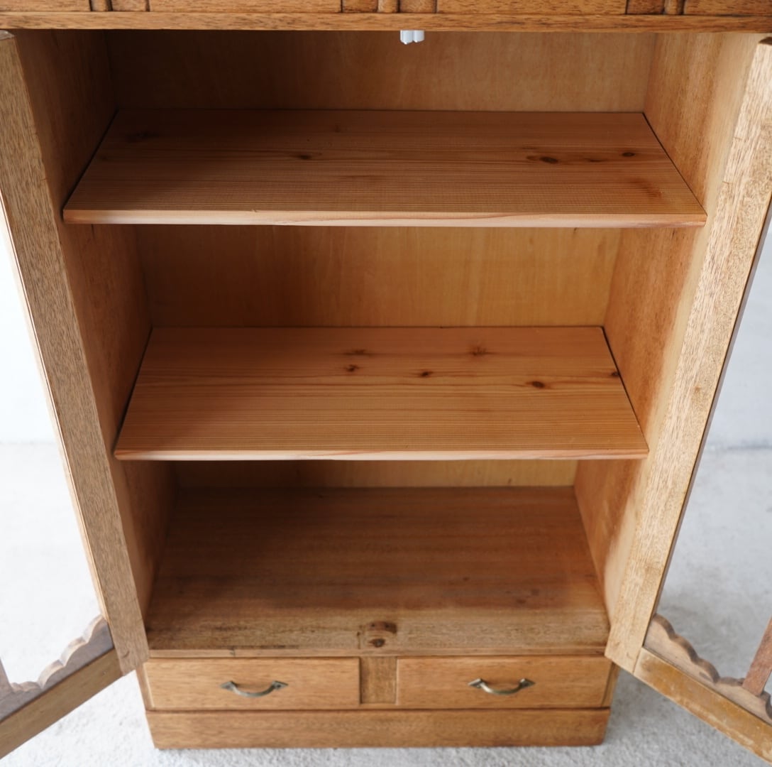 無垢材のナチュラルな木味と前面に施された装飾が美しい開き戸のキャビネット。