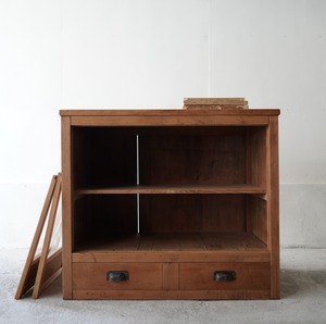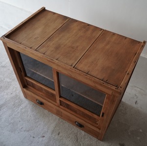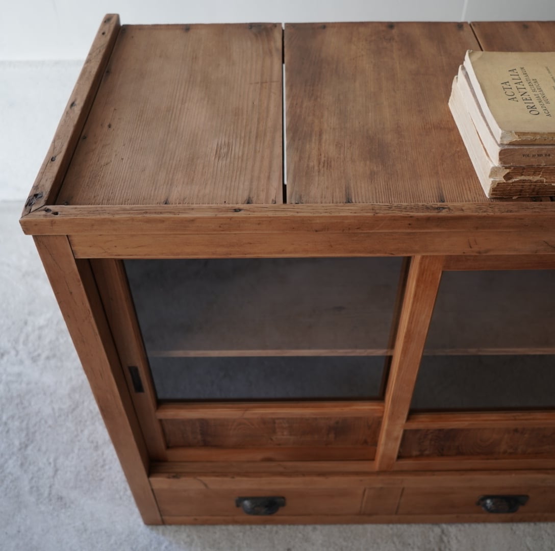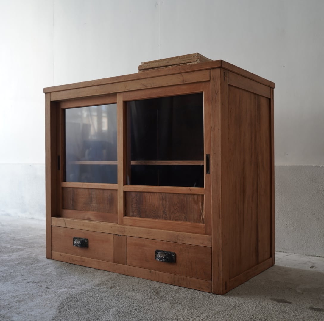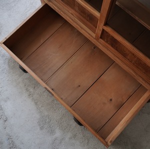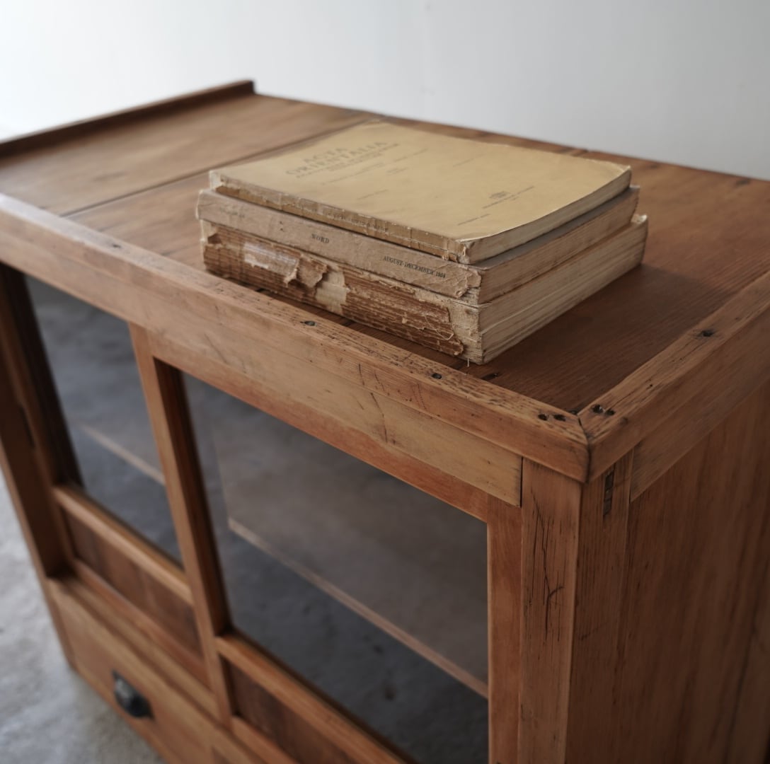 無垢材の温かみのある木味が魅力的な古いガラス戸棚。