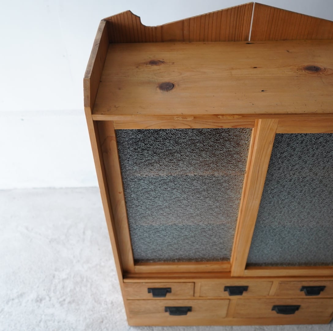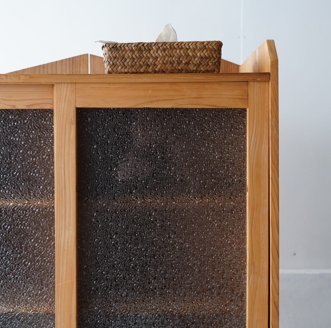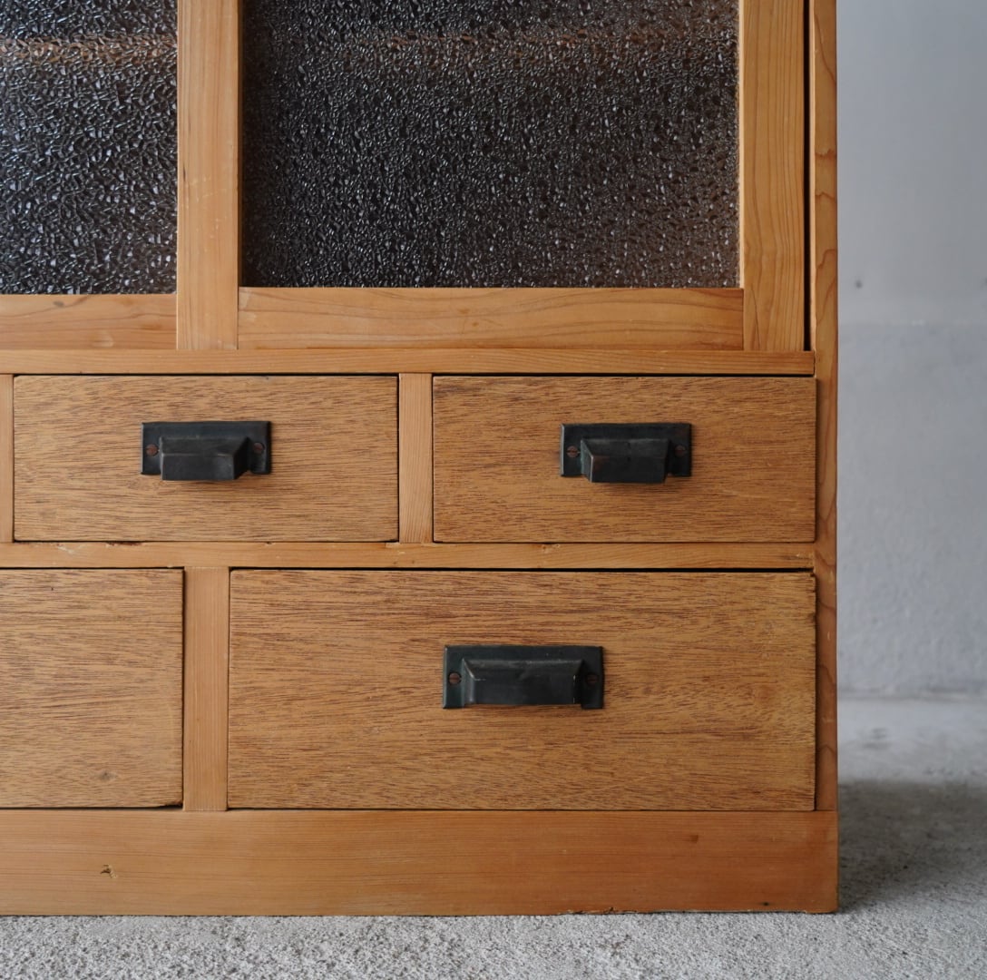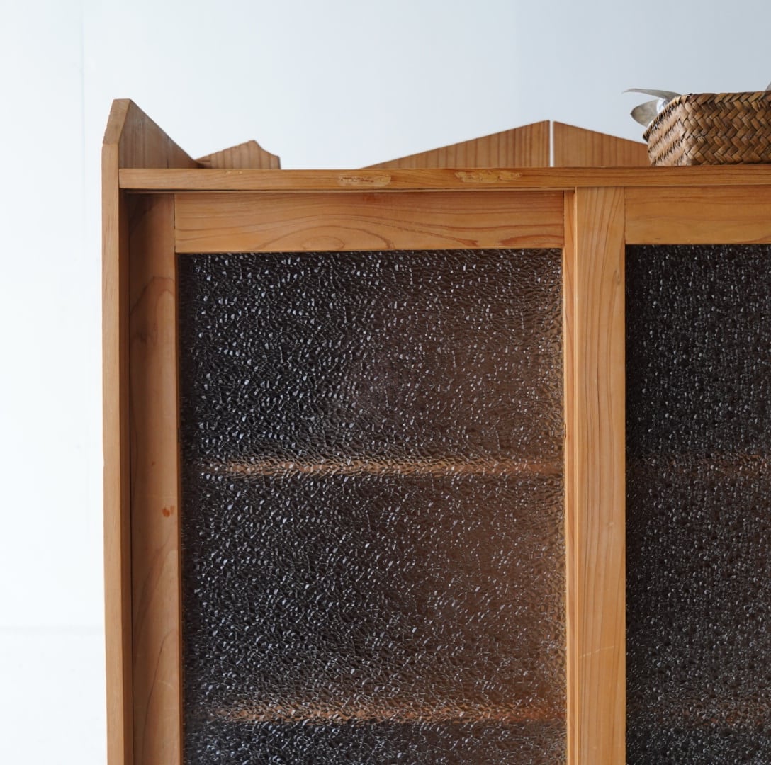 無垢材のナチュラルな木味と大きなダイヤガラスの開き戸が美しいキャビネット。