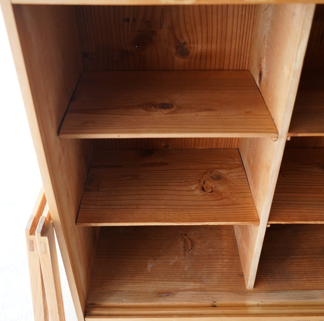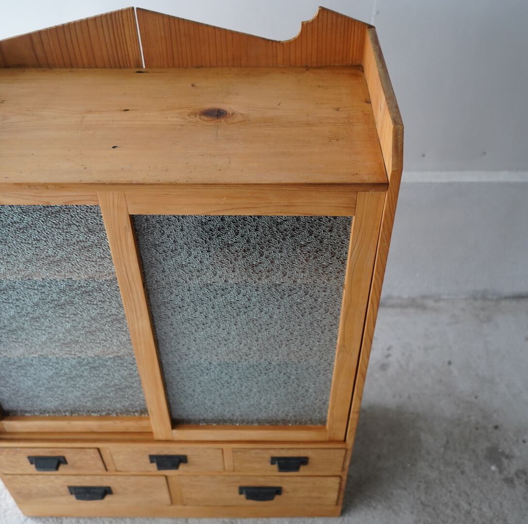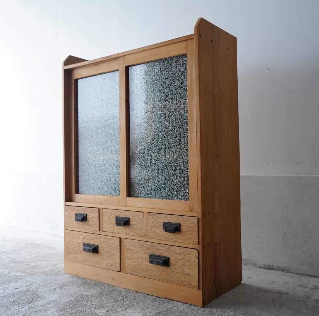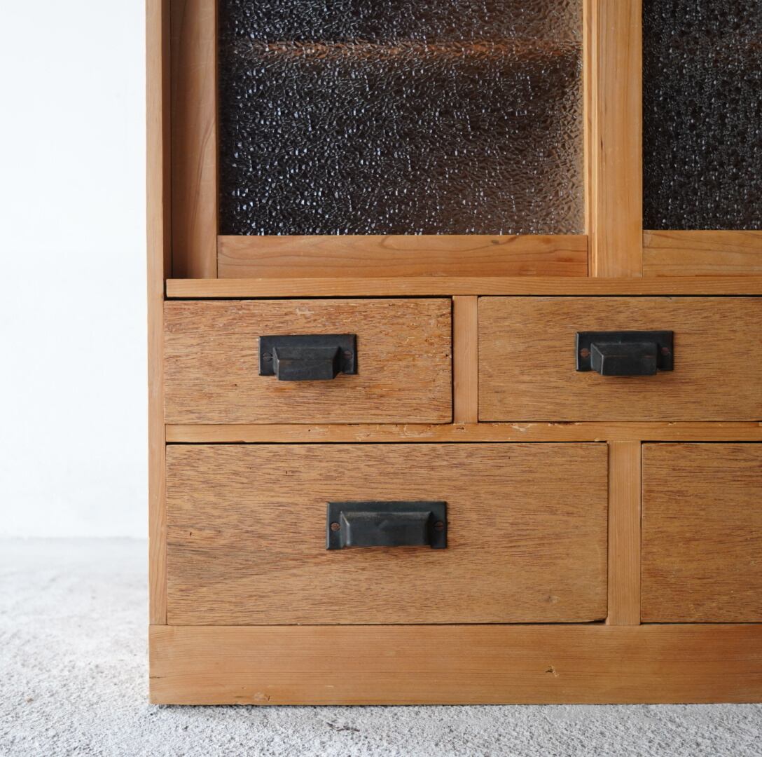 無垢材のナチュラルな木味と大きなダイヤガラスの開き戸が美しいキャビネット。