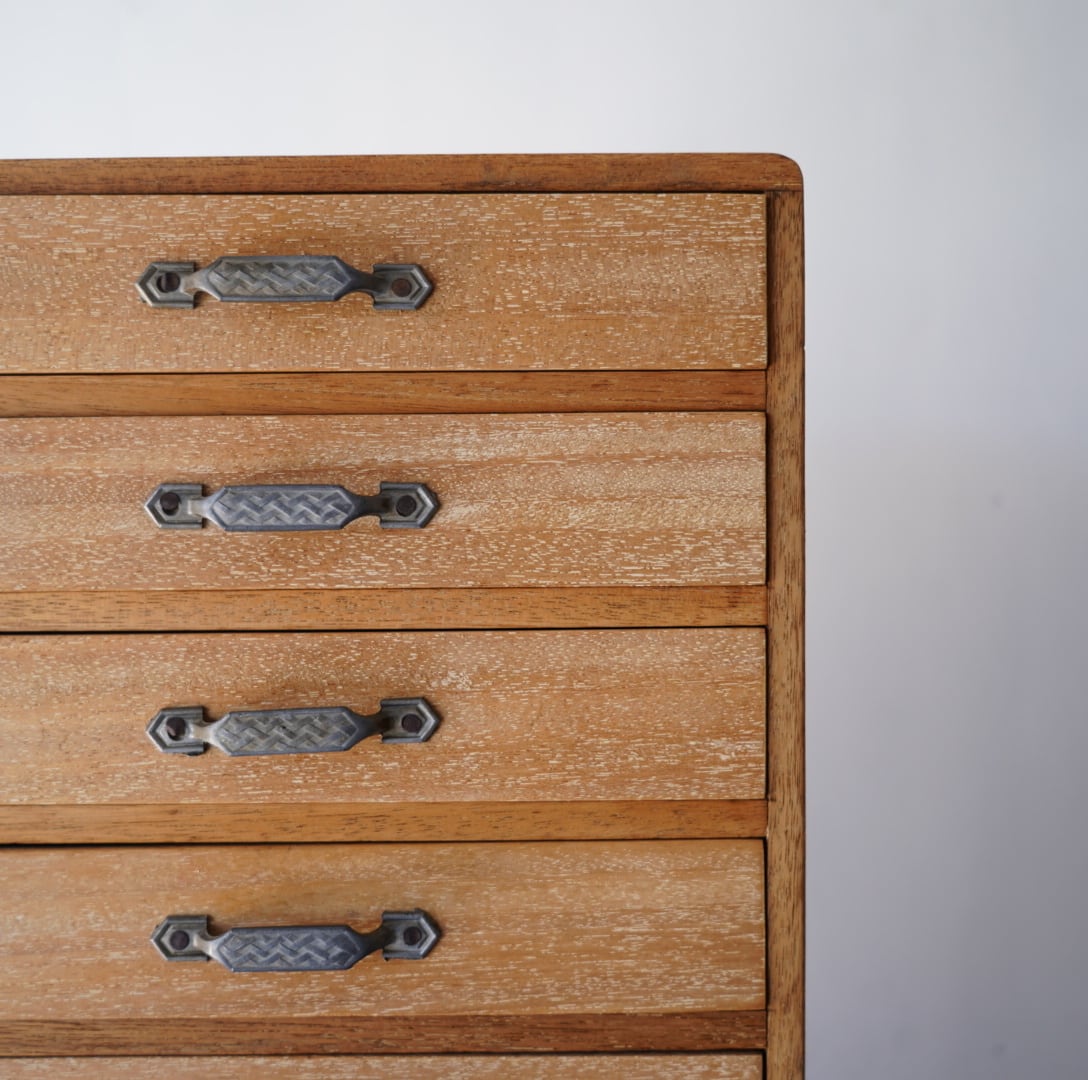 ナチュラルな木味と古いアルミの取手が可愛らしい7杯の引き出し。