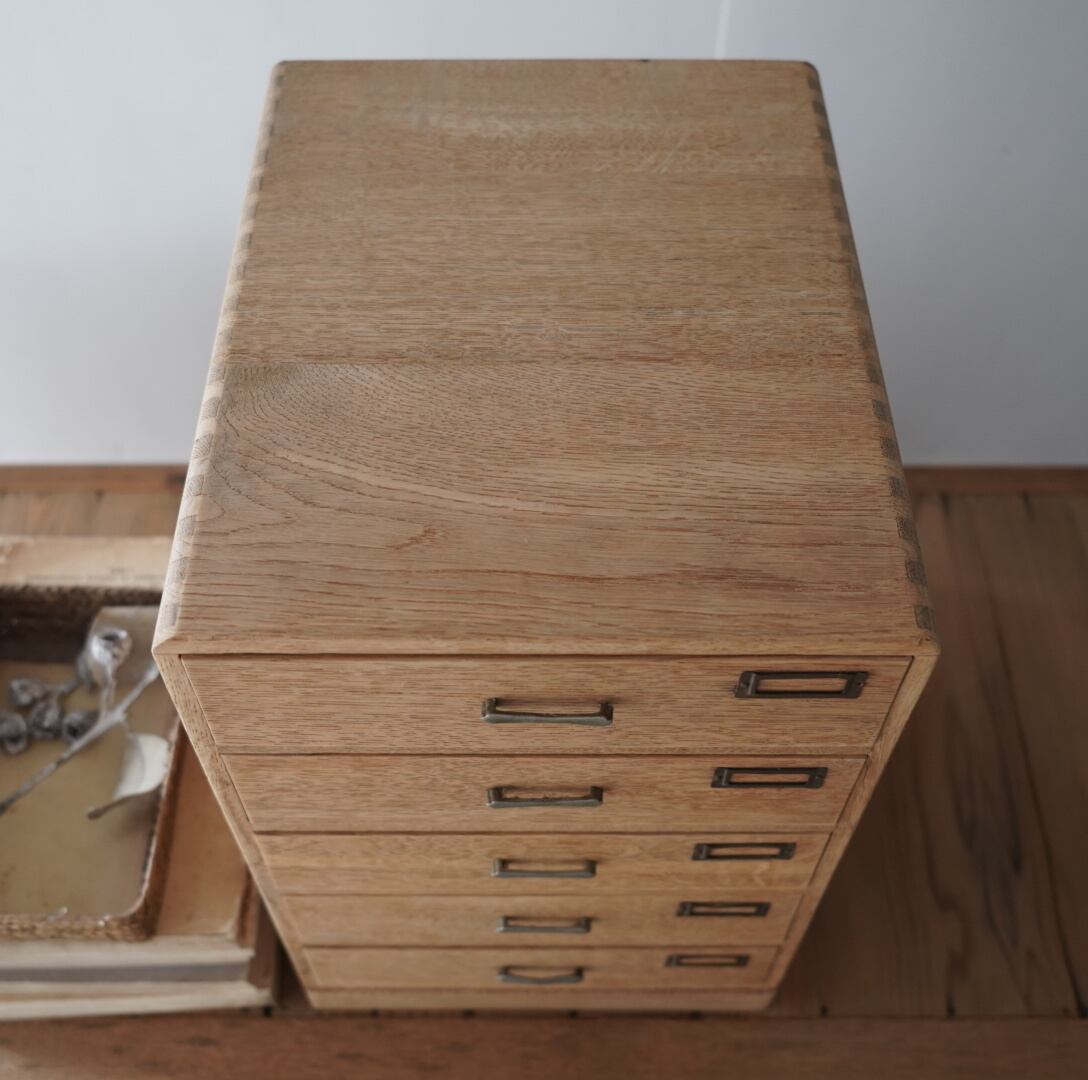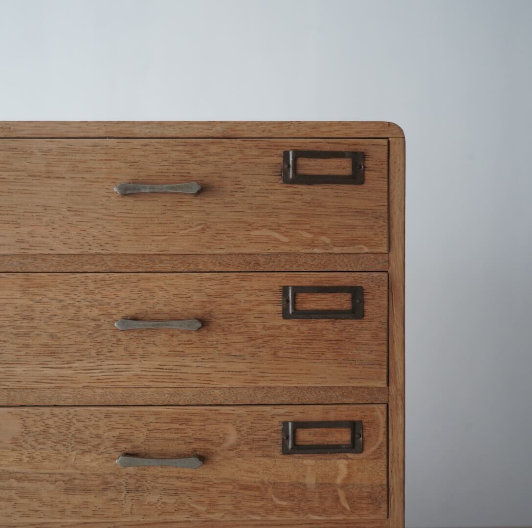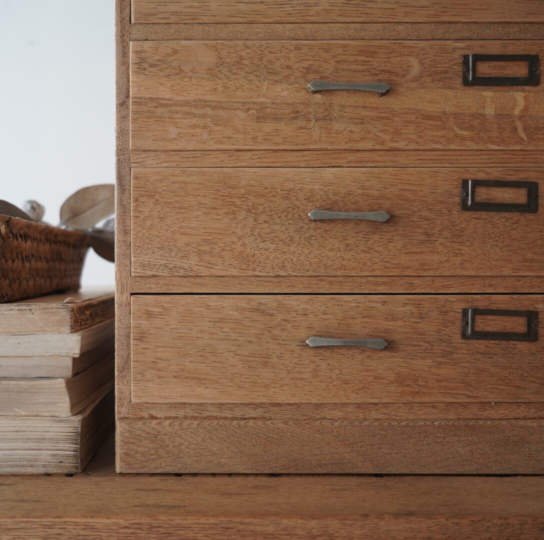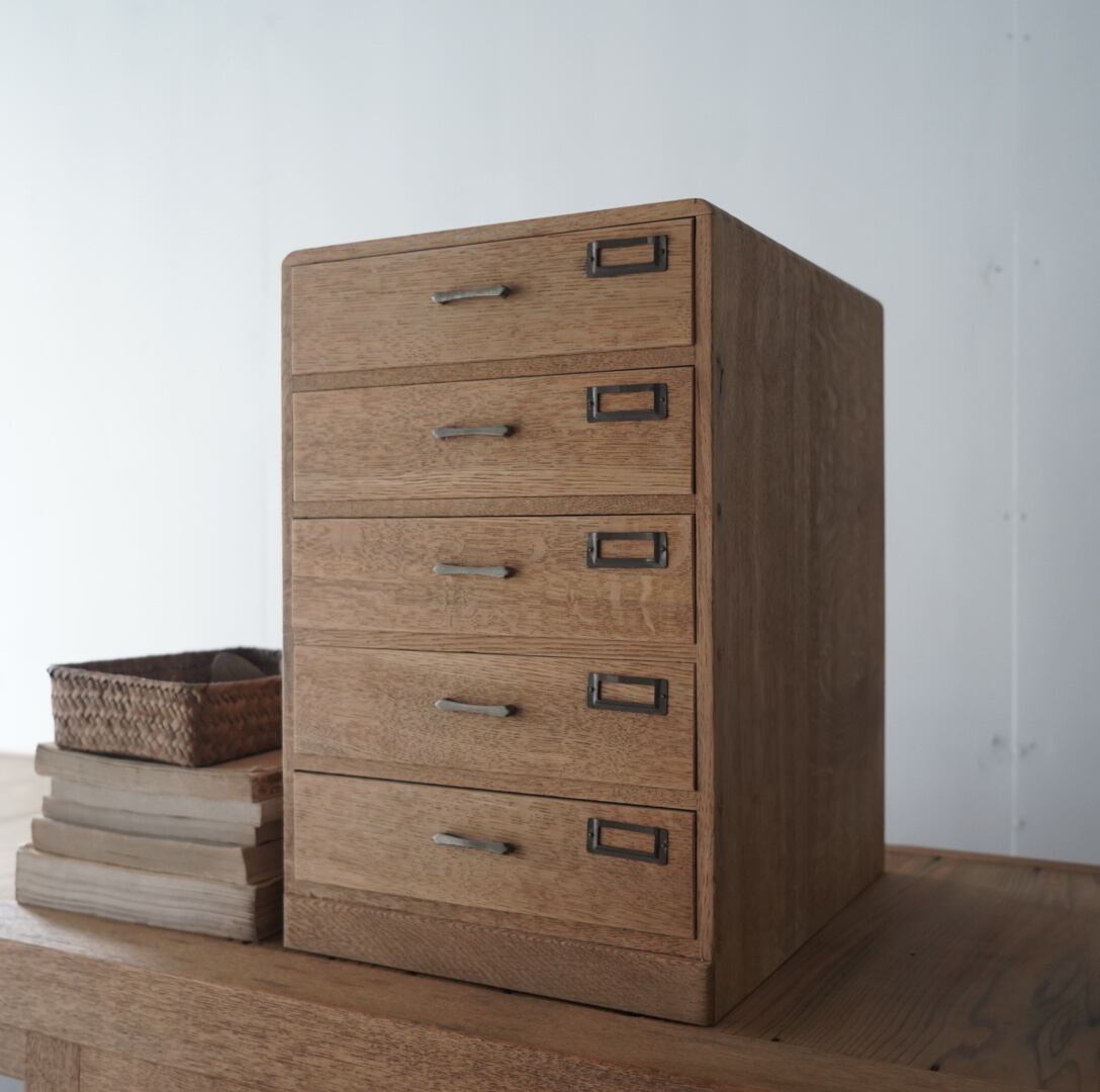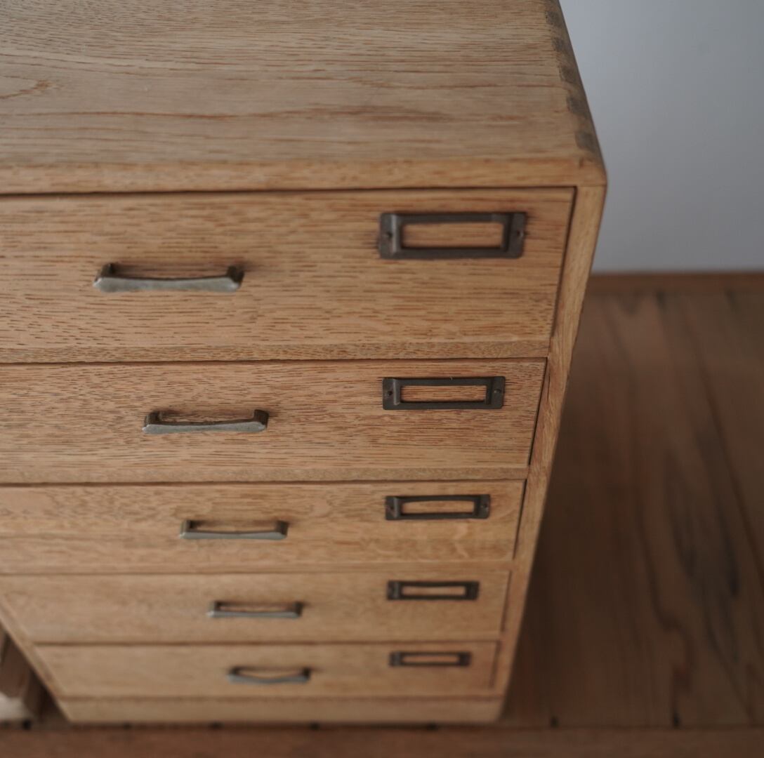 ナチュラルな木味、並んだ金属の取手とネームプレートが可愛らしい5杯の引き出し。
