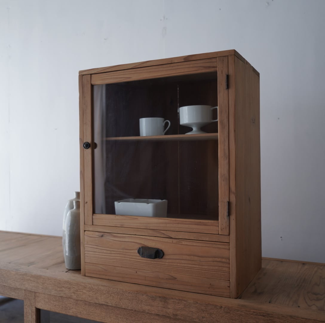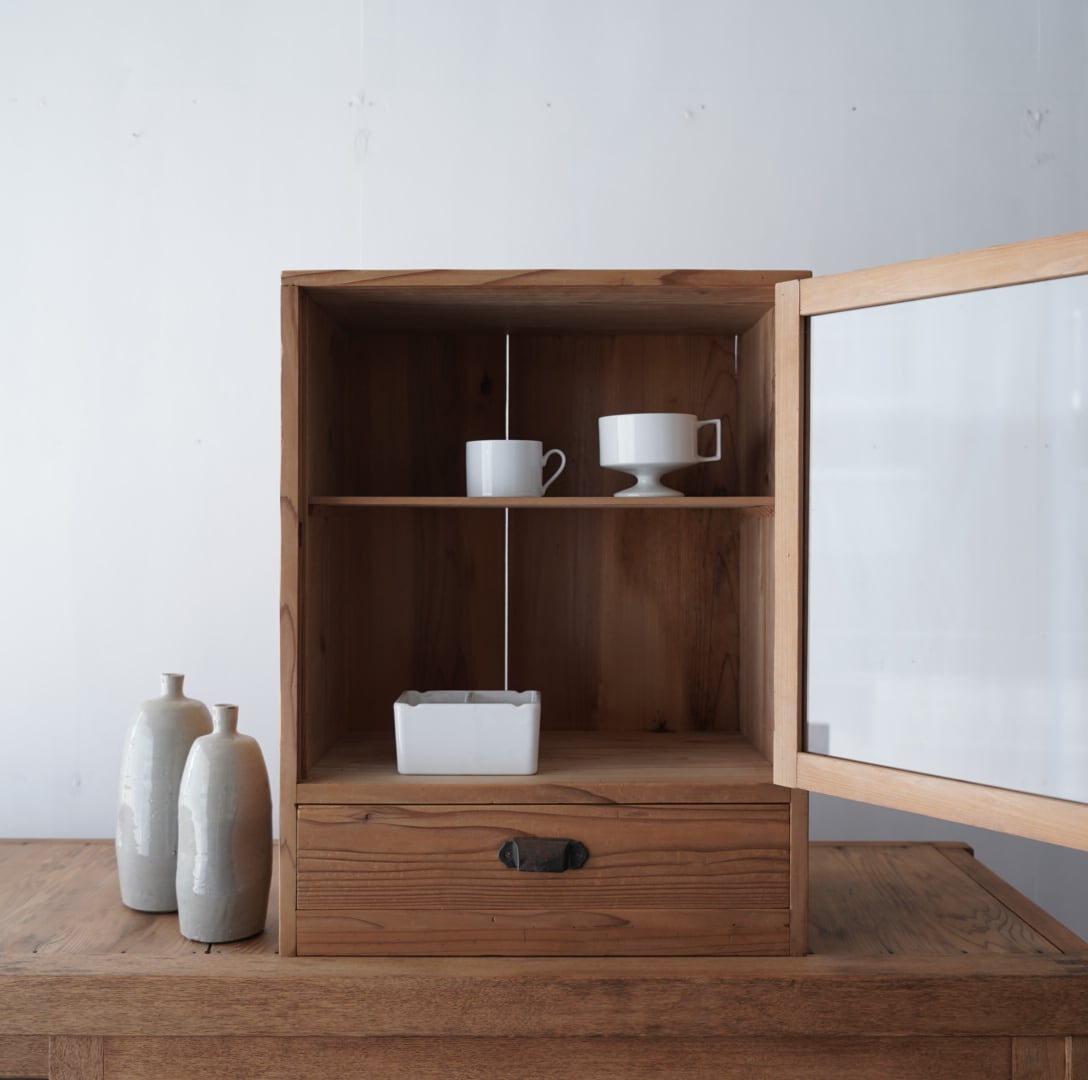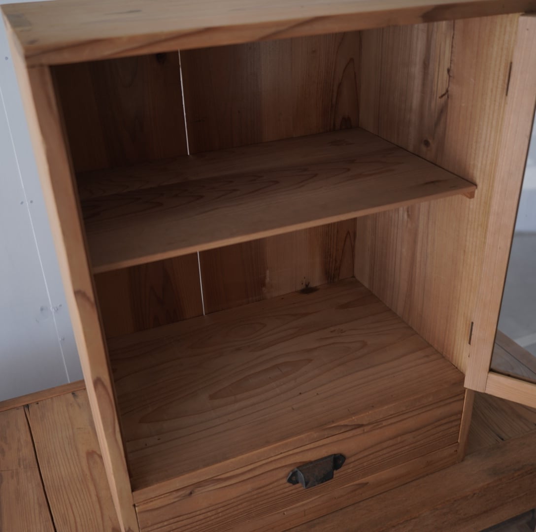 古い無垢材の素朴な風合いとすっきり大きなガラスの開き戸が美しいキャビネット。