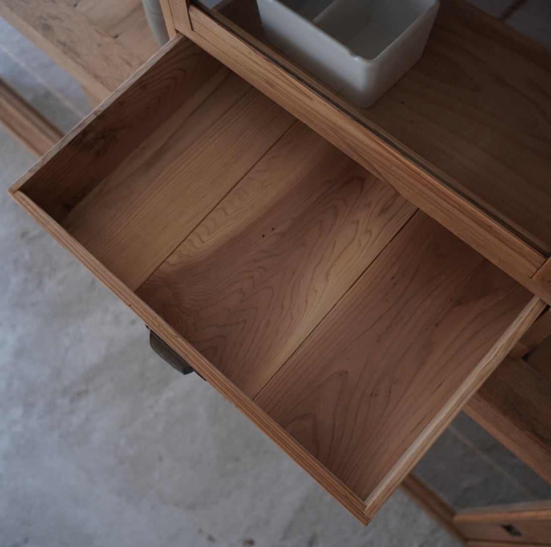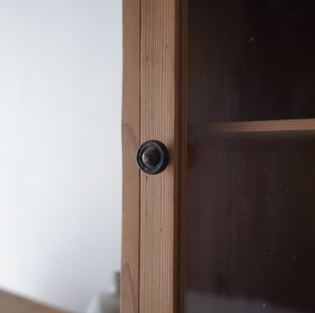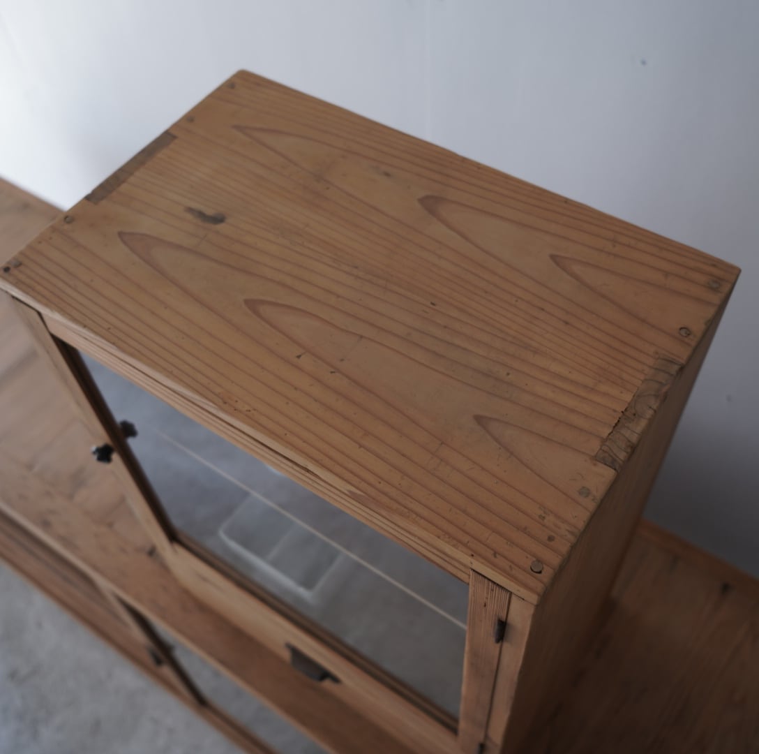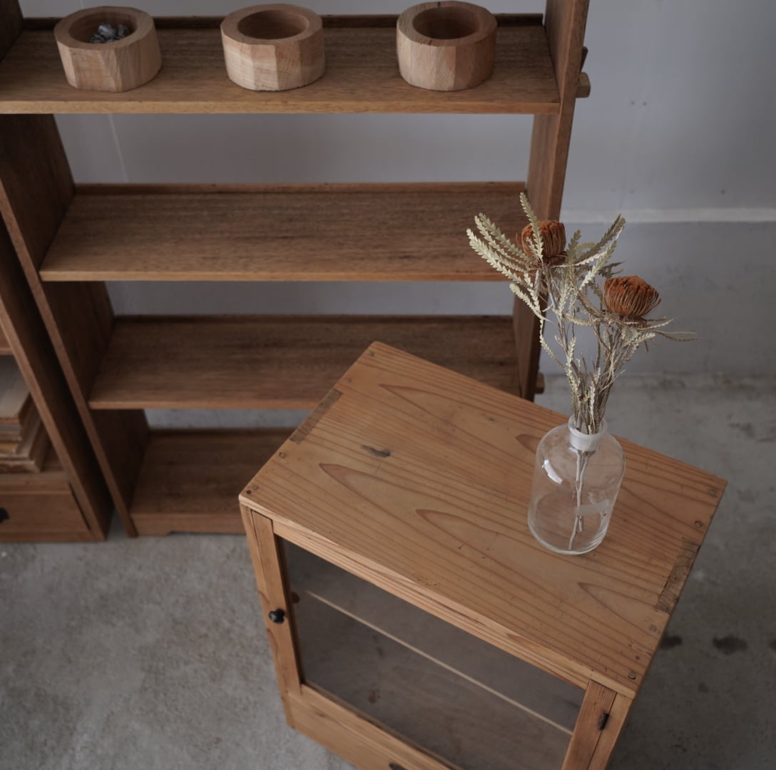 古い無垢材の素朴な風合いとすっきり大きなガラスの開き戸が美しいキャビネット。