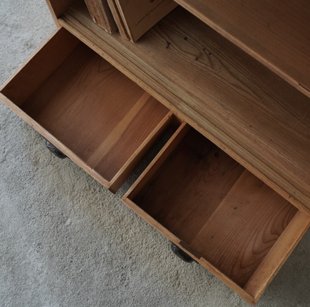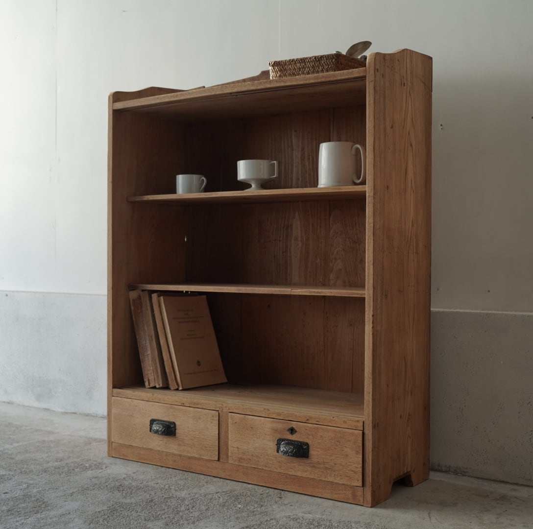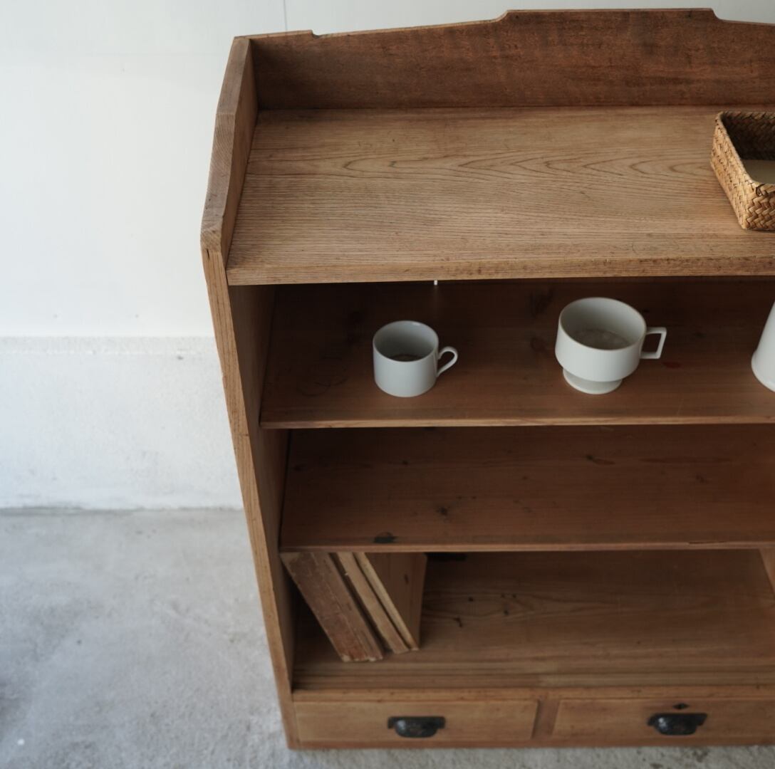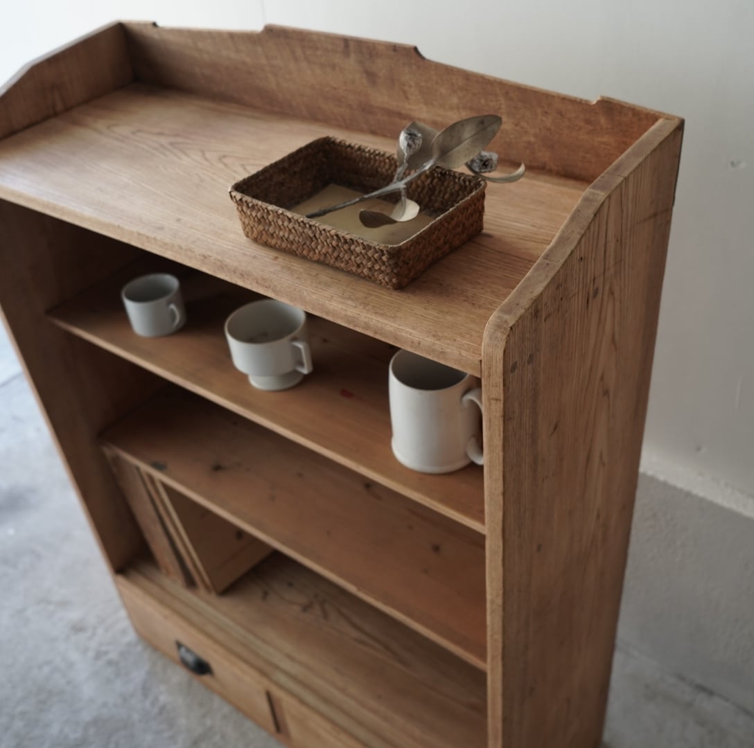 古い無垢材の素朴な風合いと装飾取手の引き出しが美しい木製棚。