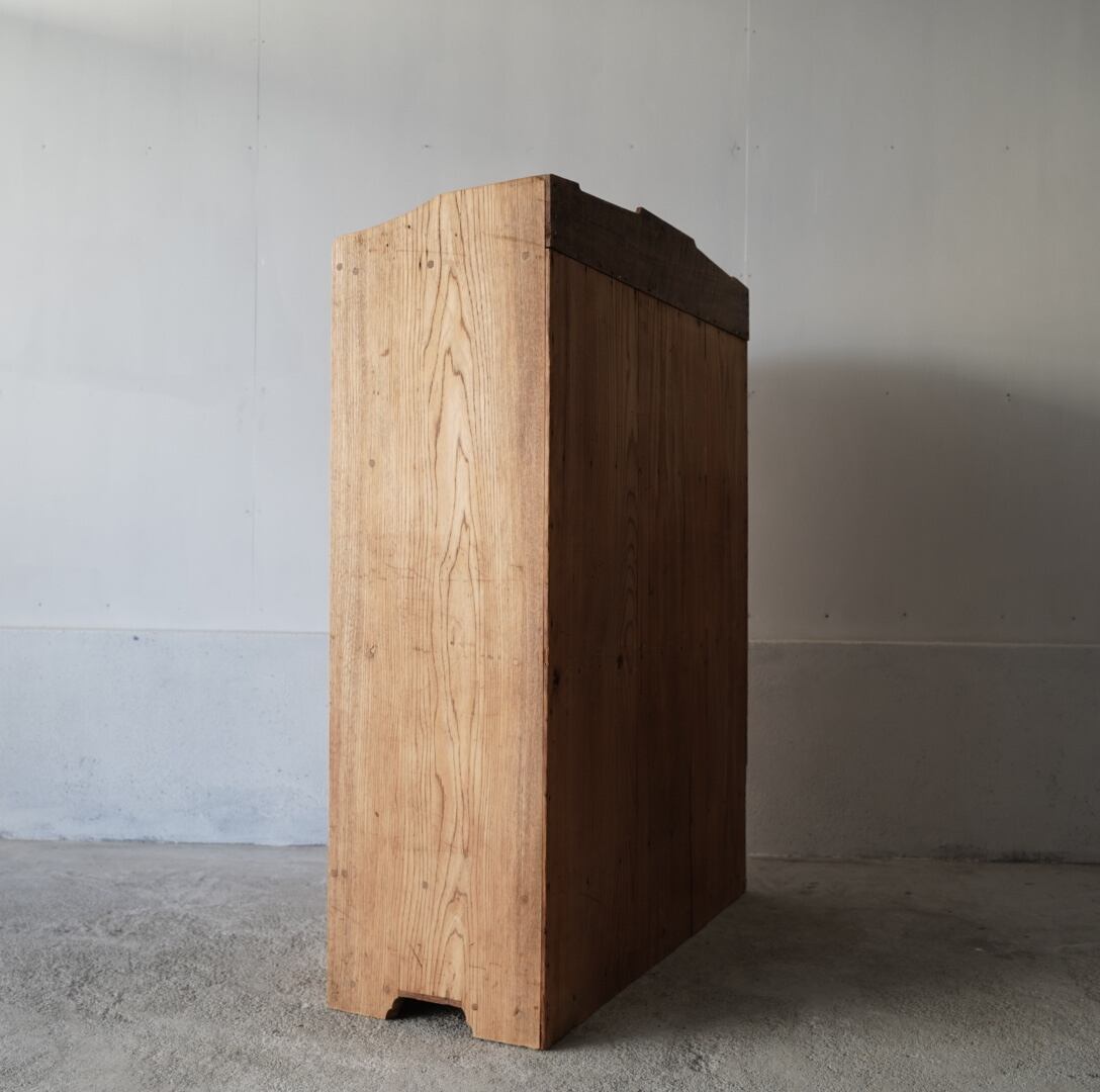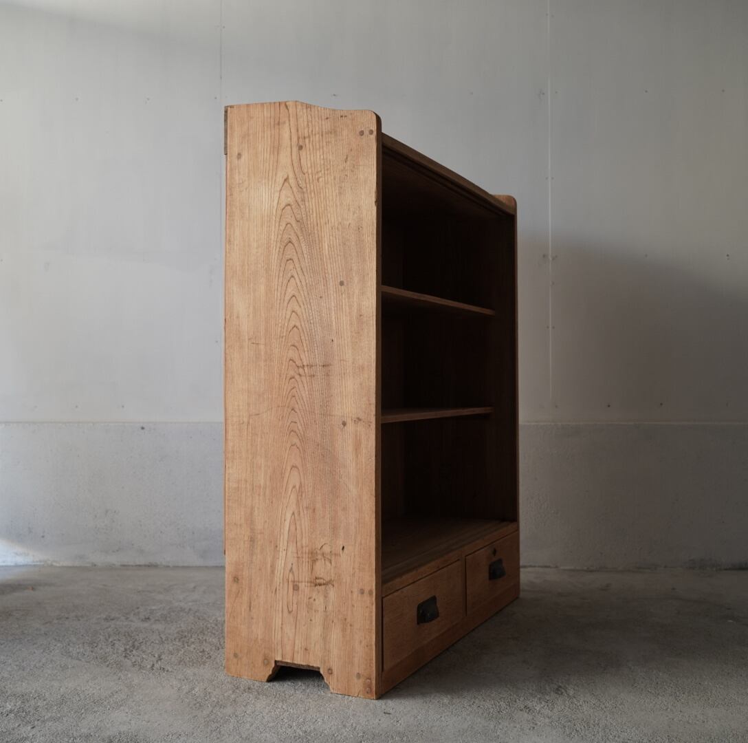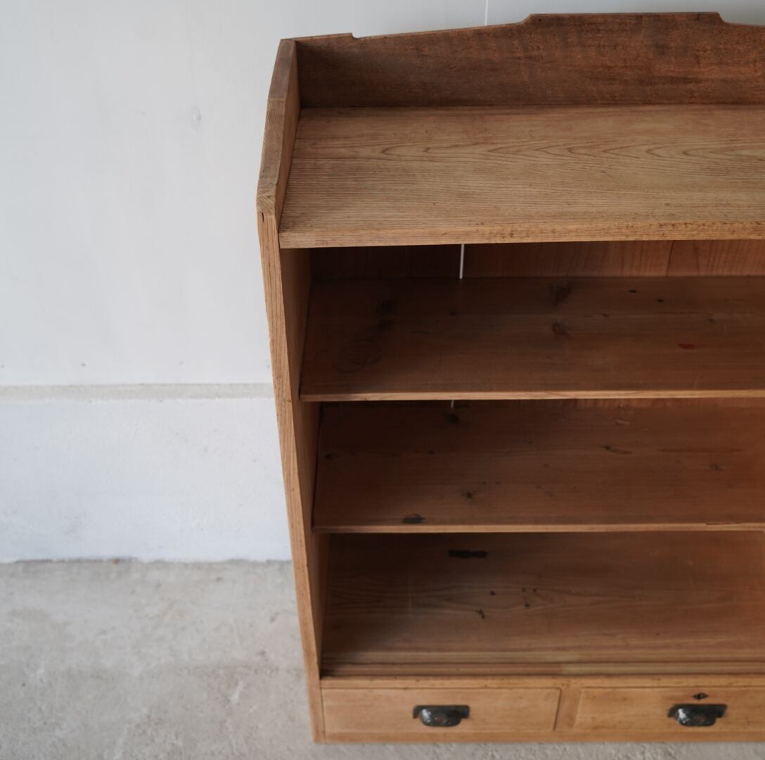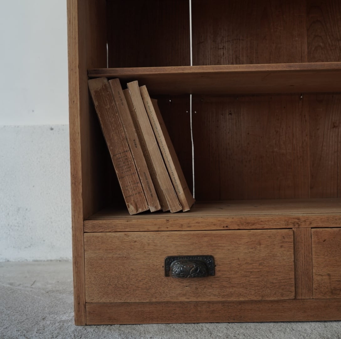 古い無垢材の素朴な風合いと装飾取手の引き出しが美しい木製棚。
