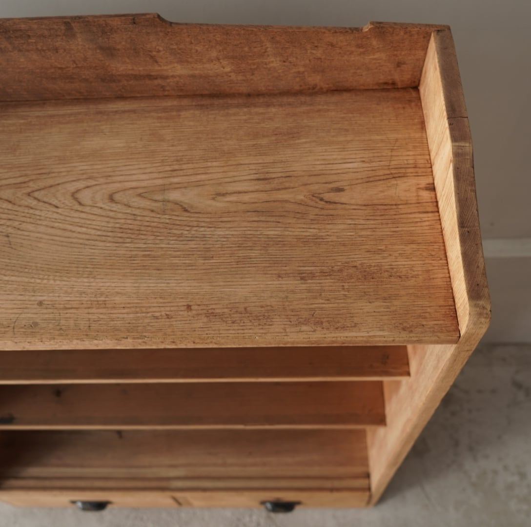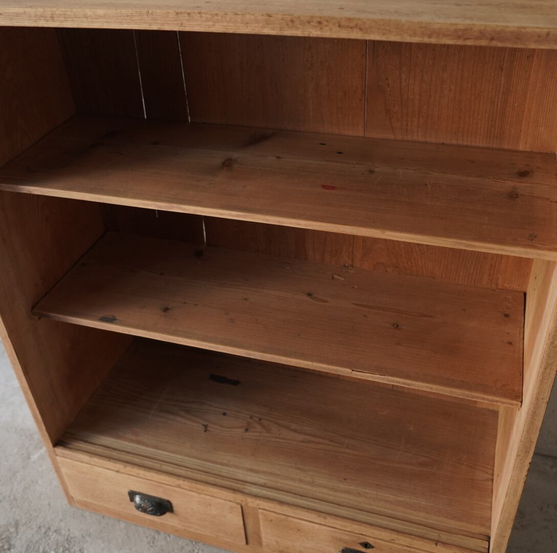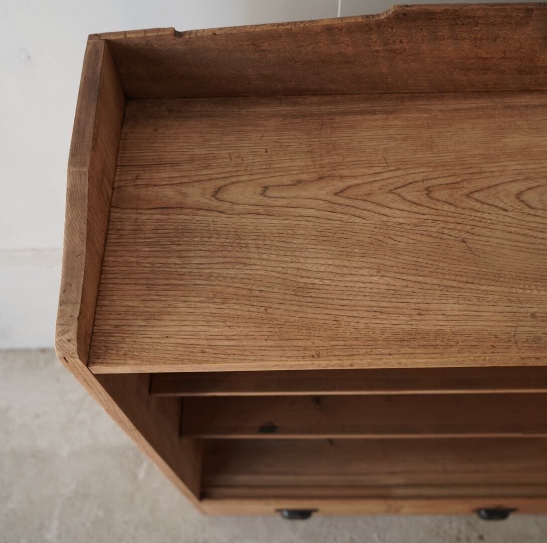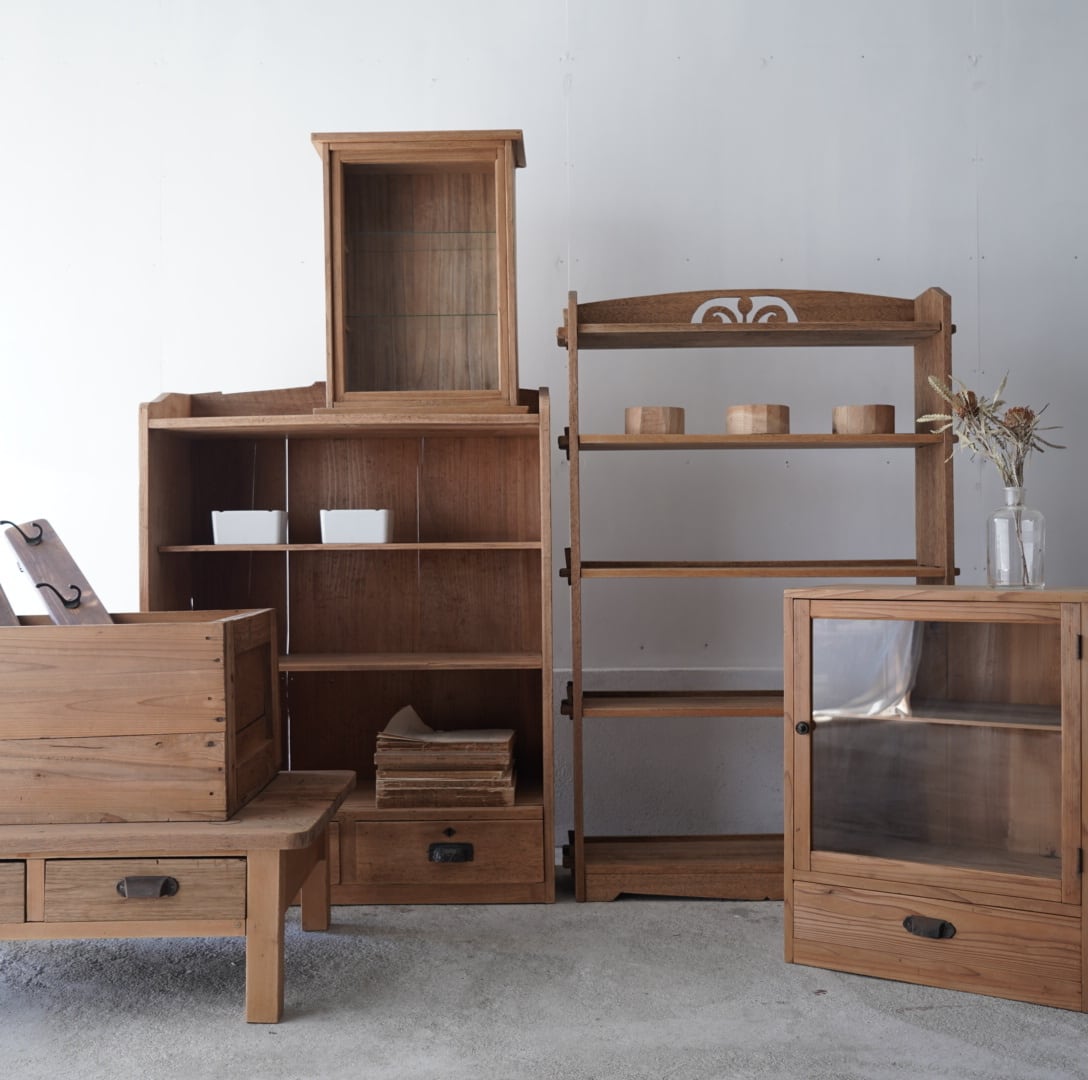古い無垢材の素朴な風合いと装飾取手の引き出しが美しい木製棚。