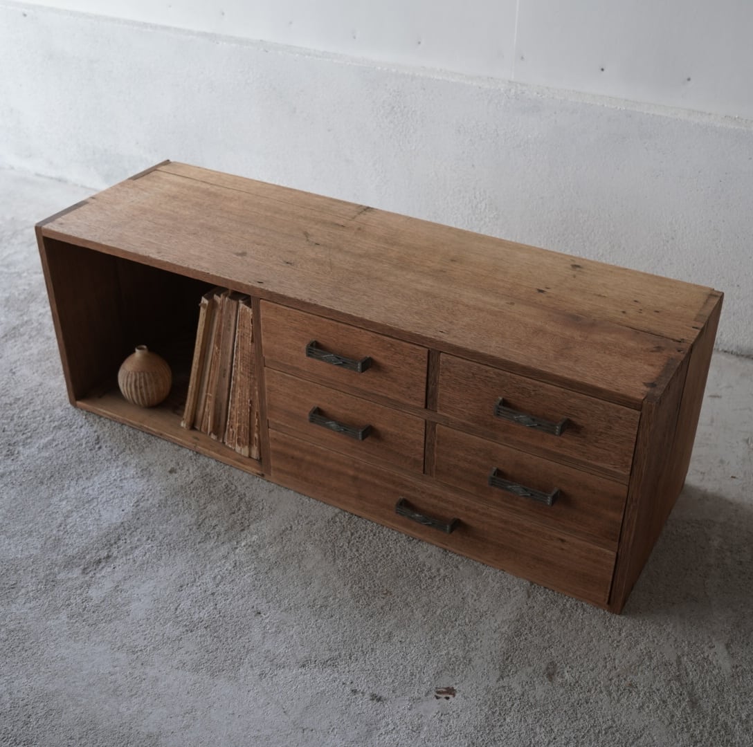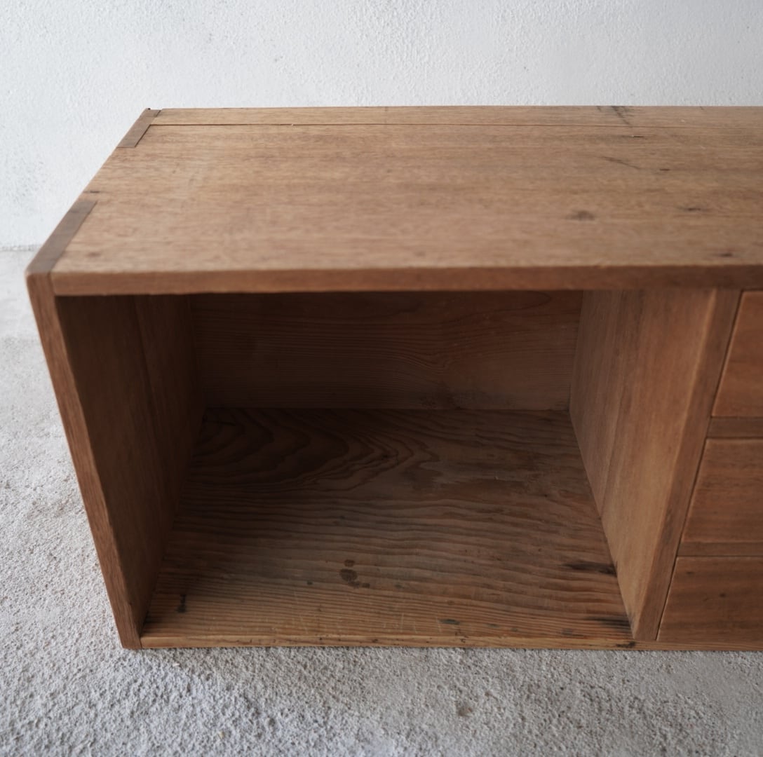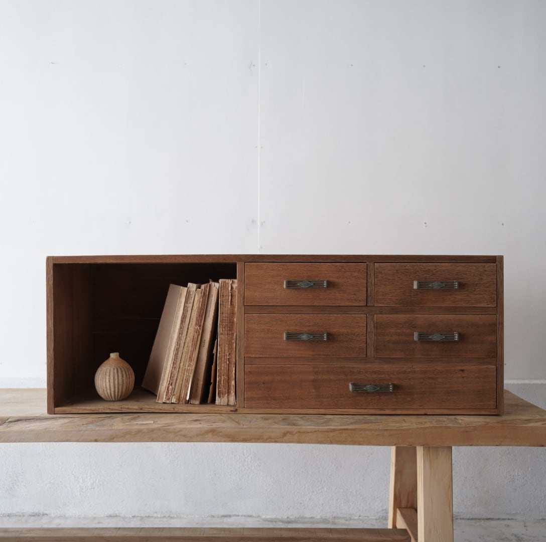 無垢材の素朴な風合いと古いアルミ取手の引き出しが魅力的な収納棚。