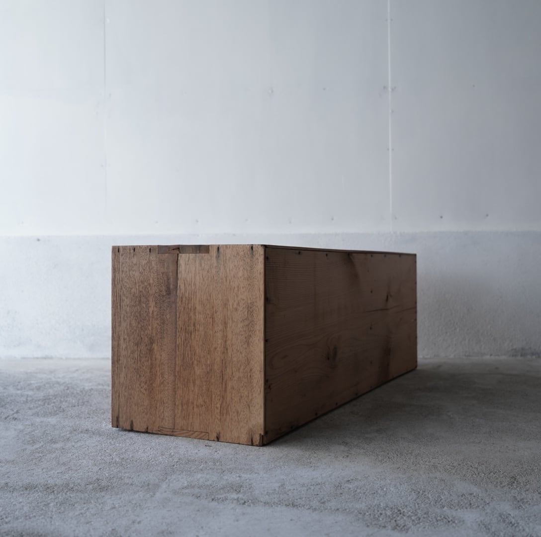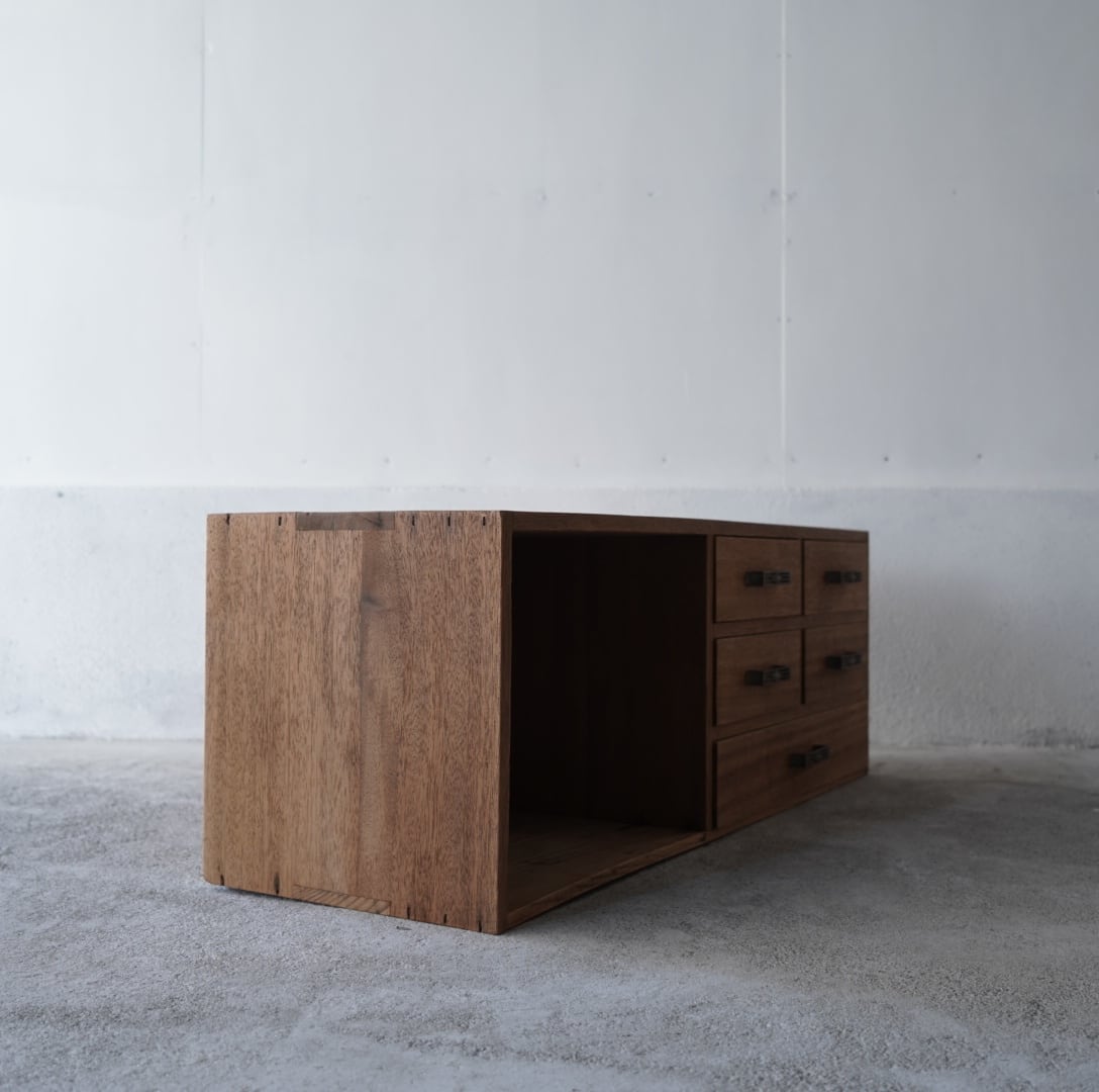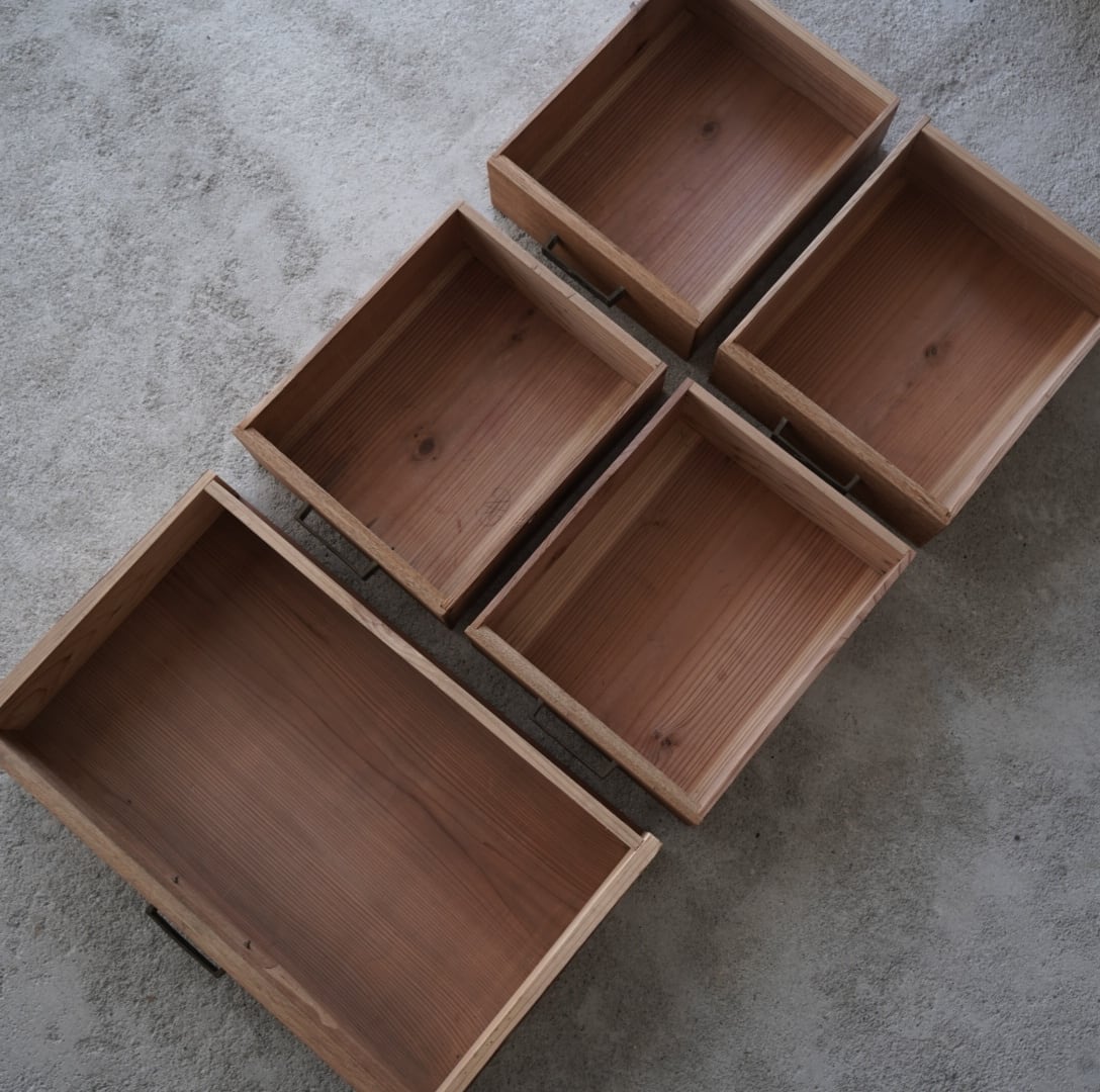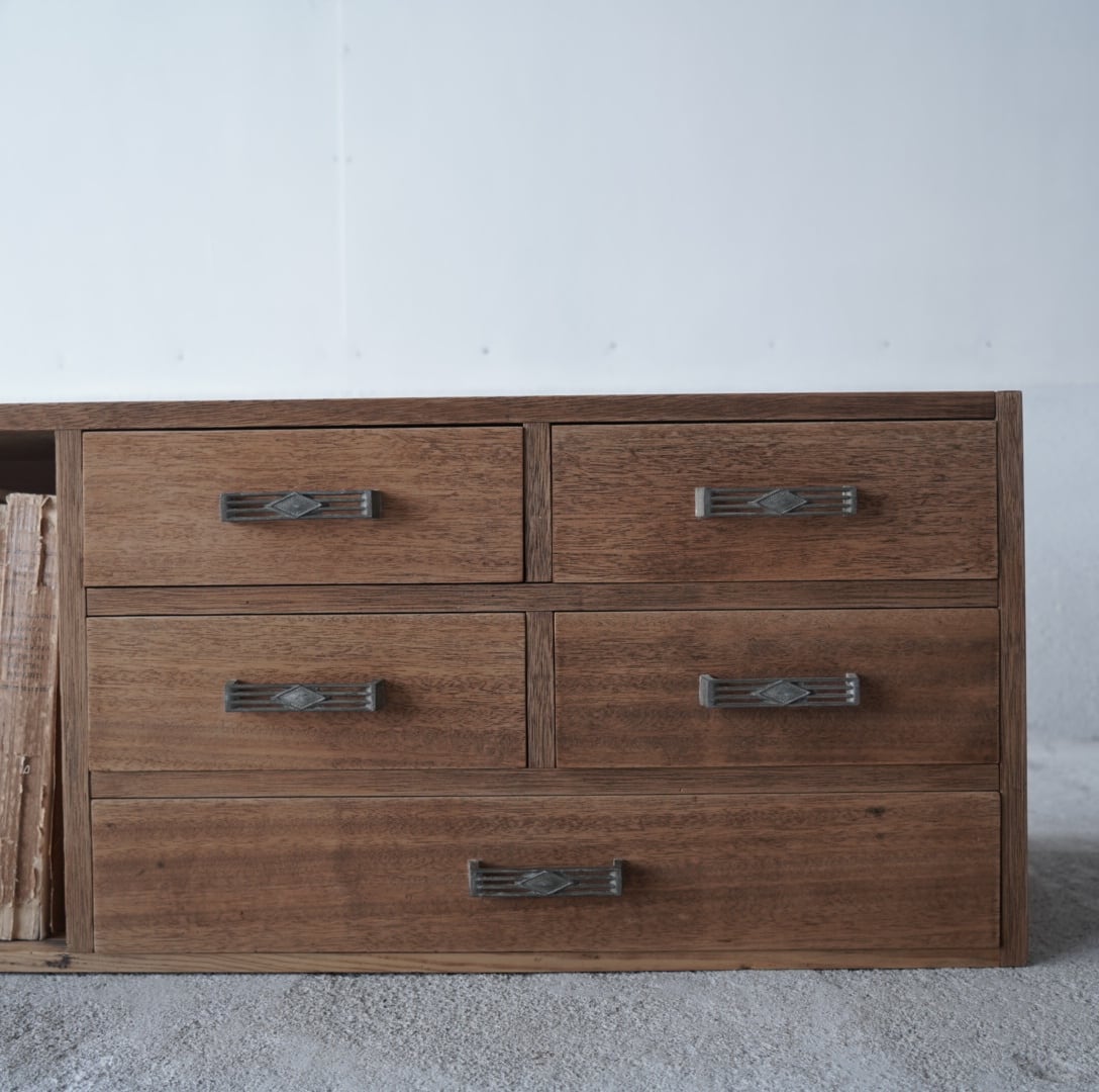 無垢材の素朴な風合いと古いアルミ取手の引き出しが魅力的な収納棚。