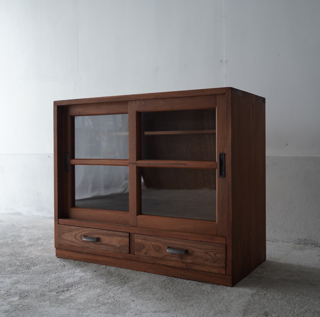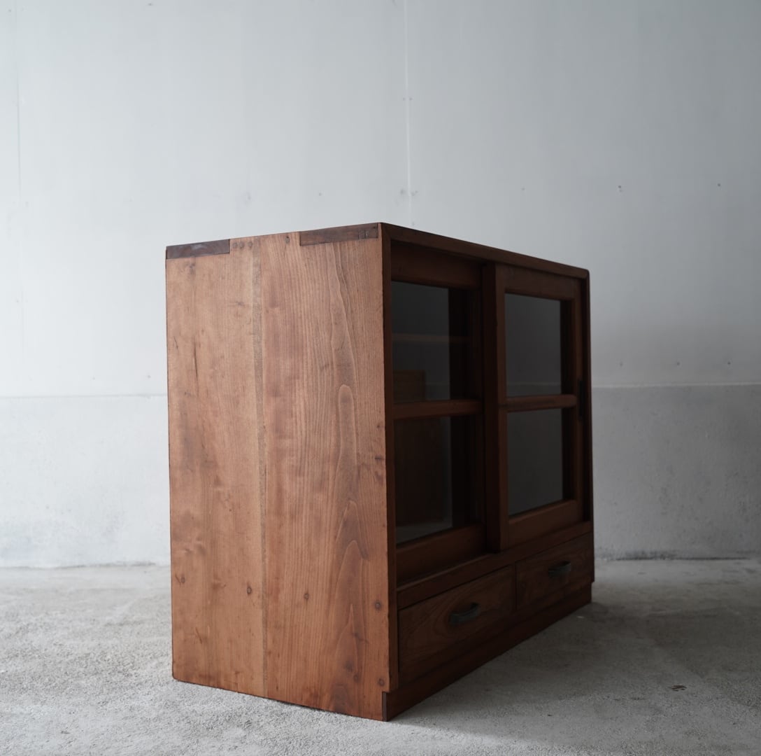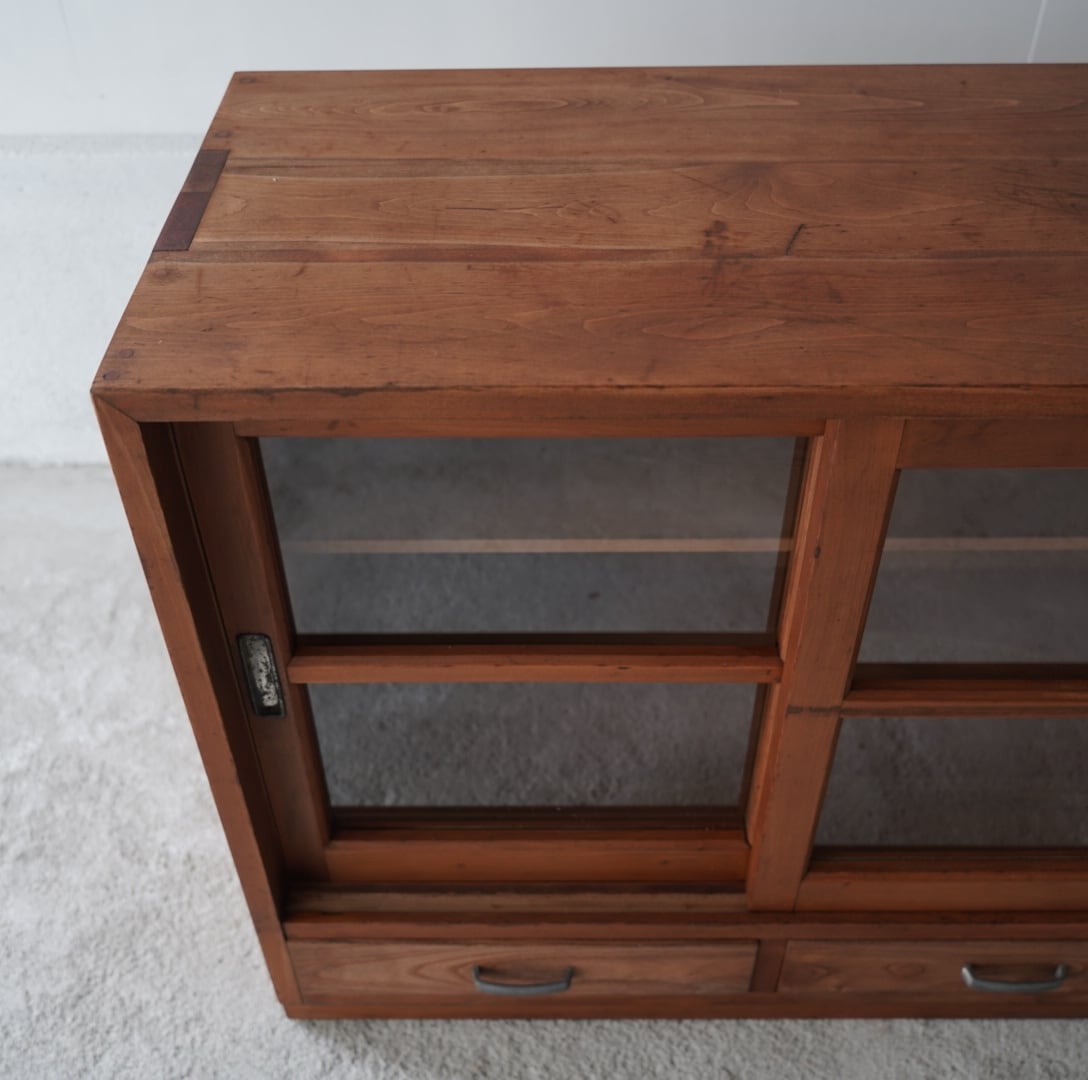 温かみのある木味と格子ガラスの引戸が魅力的なガラス戸棚。