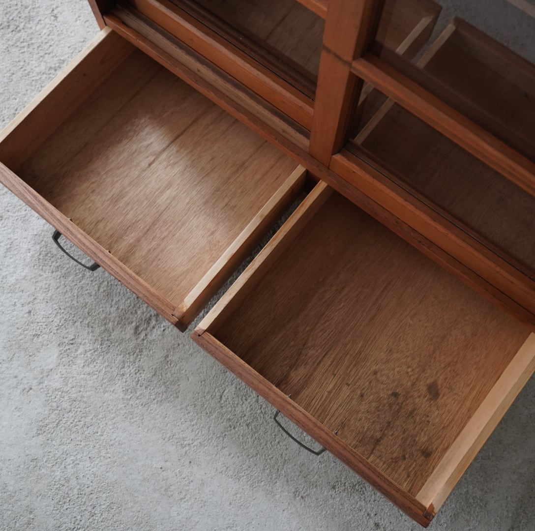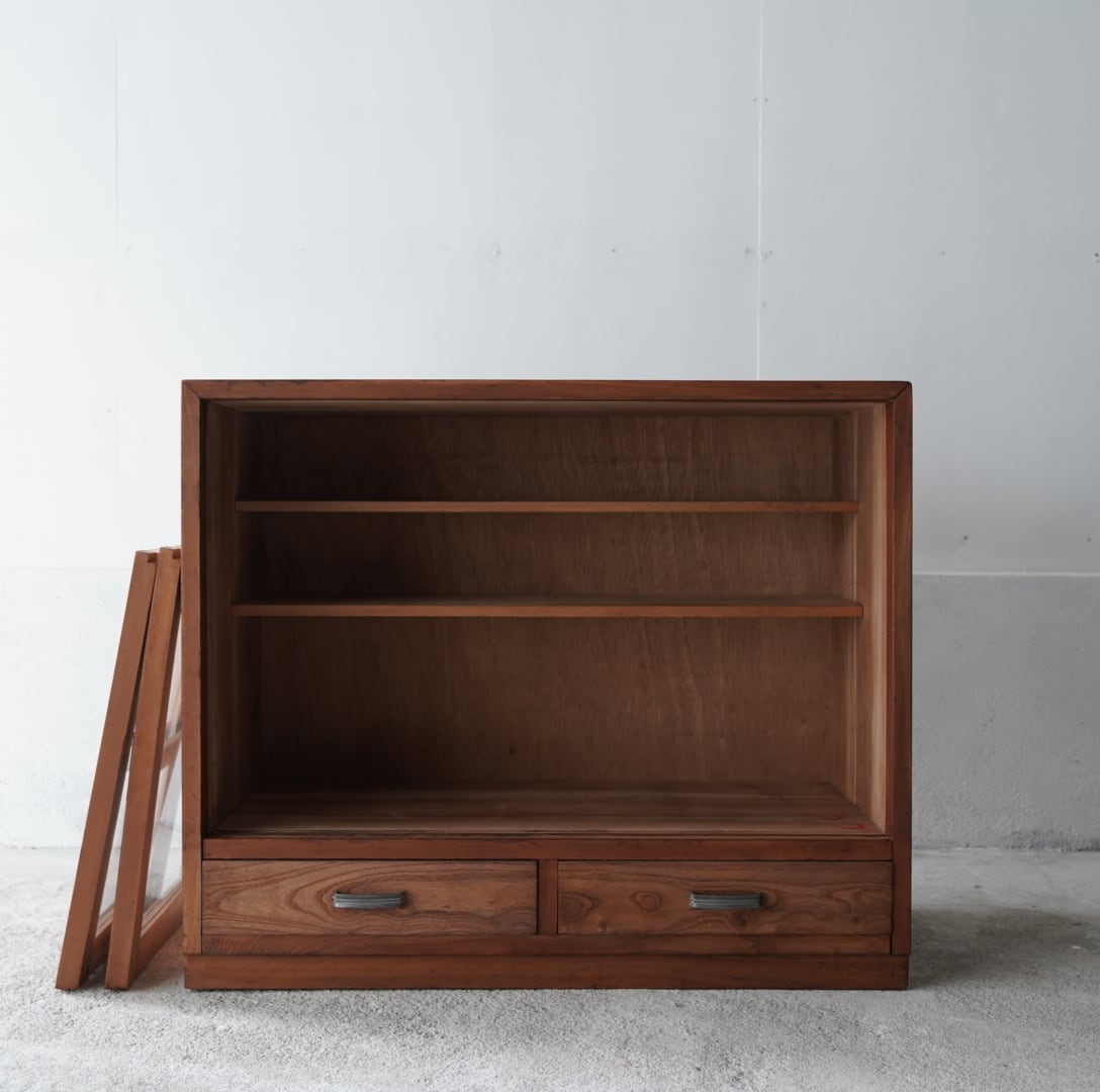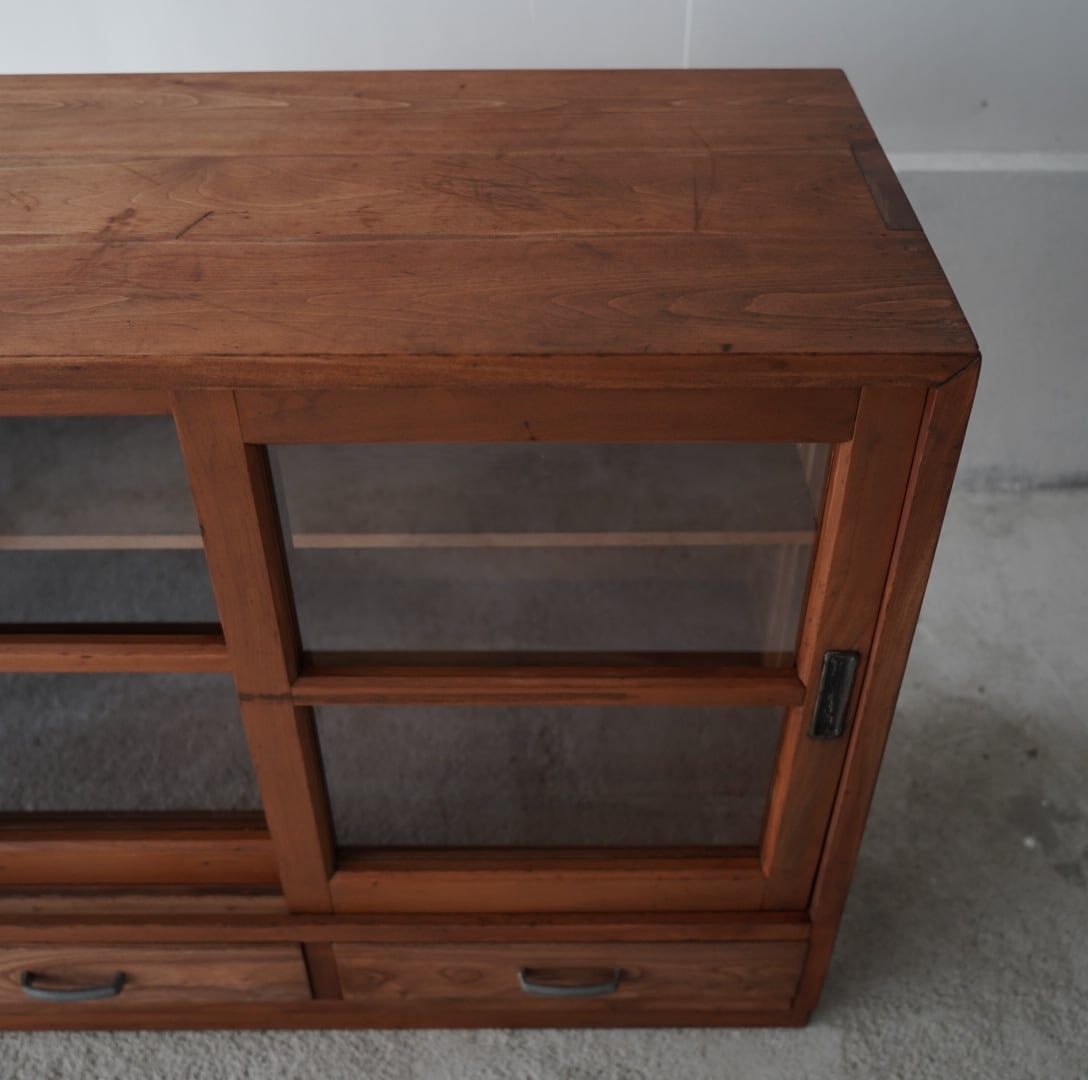 温かみのある木味と格子ガラスの引戸が魅力的なガラス戸棚。