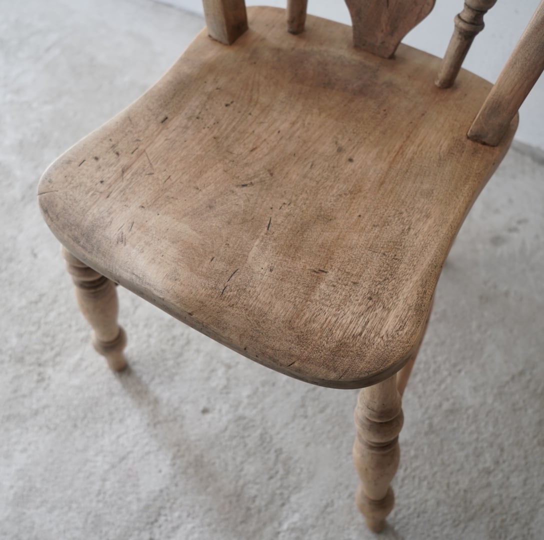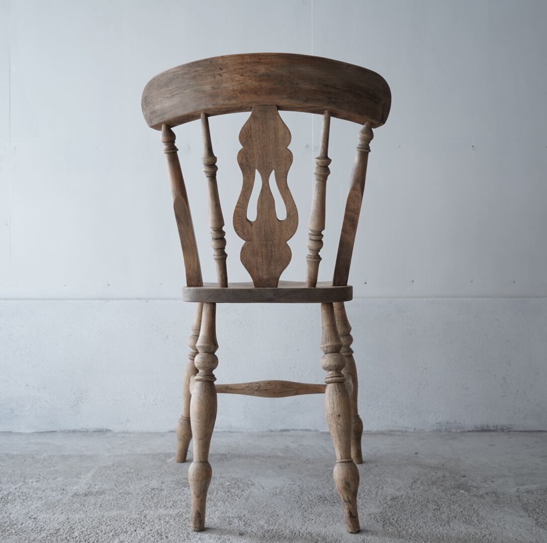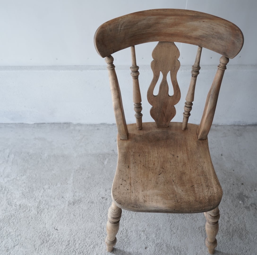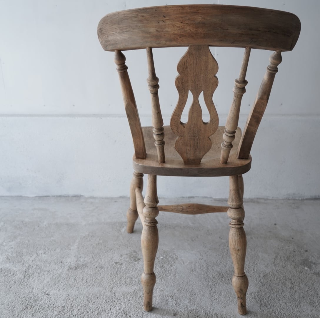 無垢材のナチュラルな木味と背もたれにあしらわれた弦楽器フィドルのモチーフが美しいアンティークチェア。